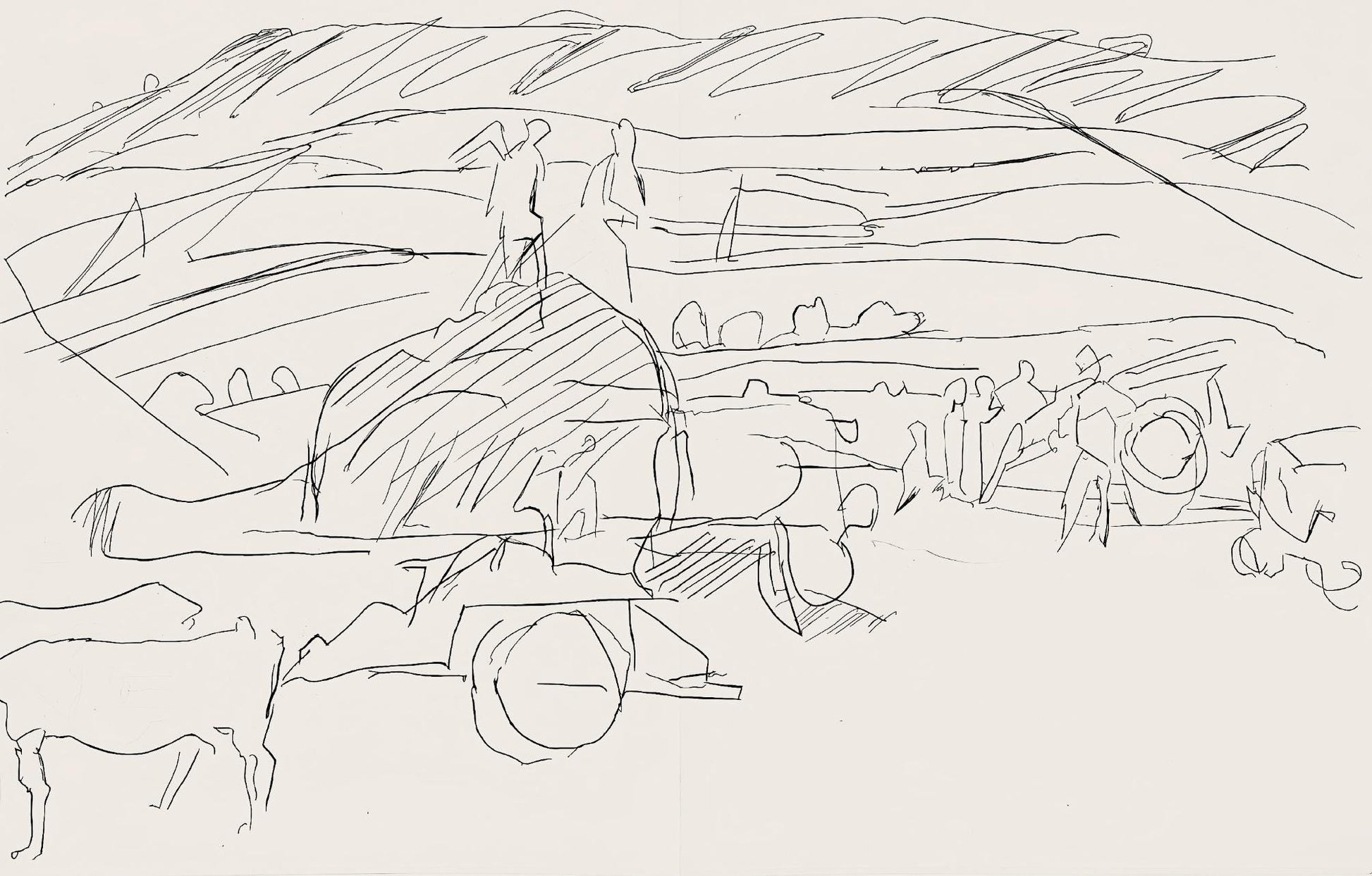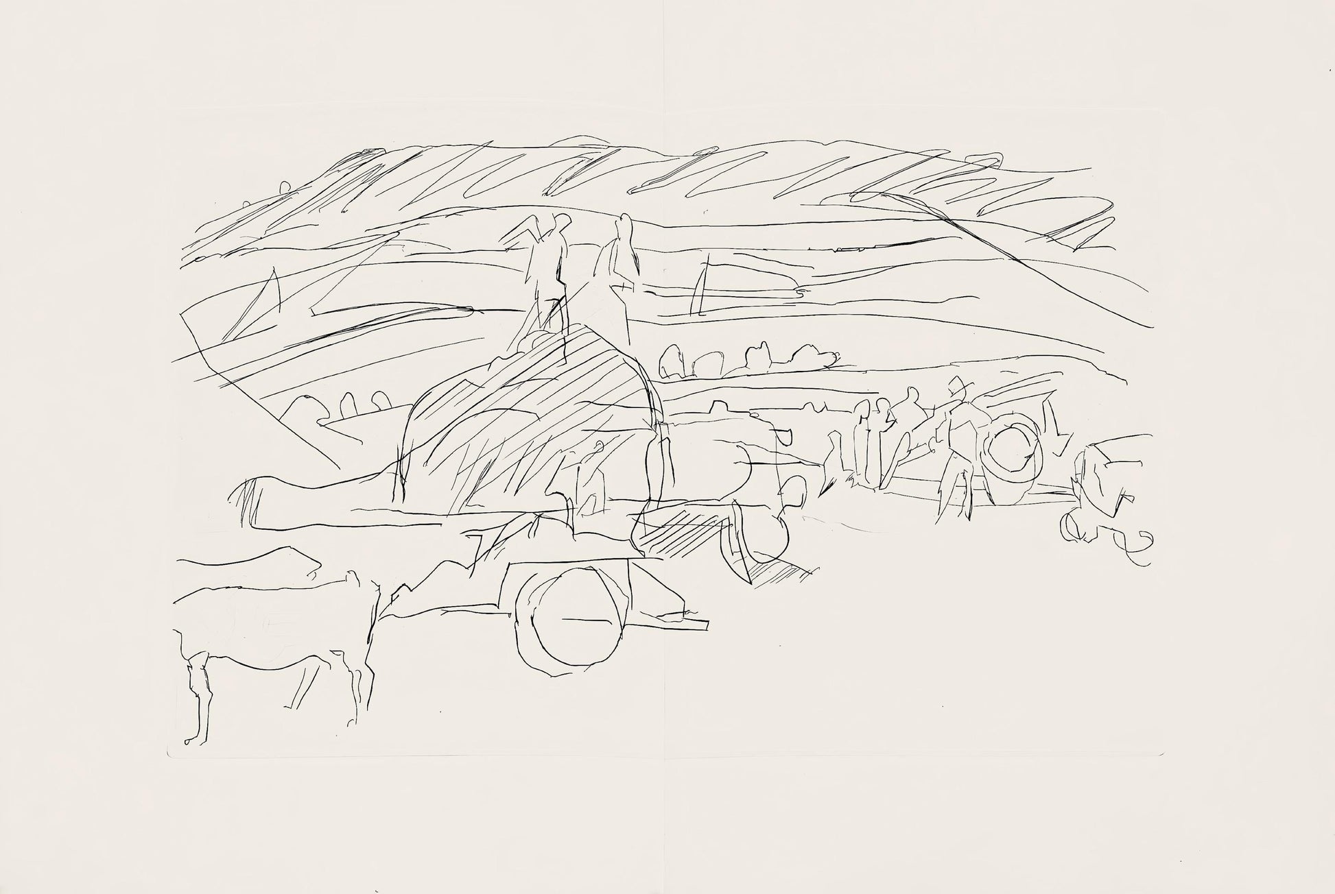 Etching on vlin de Rives paper. Paper size: 15.75 x 24 inches. Excellent condition, with centerfold, as issued. Unsigned and unnumbered, as issued. Notes: From the folio, Hsiode, Les Travaux et les jours. Eaux-fortes de Jacques Villon, 1962. Published by les ditions de la Revue Verve, Paris, under the direction of Triade, diteur, Paris; printed by Atelier Georges Leblanc, Paris, July 20, 1962. Excerpted from the volume (translated from French), This portfolio, "The works and the days" of Hsiode, according to the translation of E. Bergougnan, is illustrated with nineteen original etchings in black and four original etchings in colors of Jacques Villon. The fifteen double-page etchings, including three in color, as well as the frontispiece in color, were drawn by les Ateliers Crommelynck, the seven single-page etchings in black by Georges Leblanc. All coppers were scratched after print. The Romain De L'universit Corps Vingt-Quatre was composed by hand and printed by L'Imprimerie nationale under the guidance of Georges Arnoult. This book was completed to print for les ditions Verve on July 20, 1962. This portfolio was drawn in one hundred and eighty examples on vlin de Rives, numbered from 1 to 180, and twenty examples reserved for employees numbered from I to XX, all signed by Jacques Villon. It was also drawn sixty suites including all the boards of the portfolio, numbered and signed by the artist.
