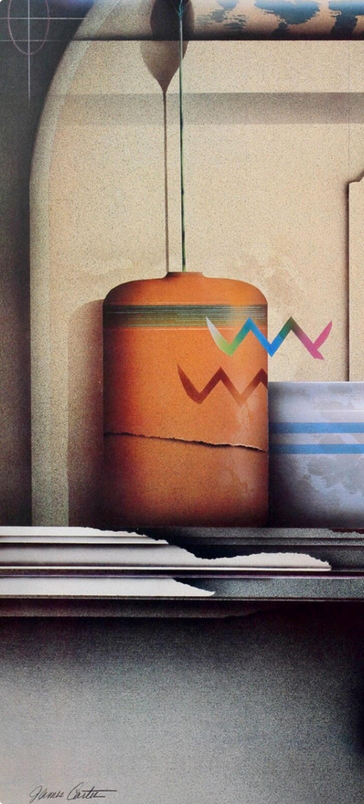 JAMES CARTER (1948), the contemporary American artist combines the dream images of surrealism with the techniques of super-realism to create still-lifes with distinctly American roots. His acrylic with airbrush paintings and serigraphs give us a fresh view of familiar situations. There is draftsman-like element to many of Carter's compositions. His complex subtle use of color and interplay of light and shadows is important in his work. During his career, Carter has built an impressive body of work and has received numerous awards and honors. His works have been exhibited widely and are included in major collections.