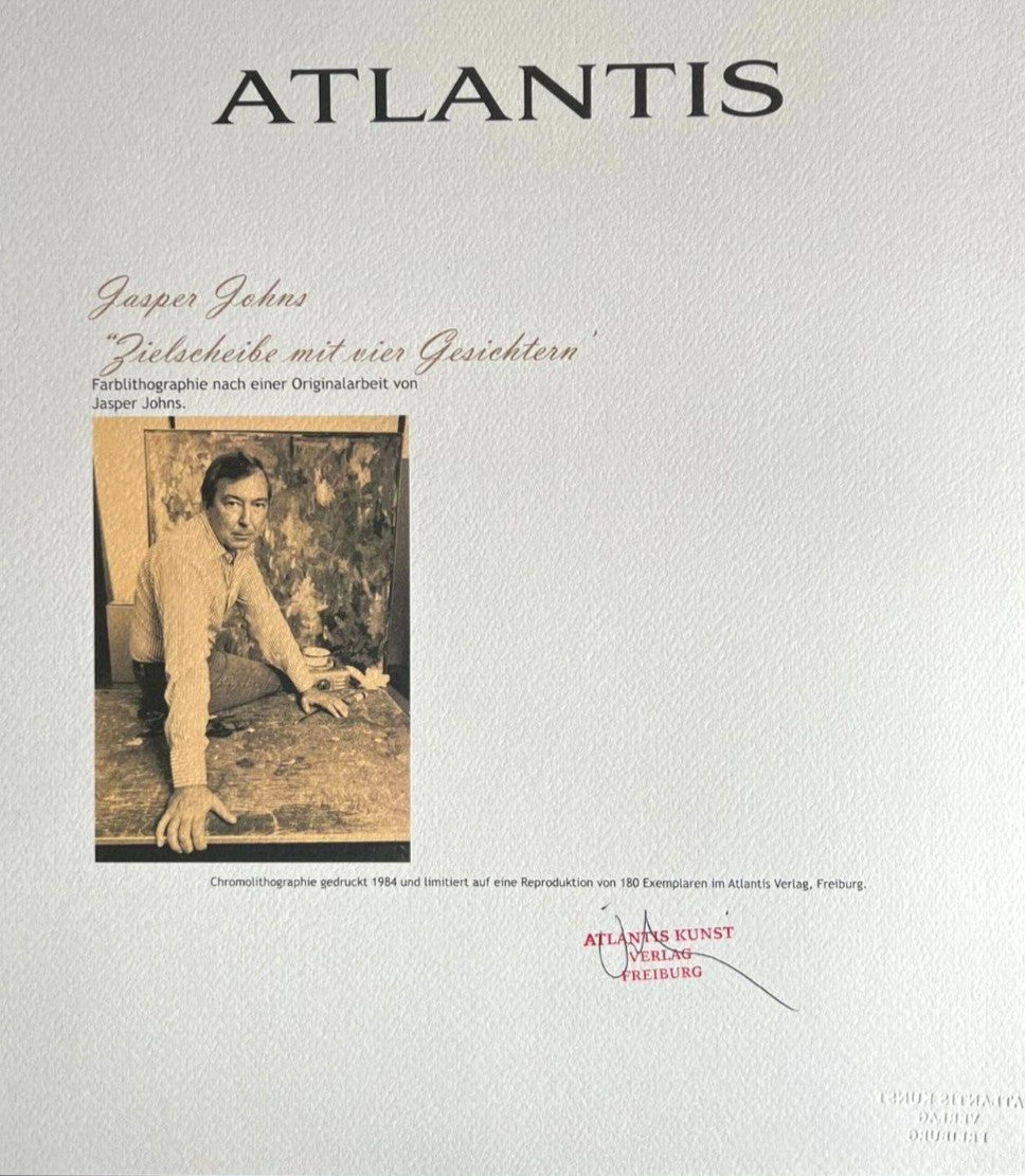 Jasper Johns Lithograph COA Signed Op Numbered Limited Edition In 180Es Jasper Johns " Target with four faces " Chromolithography printed in 1984 in 180 specimens by Atlantis Verlag, Freiburg 32 x 43 cm Signature Jasper Johns on the slab Dry and authentic stamp of the publishing house The progressive number could be different from the published one. Atlantis Kunst Verlag Freiburg Jasper Johns "Target with four faces" Chromolithography printed in 1984 in 180 specimens by Atlantis Verlag, Freiburg 32 x 43 cm Signature Jasper Johns on the slab Dry and authentic stamp of the publishing house The progressive number could be different from the published one. Atlantis Kunst Verlag Freiburg