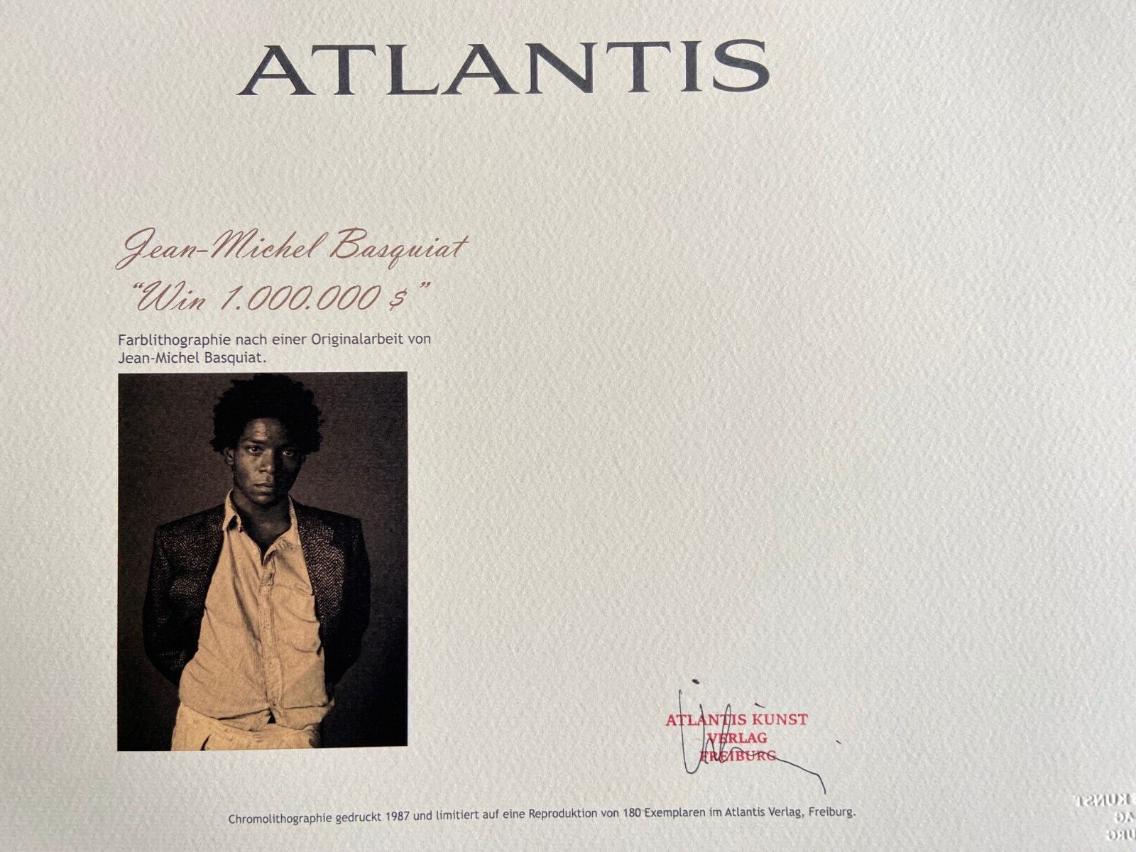Jean-Michel Basquiat Lithograph Signed Numbered. Joan Mir Jean-Michel Basquiat " Win 1,000,000 $ " Chromolithograph printed in 1987 in 180 copies by Atlantis Verlag, Freiburg 32 x 48 cm Jean-Michel Basquiat signature on the plate Dry and authentic stamp of the publishing house Atlantis Kunst Verlag Freiburg Jean-Michel Basquiat "Win 1,000,000 $" Chromolithograph printed in 1987 in 180 copies by Atlantis Verlag, Freiburg 32 x 48 cm Jean-Michel Basquiat signature on the plate Dry and authentic stamp of the publishing house Atlantis Kunst Verlag Freiburg