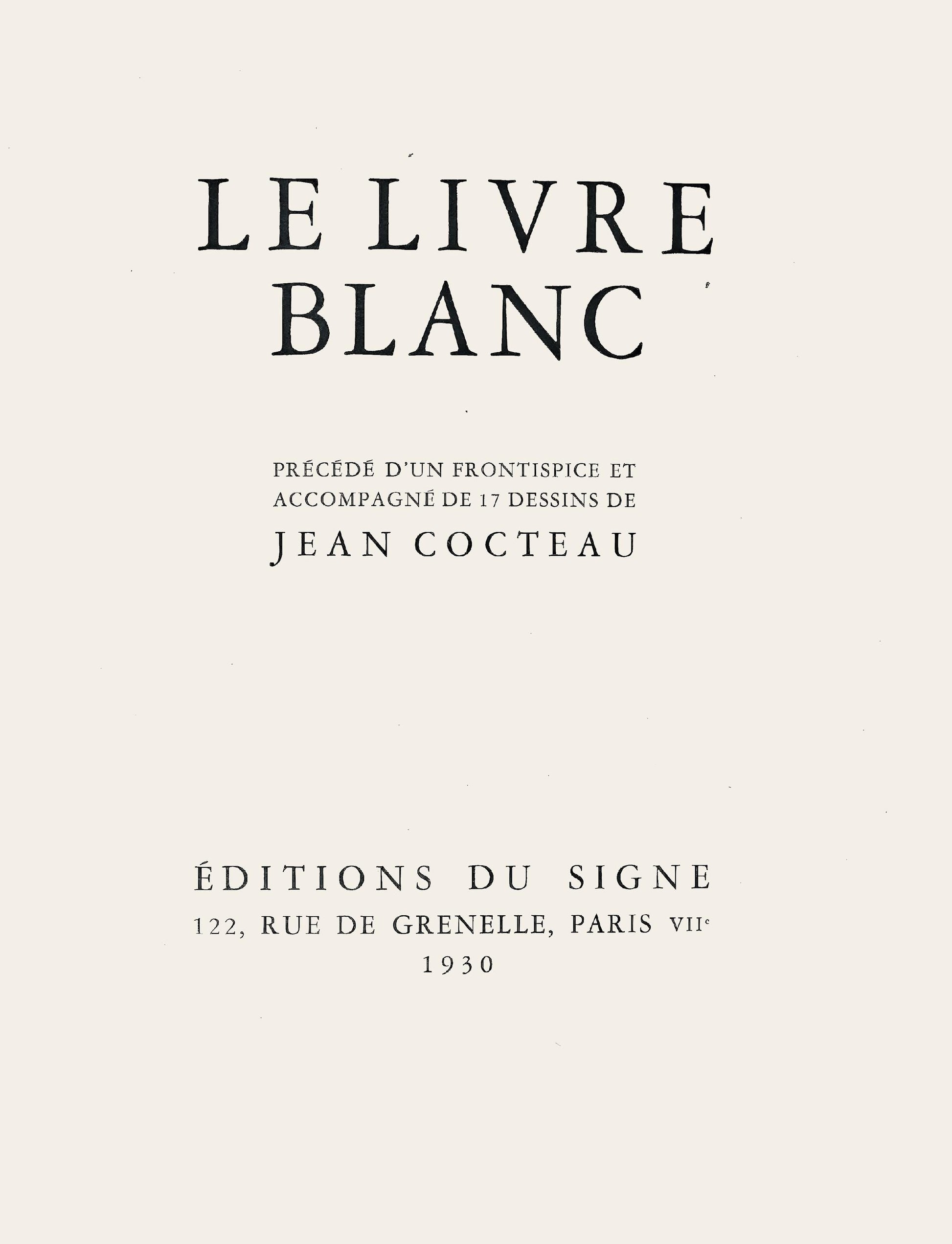 A BRIEF HISTORY OF LE LIVRE BLANC: Excerpted from the Royal Library of the Netherlands, The first edition of Le livre blanc appeared in 1928, under the copyright of Maurice Sachs and Jacques Bonjean in Paris. Pascal Pia, the author of a bibliography of the erotic collection of the Bibliothque nationale de France, wrote that the editors received the book without its creators name or address. But Pia recognized the names of Sachs and Bonjean in the initials on the title page, making this an official publication of Les Quatre Chemins, which had already published another book by Cocteau that same year: Le mystre lac. (Cocteau had a hard time with Sachs; Sachs had for instance sold Cocteau's library.) Both gentlemen also played dumb by claiming not to know the author, while the colophon informs us that 10 copies had been reserved for the author, while the total edition consisted of only 31 copies. Pia's suspicions were justified, and after publication, neither Sachs nor Cocteau were very discrete about their involvement. The second edition followed in 1930 under a pseudonym imprint: Editions du Signe, printed on 10 May 1930 by Ducros and Colas in Paris. The drawings were hand-coloured by M.B. Armington. Cocteau wrote Le livre blanc in 1927 in Chablis, where he was staying with Jean Desbordes, the successor to Cocteau's great love. Cocteau's drawings have been described as obscenely pious. They are established by quick, flowing lines, partially erotic and often sultry, featuring classical elements such as busts and centaurs. Erotic images were popular articles in France, where they were sold under the counter; people were extra careful about homosexual erotica. Cocteau described his first sexual experiences in Le livre blanc: his excitement upon seeing a naked peasant boy on horseback and two naked young gypsies on his father's estate. He also wrote about his father, in whom he recognized a homosexual inclination. Some scenes in Le livre blanc refer to Cocteau's love for Desbordes, others to the adventures of Maurice Sachs. Neither man was to survive World War II: Desbordes was tortured to death by the Gestapo, while Maurice Sachs played an enigmatic double role during the war, and subsequently disappeared.