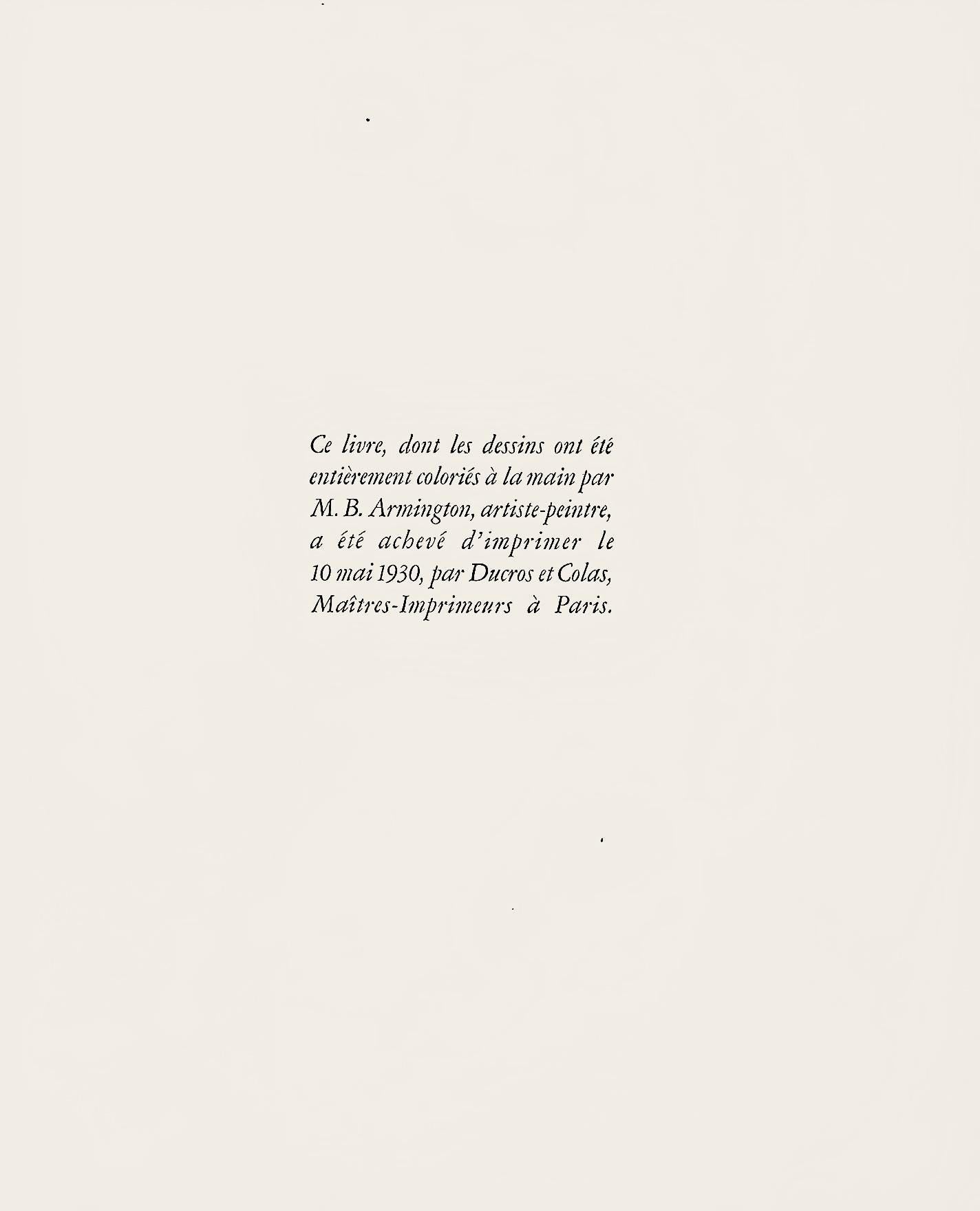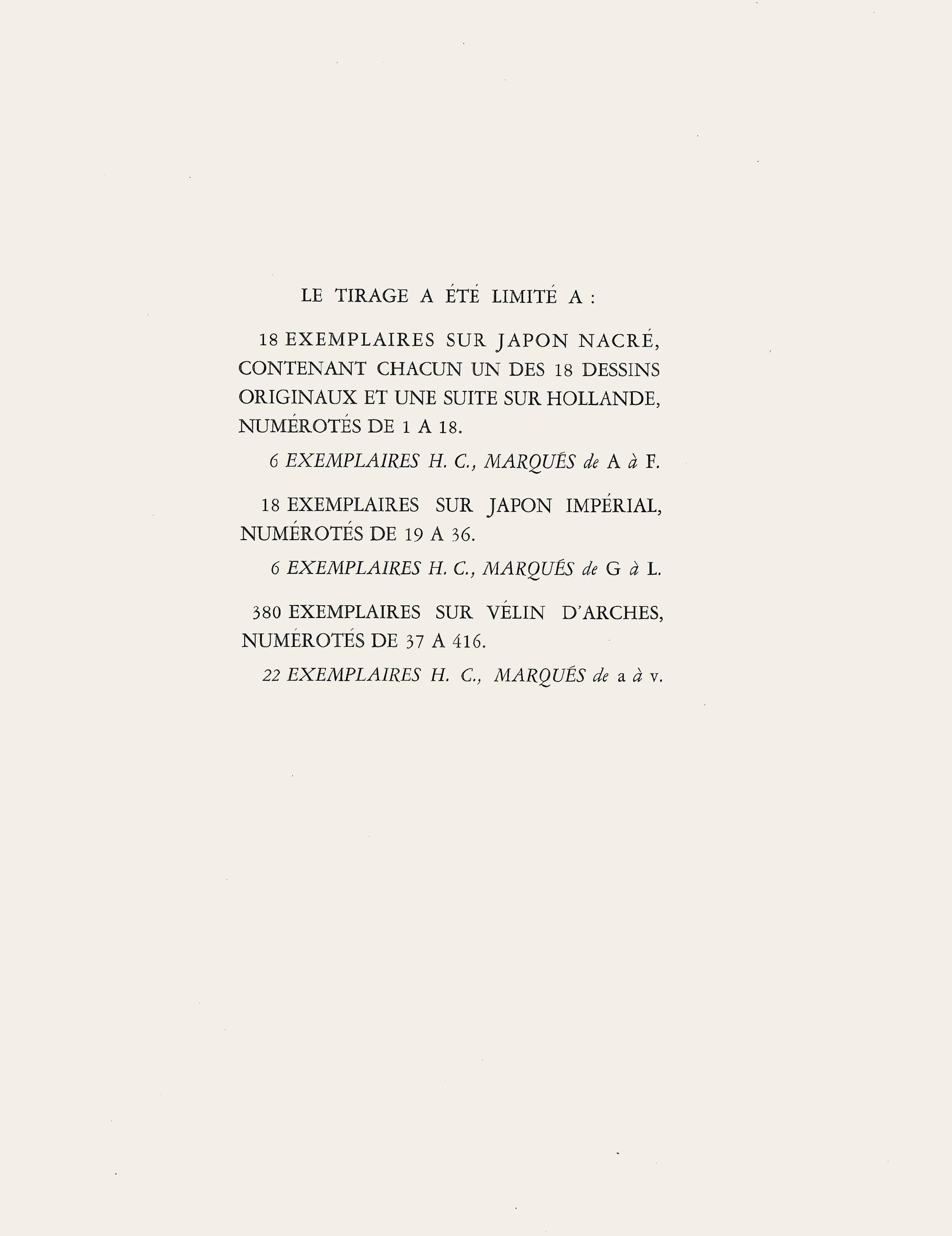 Lithograph and stencil with hand coloring on vlin d'Arches paper. Paper size: 11.8125 x 9.0625 inches. Excellent condition. Inscription: unsigned and unnumbered, as issued. Notes: from the folio, Le Livre blanc, prcd d'un frontispice et accompagn de 17 dessins de Jean Cocteau, 1930. Published by ditions du Signe, Paris; printed by Maties-Imprimeurs, Ducros et Colas, Paris; hand colored by M.B. Armington (a probable pseudonym of Jean Cocteau), Paris, May 10, 1930. Excerpted from the folio (translated from French), This album, whose drawings have been entirely colored by hand by M.B. Armington, an artist-painter, was completed to print on May 10, 1930, by Ducros and Colas, Maties-Imprimeurs in Paris. The draw has been limited to: XVIII examples on japon nacre, each containing one of the XVIII original drawings and a suite on Hollande, numbered from I to XVIII; VI examples, H.C., marked from A to F; XVIII examples on japon imperial, numbered from XIX to XXXVI; VI examples, H.C., marked from G to L; CCCLXXX examples on velin d'Arches, numbered from XXXVII to CDXVI; XXII examples, H.C., marked from A to V.