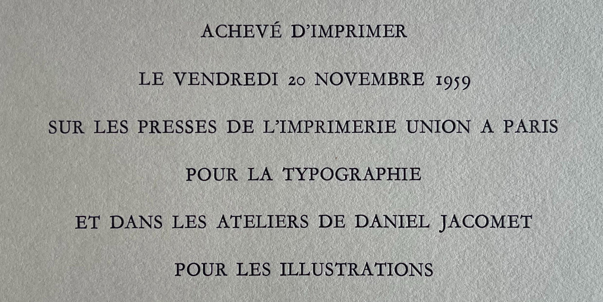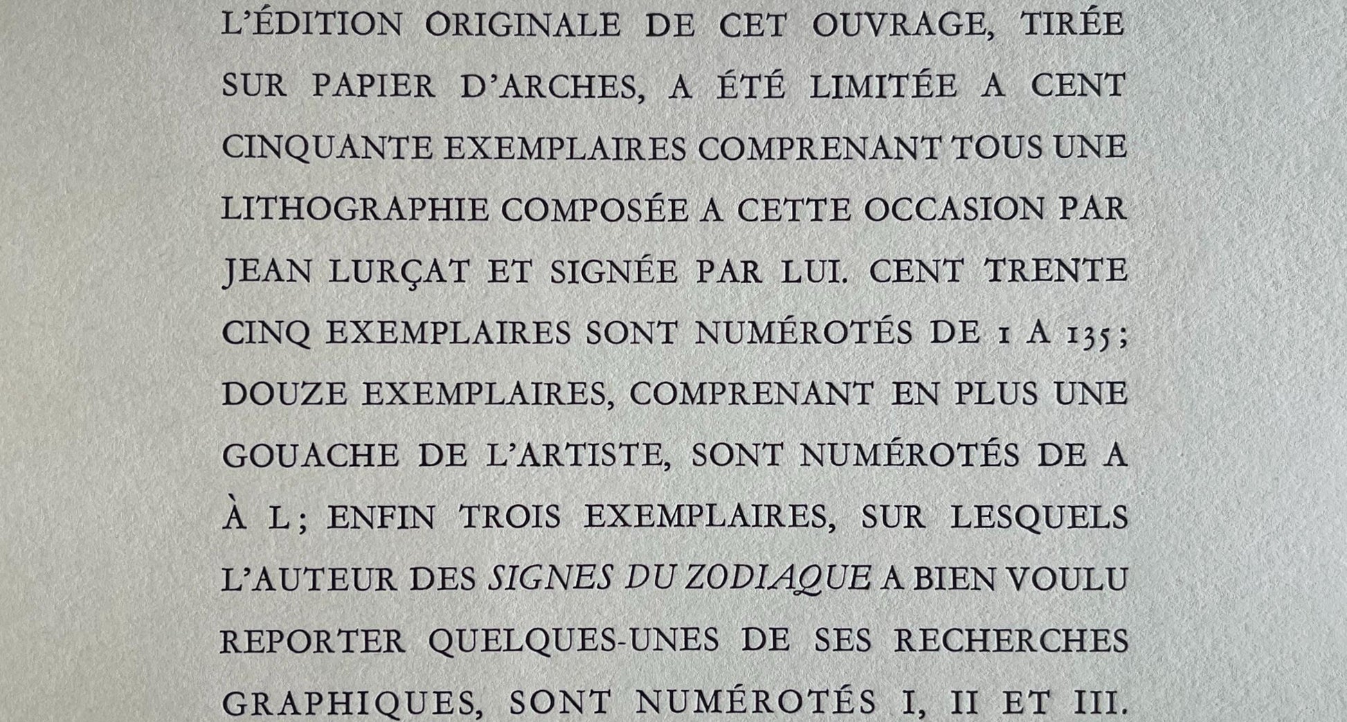 Lithograph and stencil on vlin d'Arches paper. Paper size: 13 x 18 inches. Excellent condition. Unsigned and unnumbered, as issued. Notes: From the folio, Les Signes du zodiaque, 1959. Published by ditions d'art du Lion, Paris; rendered and printed by l'atelier Daniel Jacomet, Paris, November 20, 1959. Excerpted from the volume (translated from French), Finished printing, Friday, November 20, 1959 on the presses of L'Imprimerie Union in Paris for typography; and, in Daniel Jacomet's workshops for the illustrations. The original edition of this album, printed on Arches paper, has been limited to CL examples, all including a lithography composed on this occasion by Jean Lurat and signed by him. CXXXV examples are numbered from I to CXXXV; XII examples, including in addition an artist's gouache, are numbered from A to I; finally III examples, on which the author of the Signs of the Zodiac has kindly reported some of his graphic research, are numbered I, II and III.