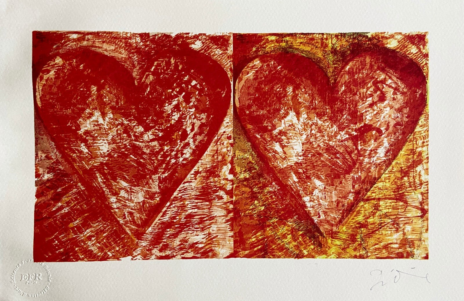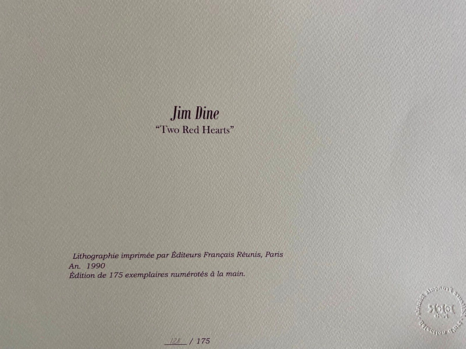 Jim Dine Lithograph COA Signed Op Limited Edition Numbered 175 Ex Jim Dine "Two red hearts" Lithograph Printed by the French publishers gathered, Paris in 1990 I sign Jim Dine on the slab. The work measures 43x28 ??cm 175 specimens EFR, Paris Jim Dine "Two red hearts" Lithograph Printed by the French publishers gathered, Paris in 1990 I sign Jim Dine on the slab. The work measures 43x28 ??cm 175 specimens EFR, Paris