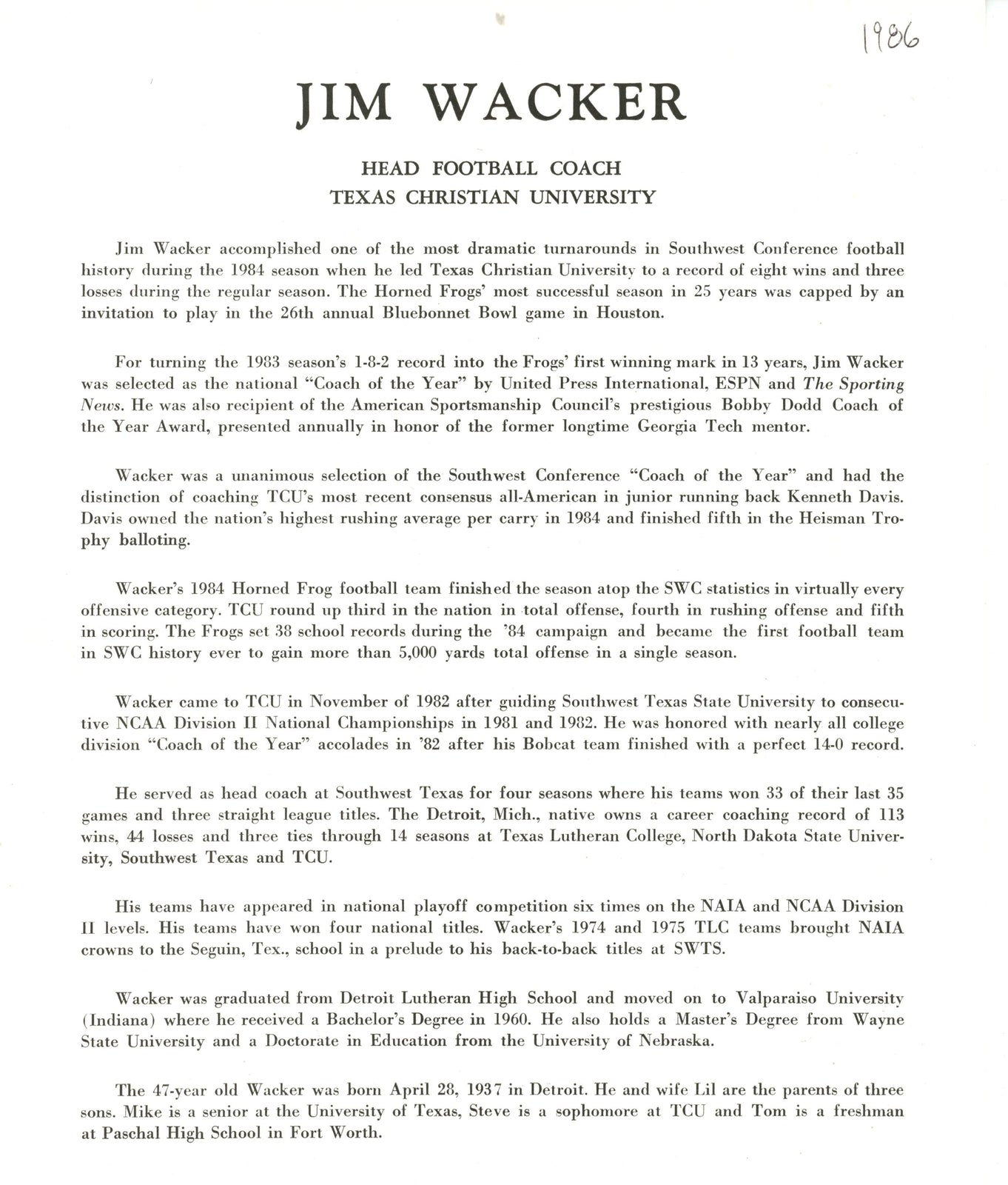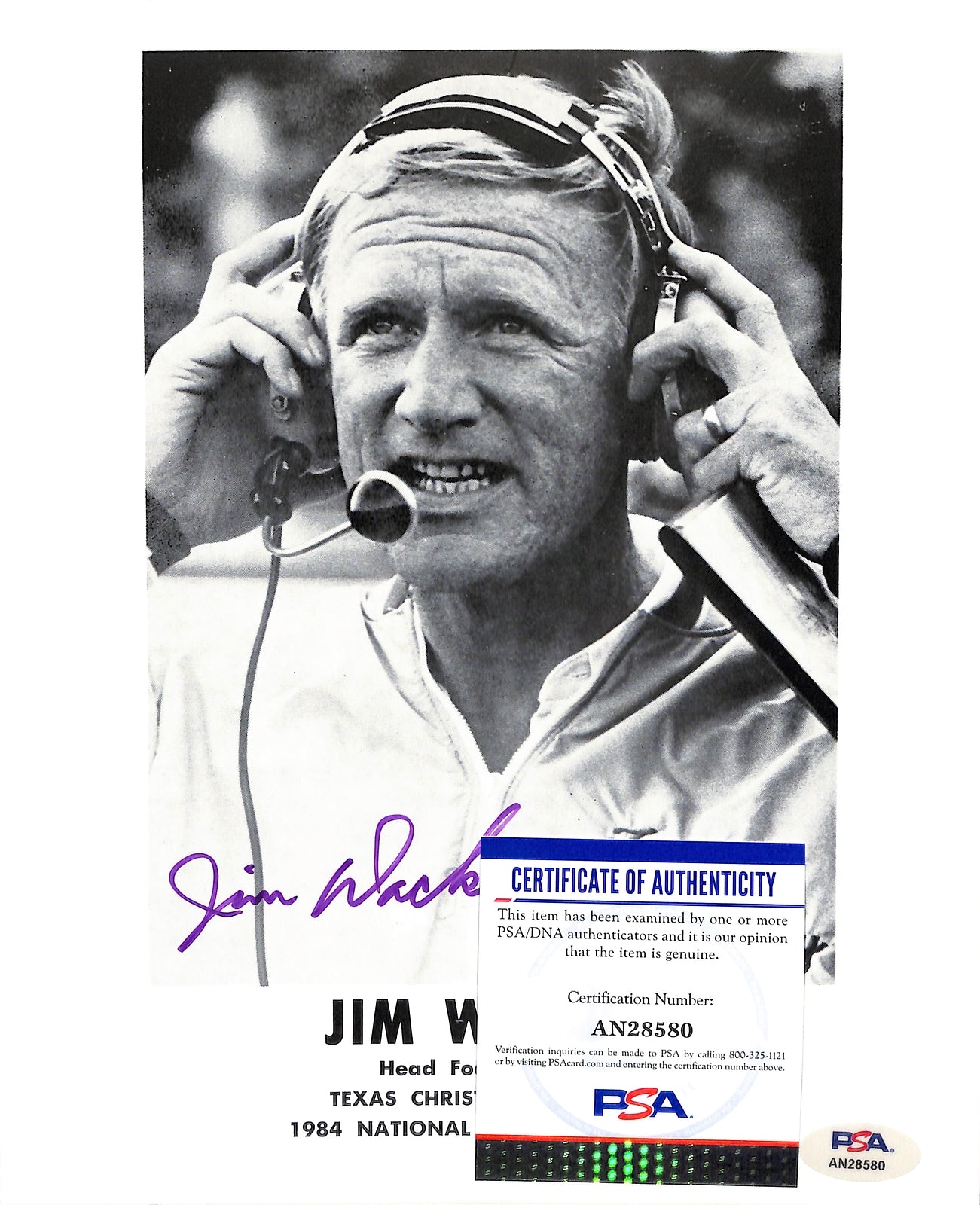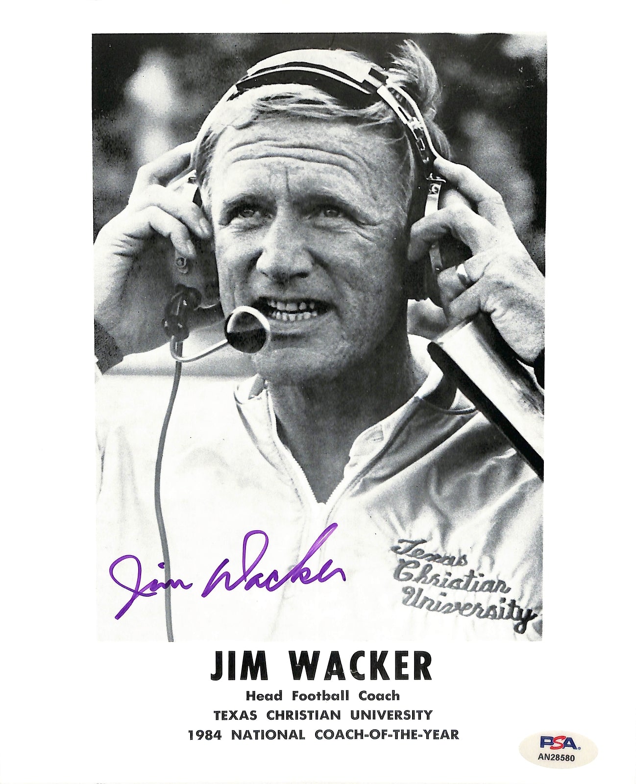 Jim Wacker Signed 8X10 Photo With Bio Info Texas Christian Univ Psa/Dna 185272