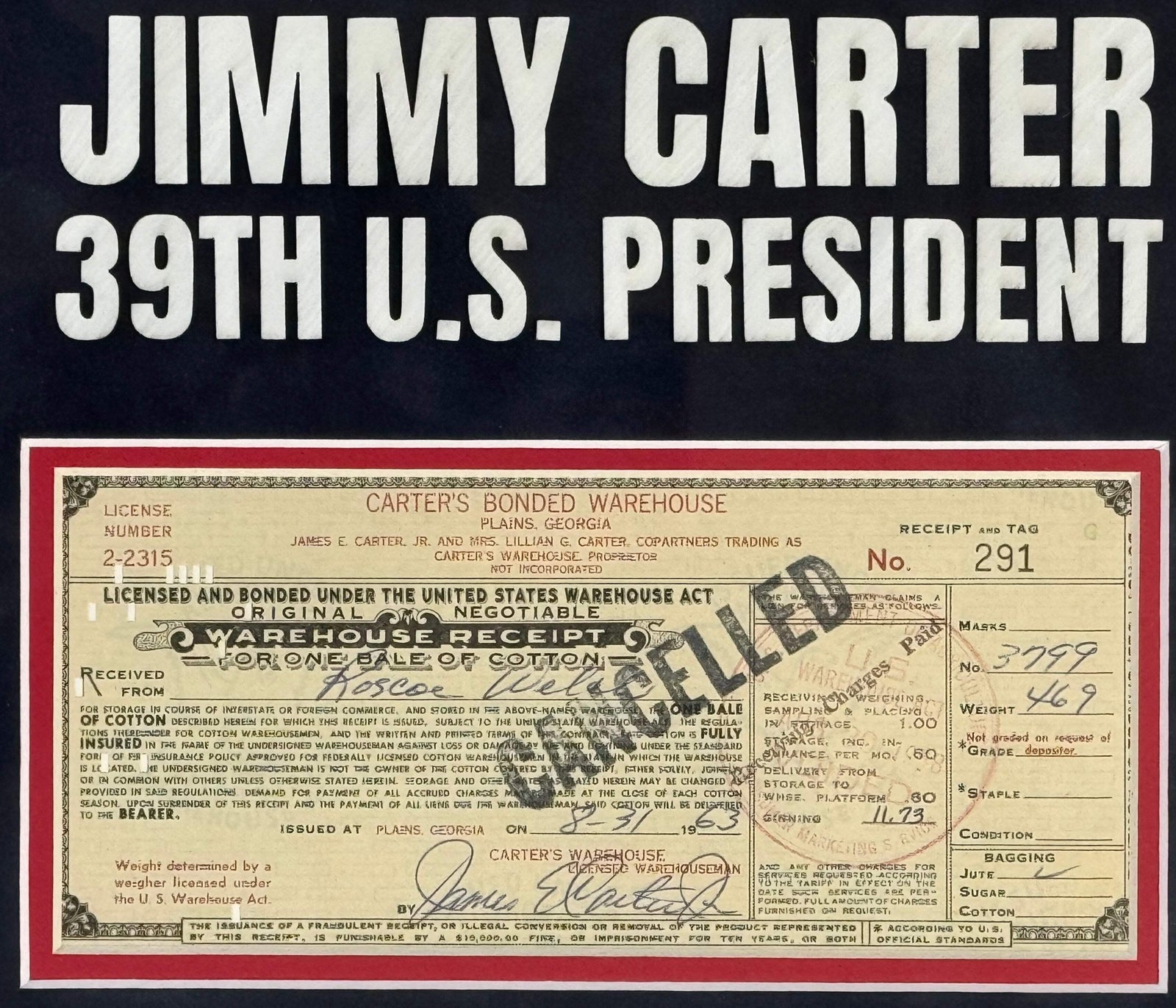 Jimmy Carter 39Th President Of The United States Signed Plains Warehouse Check
