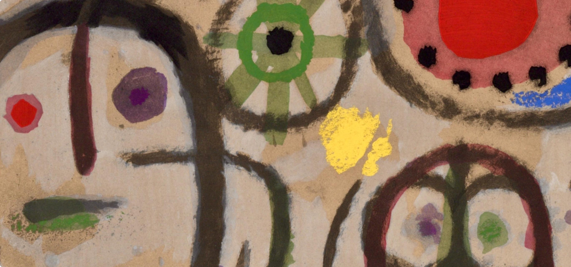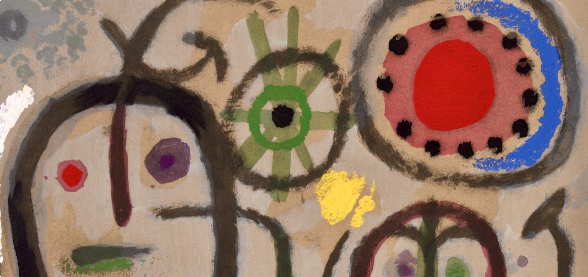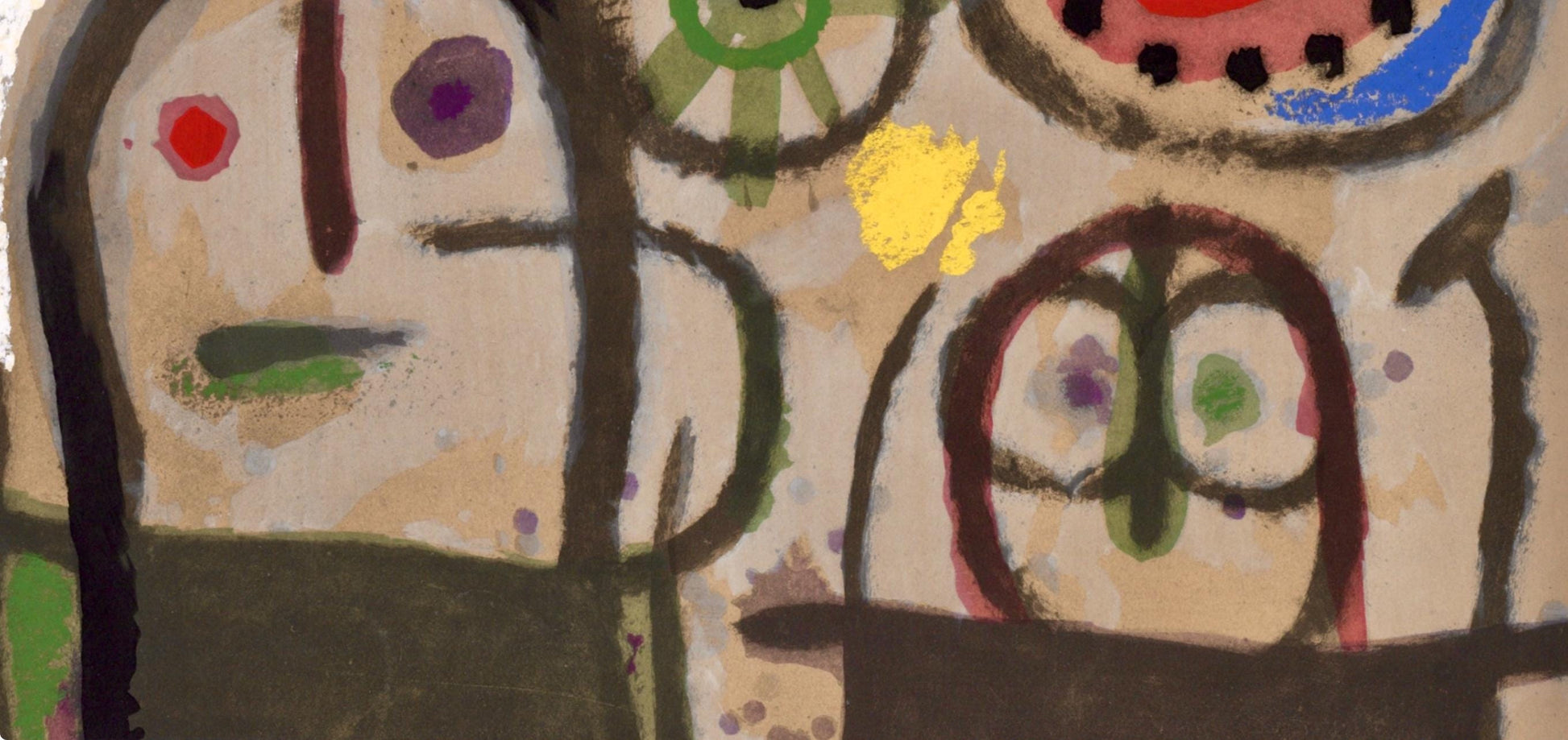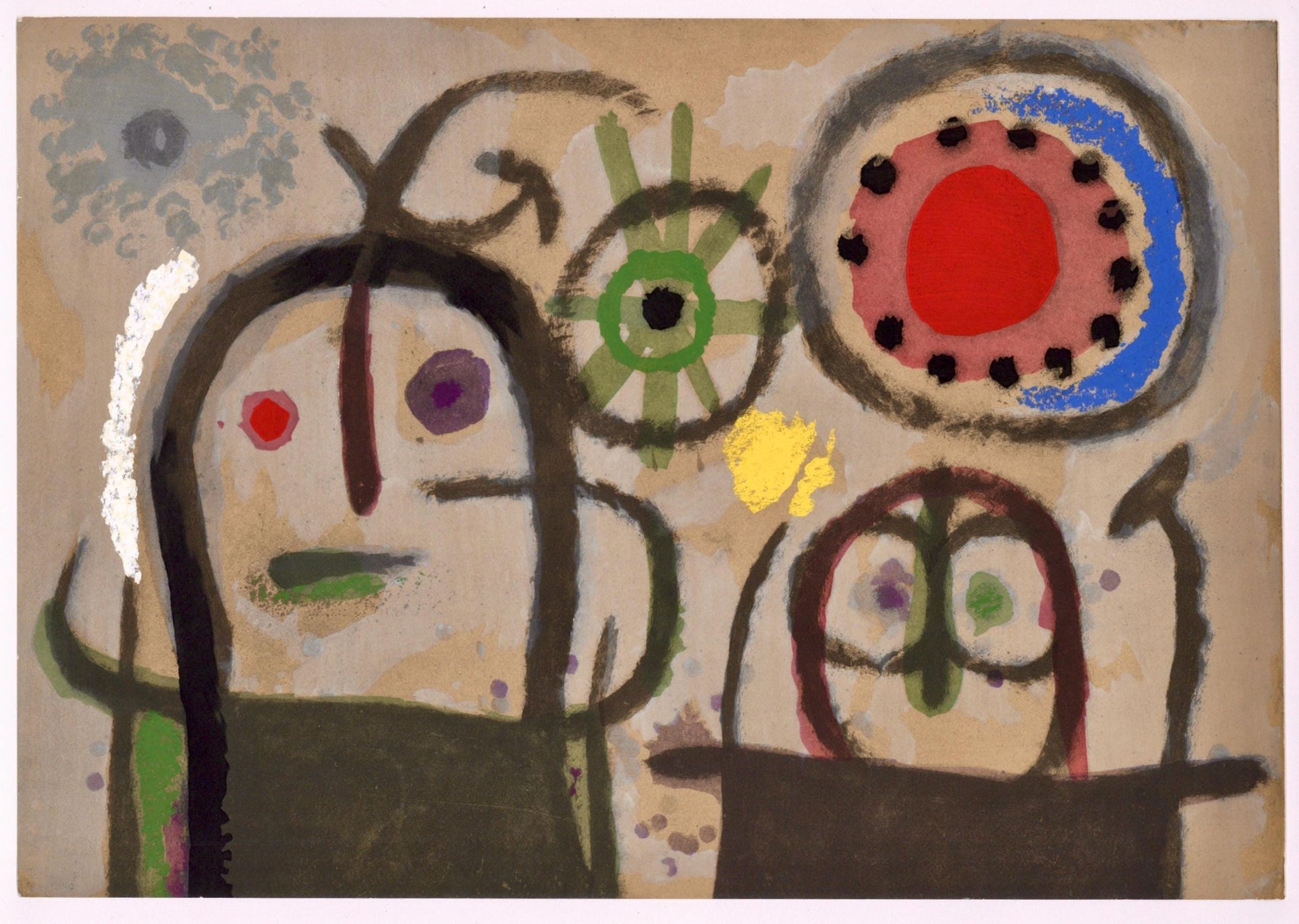 Lithograph and stencil on vlin paper. Paper size: 8.625 x 12.25 inches. Excellent condition. Inscription: Unsigned and unnumbered, as issued. Notes: From the album, Mir: Cartones, 1959-1965, October - November 1965, 1965. Published by Pierre Matisse Gallery, New York; printed by l'Imprimerie Daniel Jacomet, Paris, 1965. Excerpted from the album, This album has been printed in Paris on the occasion of the artist's exhibition of "Cartones" at the Pierre Matisse Gallery, 4l East 57th Street, New York, from October 19th to November 13th 1965. The edition has been limited to LXXV examples on vlin d'Arches la forme, numbered I to XXV containing 2 original lithographs in color, one of which is signed by the artist and MCC examples with one original lithograph, numbered I to MCC. The colored pochoirs are by Daniel Jacomet and the typography by Fequet et Baudier. The original lithographs, including the cover, were printed by Fernand Mourlot.