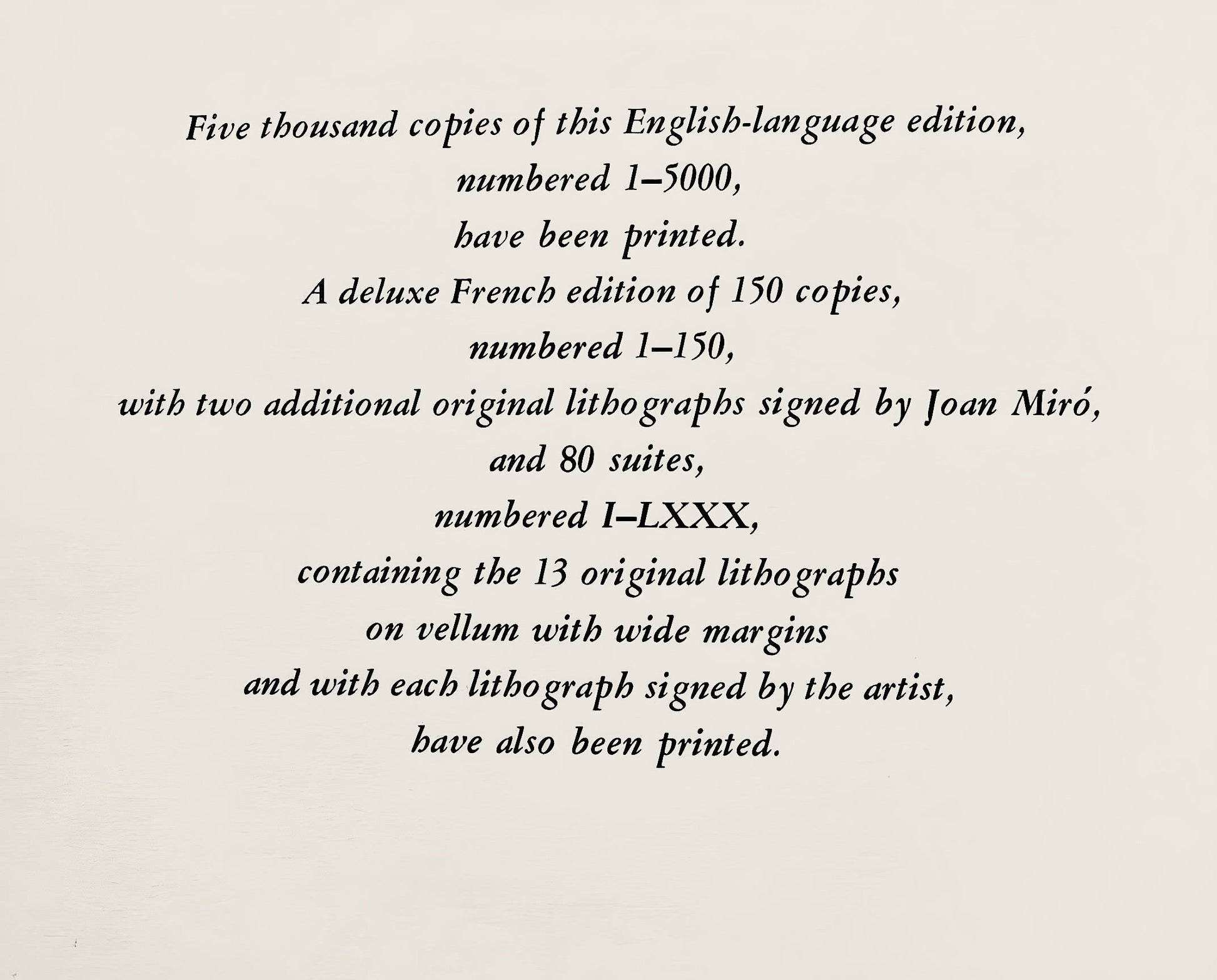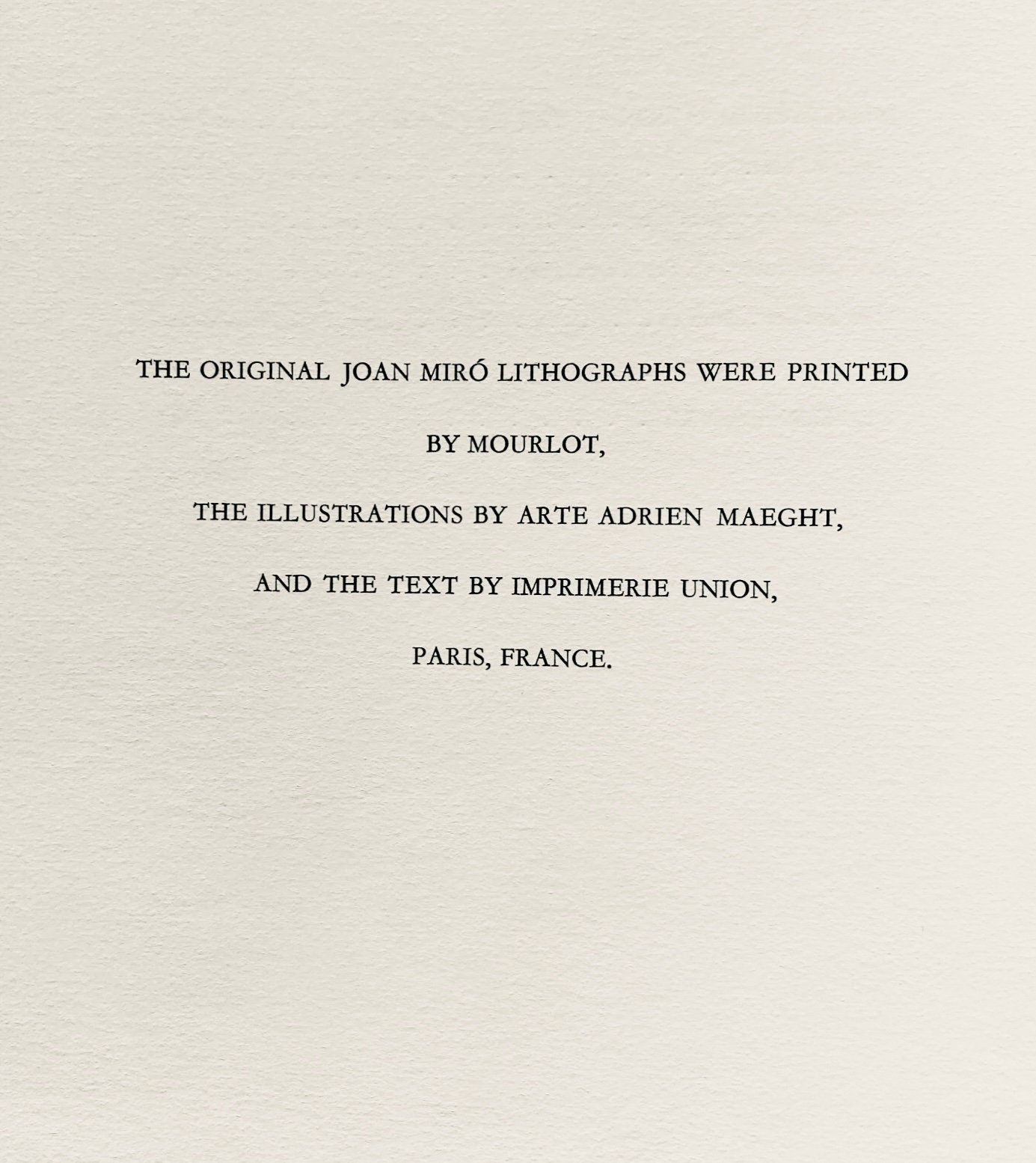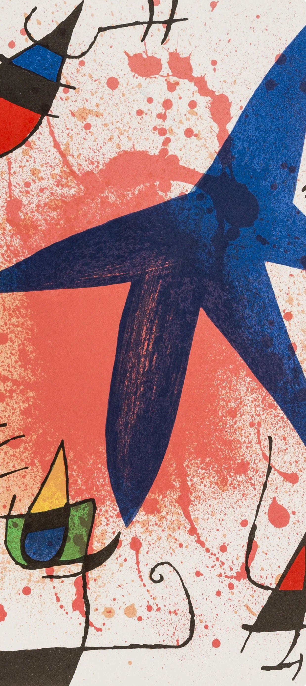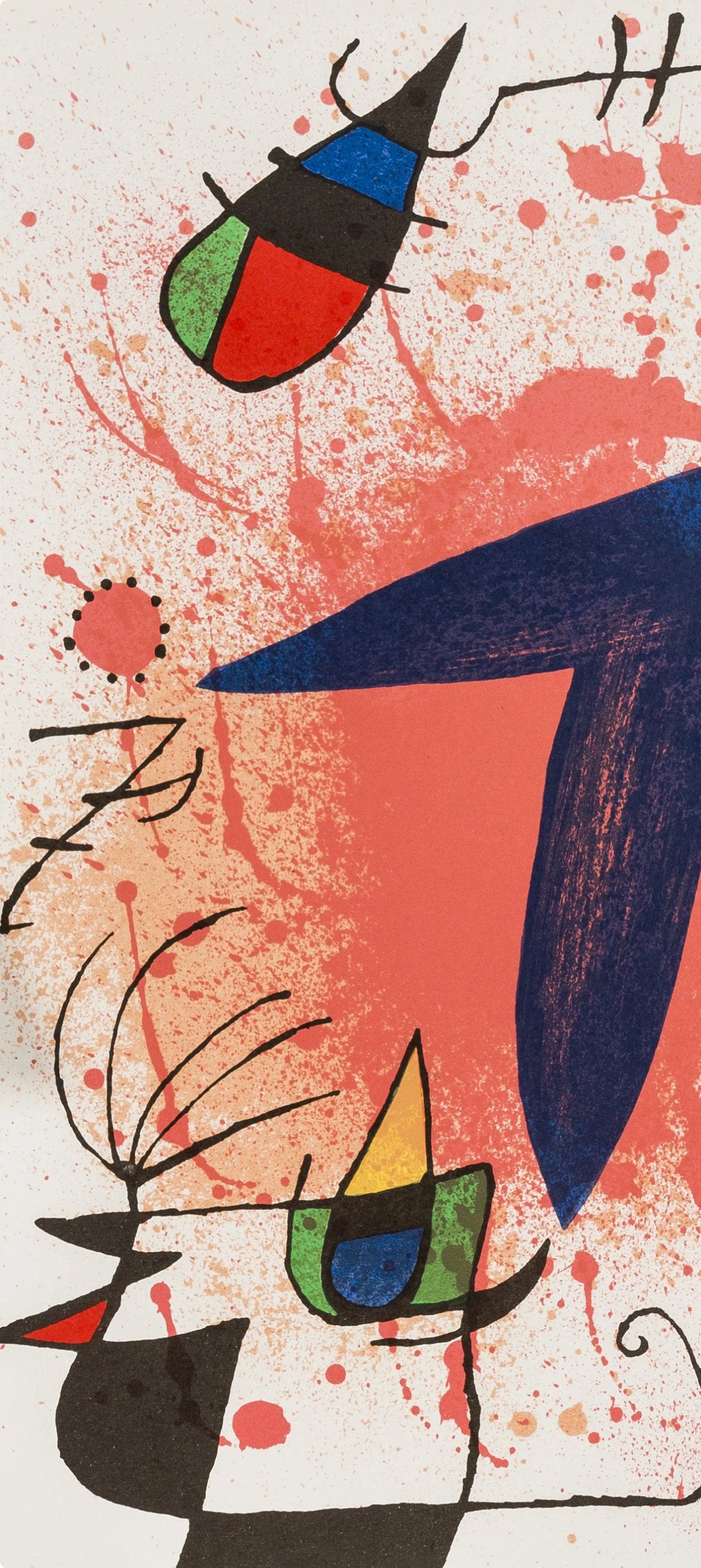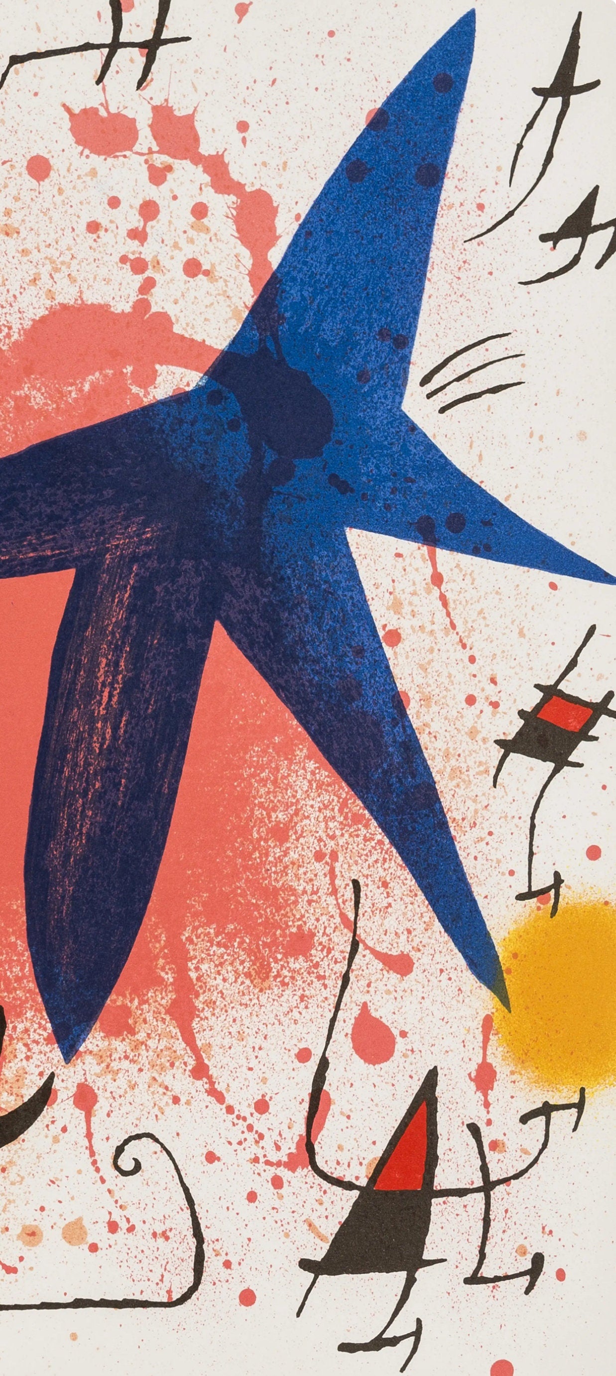Lithograph on vlin paper. Inscription: Unsigned and unnumbered. Paper Size: 12.5 x 9.25 inches. Excellent condition. Notes: From the volume, Joan Mir Lithographs, Volume I. Published by Tudor Publishing Company, New York; printed by Mourlot Frres, Paris. Excerpted from the volume, The original Joan Mir lithographs were printed by Mourlot, the illustrations by Arte Adrien Maeght, and the text by Imprimerie Union, Paris, France. V? examples of this English-language edition, numbered I-V?, have been printed. A deluxe French edition of CL examples, numbered I-CL, with two additional original lithographs signed by Joan Mir, and 80 suites, numbered I-LXXX, containing the 13 original lithographs on vellum with wide margins and with each lithograph signed by the artist, have also been printed.