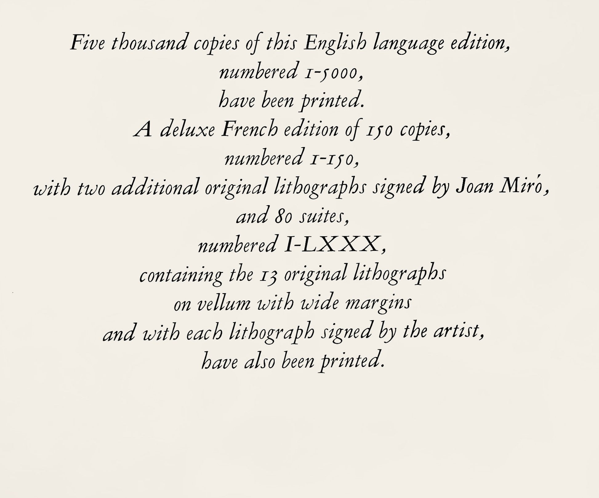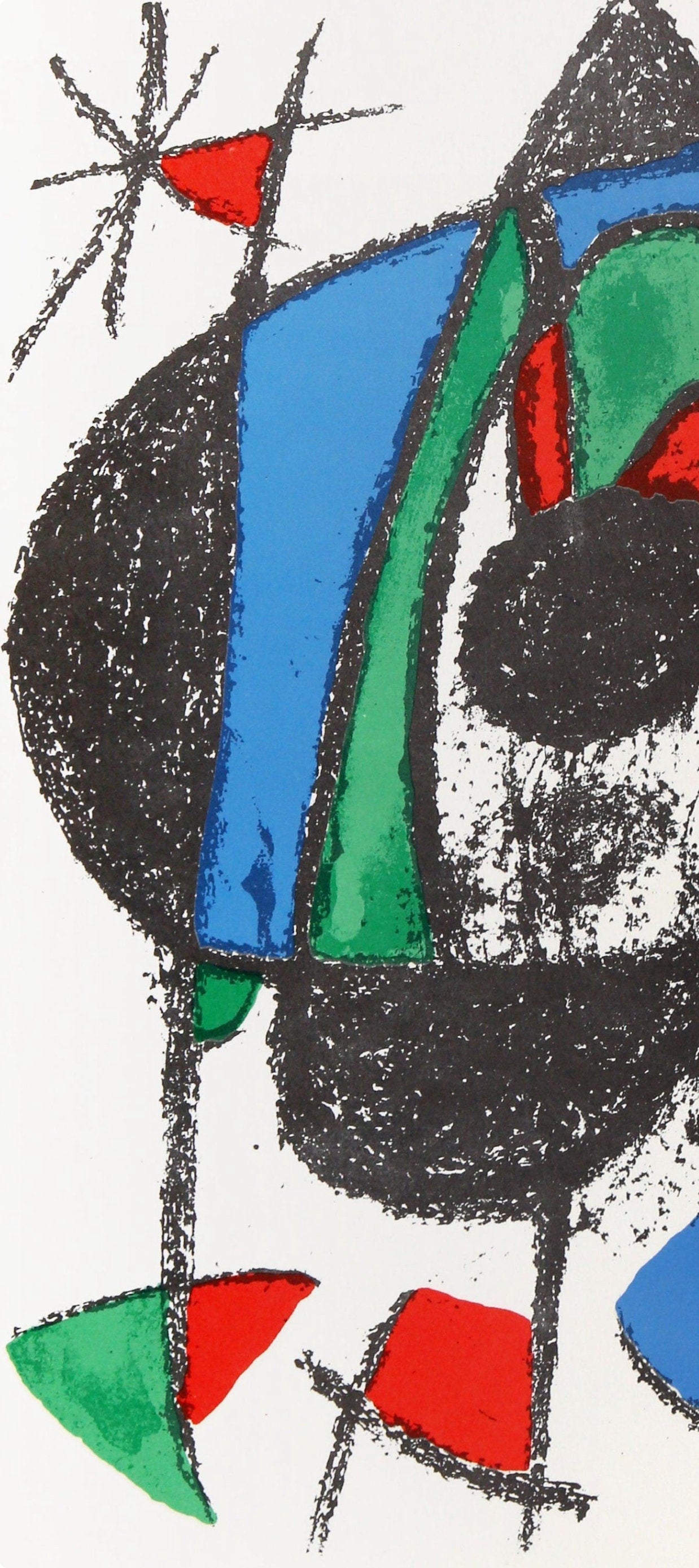 Lithograph on vlin paper. Inscription: Unsigned and unnumbered. Paper Size: 12.5 x 9.25 inches. Excellent condition. Notes: From the volume, Joan Mir Lithographs, Volume II, 1975. Published by Leon Amiel publisher, New York; printed by Mourlot Frres, Paris. Excerpted from the volume, The original Joan Mir lithographs were printed by Mourlot, the illustrations by Arte Adrien Maeght, and the text by Imprimerie Union, Paris, France. V? examples of this English-language edition, numbered I-V?, have been printed. A deluxe French edition of CL examples, numbered I-CL, with two additional original lithographs signed by Joan Mir, and 80 suites, numbered I-LXXX, containing the 13 original lithographs on vellum with wide margins and with each lithograph signed by the artist, have also been printed.