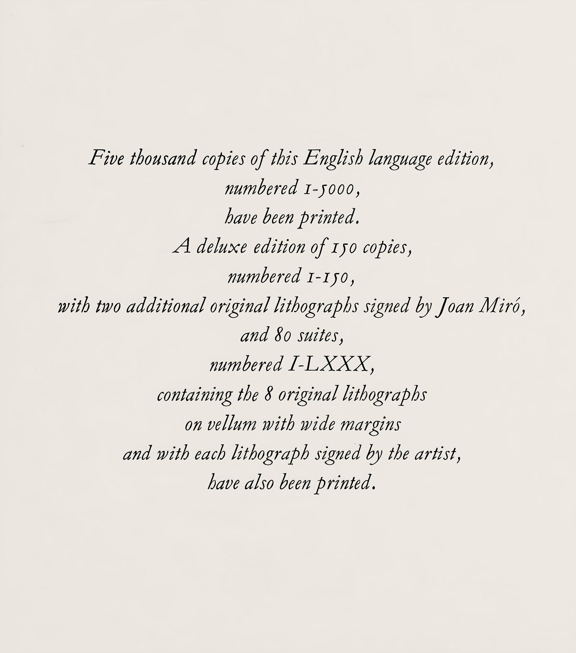 Lithograph on vlin paper. Inscription: Unsigned and unnumbered. Paper Size: 12.5 x 9.25 inches. Excellent condition. Notes: From the volume, Joan Mir Lithographs, Volume III, 1977. Published by Maeght diteur, Paris; printed by L'Imprimerie Arte, Paris, under the direction of Adrien Maeght, diteur, Paris, April 15, 1977. Excerpted from the volume, Final printing in Paris on 15th April 1977, at Arte Adrien Maeght Press. The wide margin lithographs as well as the supplementary lithographs were printed by the Mourlot Press. V? examples of this English-language edition, numbered I-V?, have been printed. A deluxe French edition of CL examples, numbered I-CL, with two additional original lithographs signed by Joan Mir, and 80 suites, numbered I-LXXX, containing the 8 original lithographs on vellum with wide margins and with each lithograph signed by the artist, have also been printed.