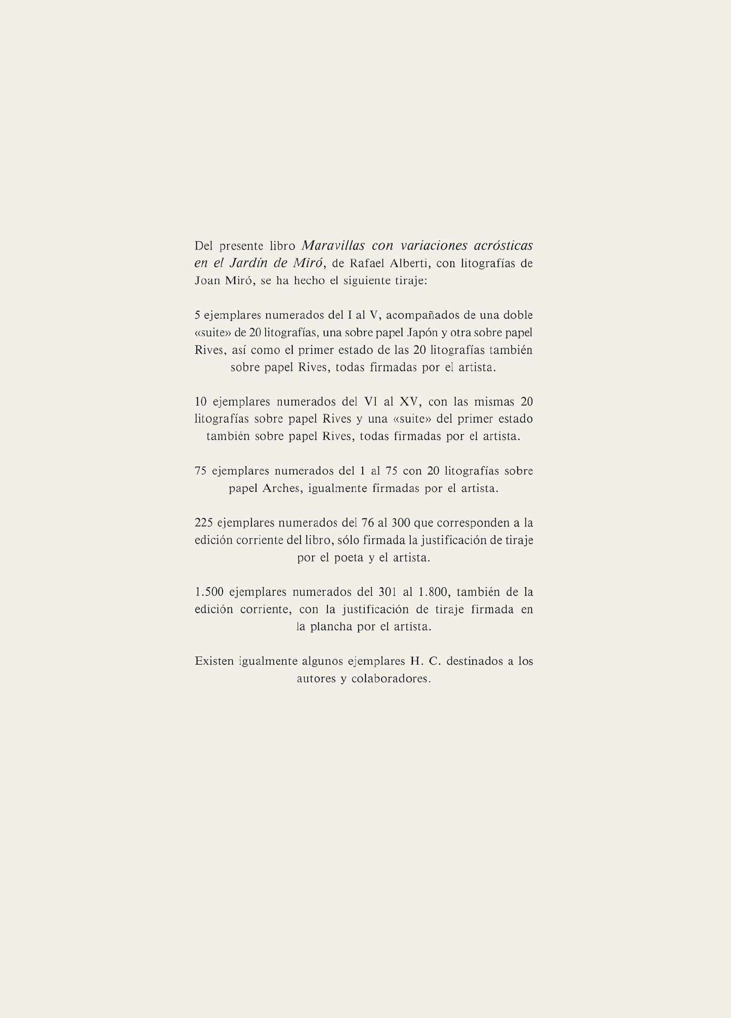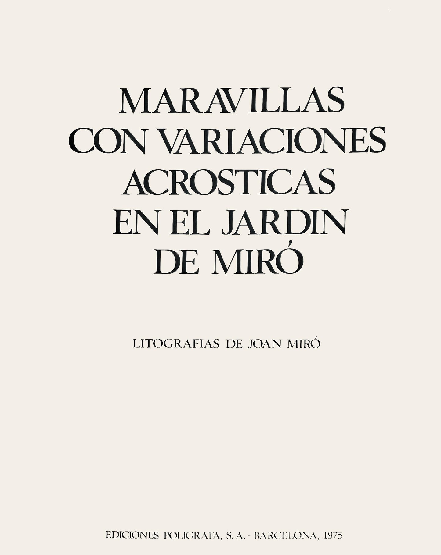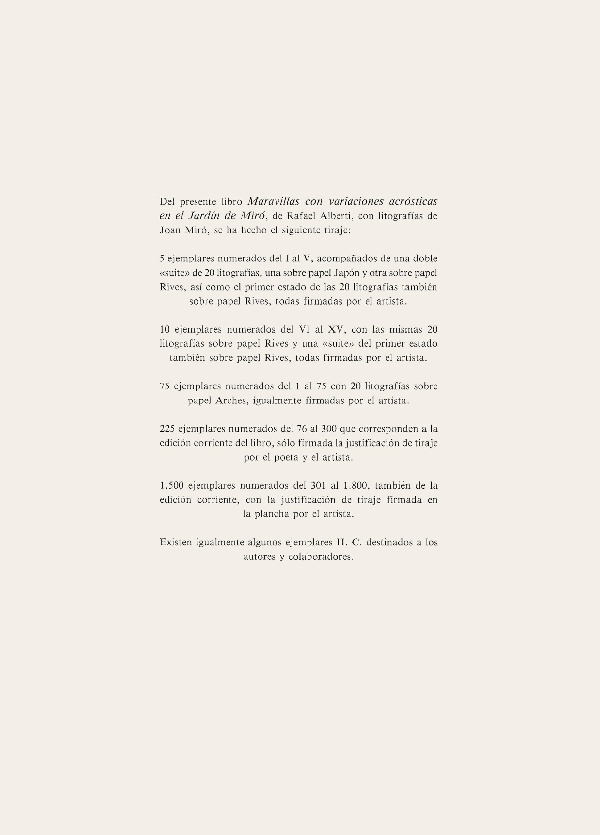 Lithograph on vlin dArches paper. Inscription: Signed in the plate and unnumbered, as issued. Paper Size: 19.5 x 14.125 inches. Excellent condition. Notes: From the folio, Maravillas con variaciones acrsticas en el Jardn de Mir, published by Ediciones Polgrafa, Barcelona; printed by La Polgrafa Barcelona, 1975. Excerpted from the folio (translated from French), From this album Maravillas con variaciones acrsticas en el Jardn de Mir, by Rafael Alberti, with lithographs ......