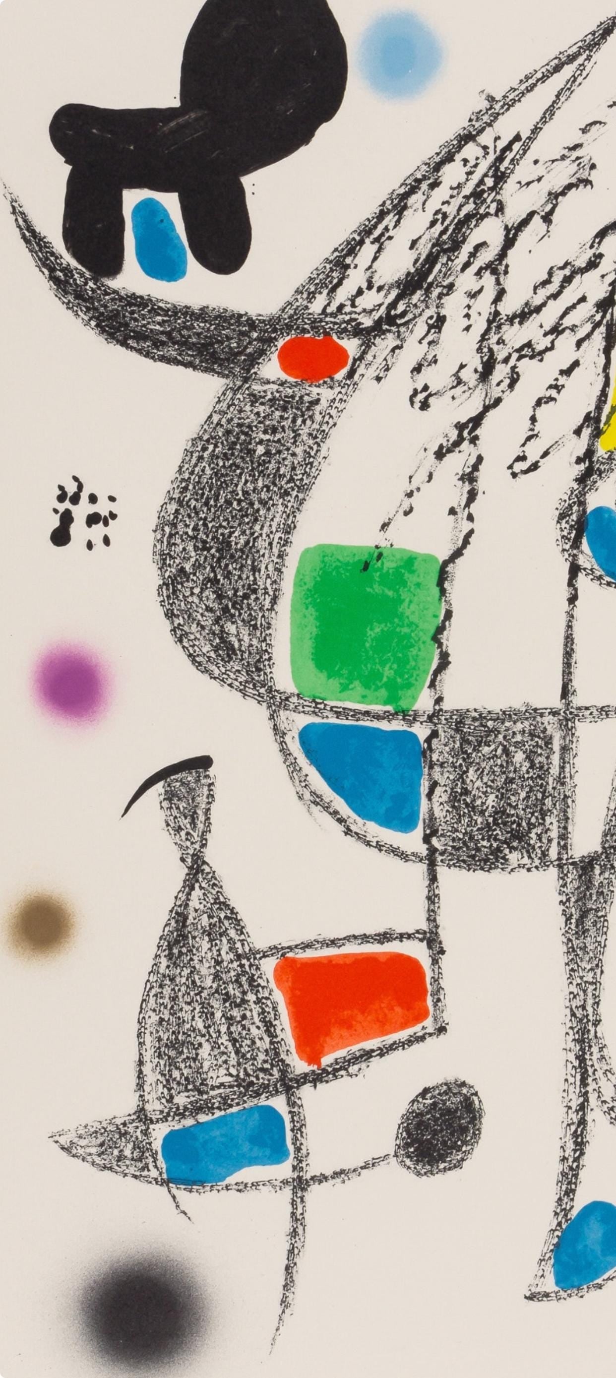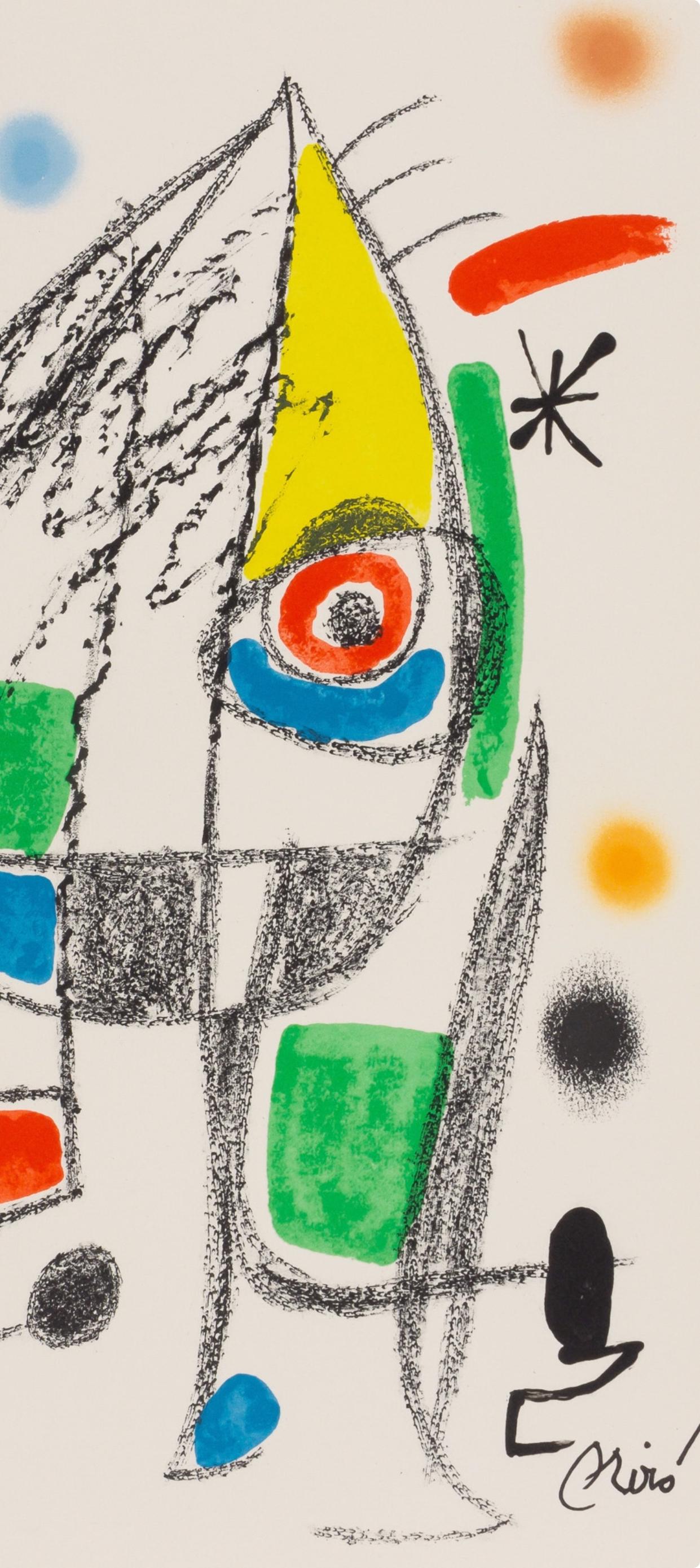 Lithograph on vlin dArches paper. Inscription: Signed in the plate and unnumbered, as issued. Paper Size: 19.5 x 14.125 inches. Excellent condition. Notes: From the folio, Maravillas con variaciones acrsticas en el Jardn de Mir, published by Ediciones Polgrafa, Barcelona; printed by La Polgrafa Barcelona, 1975. Excerpted from the folio (translated from French), From this album Maravillas con variaciones acrsticas en el Jardn de Mir, by Rafael Alberti, with lithographs by Joan Mir, the following edition has been made: V numbered examples from I to V, accompanied by a double "suite" of 20 lithographs, one on Japn paper and one on Rives paper, as well as the first state of the 20 lithographs also on Rives paper, all signed by the artist. X examples numbered from VI to XV, with the same 20 lithographs on Rives paper and a "suite" of the first state also on Rives paper, all signed by the artist. LXXV examples numbered from I to LXXV with 20 lithographs on Arches paper, also signed by the artist. CCXXV examples numbered from LXXVI to CCC that correspond to the current edition of the folio, only signed the justification of the print run by the poet and the artist. MD examples numbered from CCCI to MDCCC, also of the current edition, with the justification of the print run signed on the plate by the artist. There are also some H.C. examples intended for authors and collaborators.