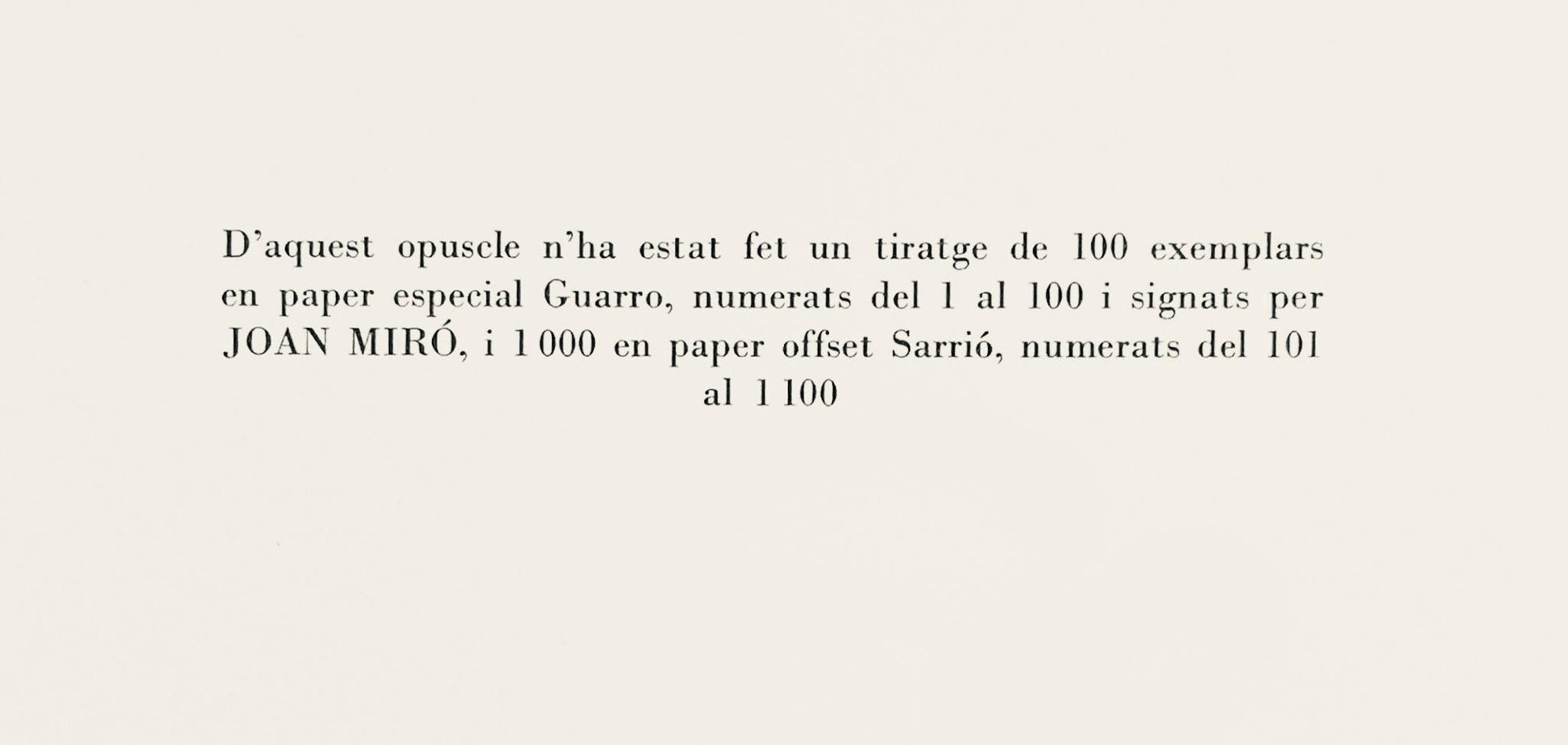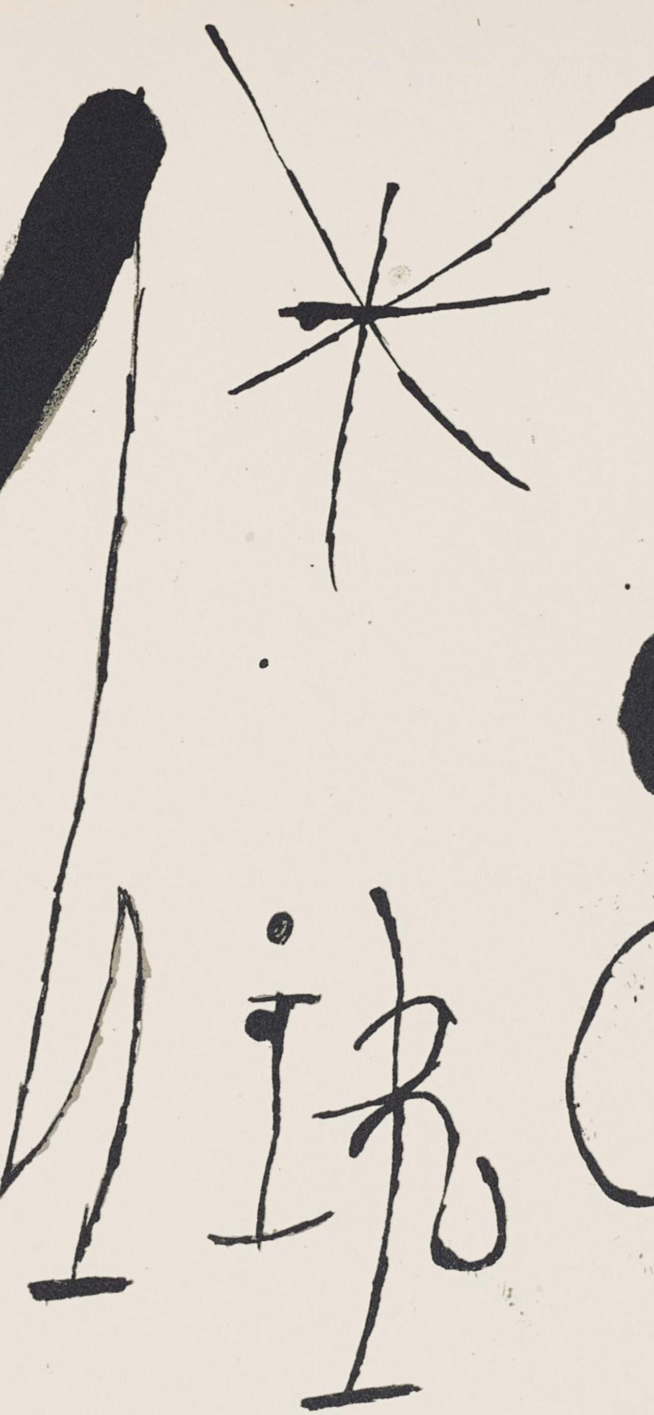 Lithograph on vlin Sarri paper. Paper size: 11.81 x 17.72 inches. Excellent condition, with centerfold, as issued. Unsigned and unnumbered, as issued. Notes: From the folio, Taps De Tarragona, illustracions, Joan Mir, 1972. Published by Sala Gaspar S.L., Barcelona; printed by Publicaciones Reunidas, S.A., Barcelona, 1972. Excerpted from the folio (translated from Spanish), El taps de Tarragona" has been realized by Josep Royo, at the Catalan School of Carpets, catifes, and tapestries, Aymat, Sant Cugat del Valls. It has been shot: C examples on special Guarro paper, numbered from I to C, signed by Joan Mir, and M on Sarri wove paper, numbered from CI to MC.