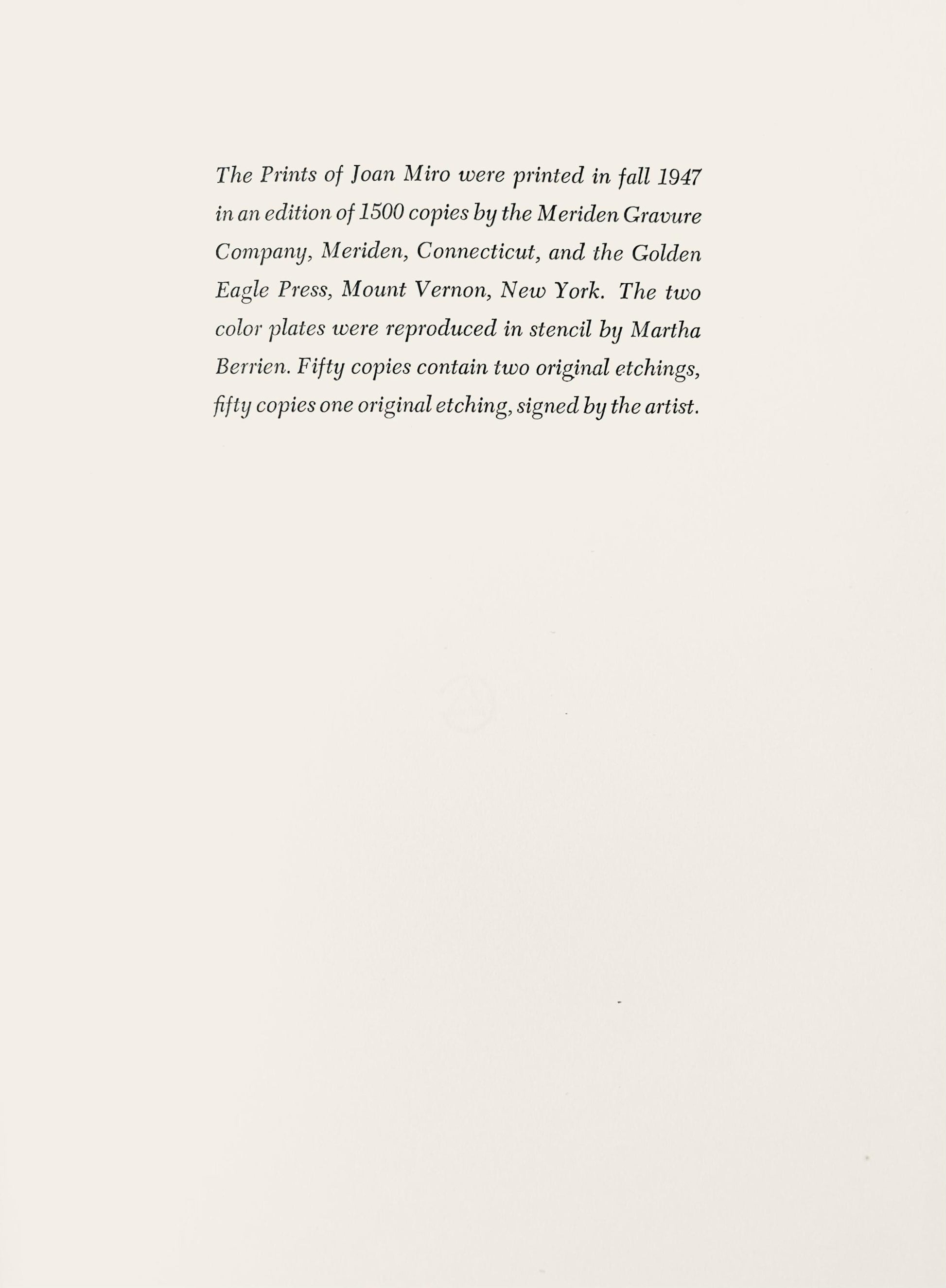 Etching on vlin paper. Inscription: Unsigned and unnumbered, as issued. Paper Size: 11 x 8.5 inches. Excellent condition. Notes: From the folio, The Prints of Joan Miro, Fall, 1947. Published by Curt Valentin, New York; printed by Meriden Gravure Company, Meriden, Connecticut, and Golden Eagle Press, Mount Vernon, New York. Excepted from the folio, The Prints of Joan Miro were printed in Fall 1947 in an edition of MD examples by the Meriden Gravure Company, Meriden, Connecticut, and the Golden Eagle Press, Mount Vernon, New York. The two color plates were rendered in stencil by Martha Berrien. L examples contain two original etchings; L examples, one original etching, signed by the artist.