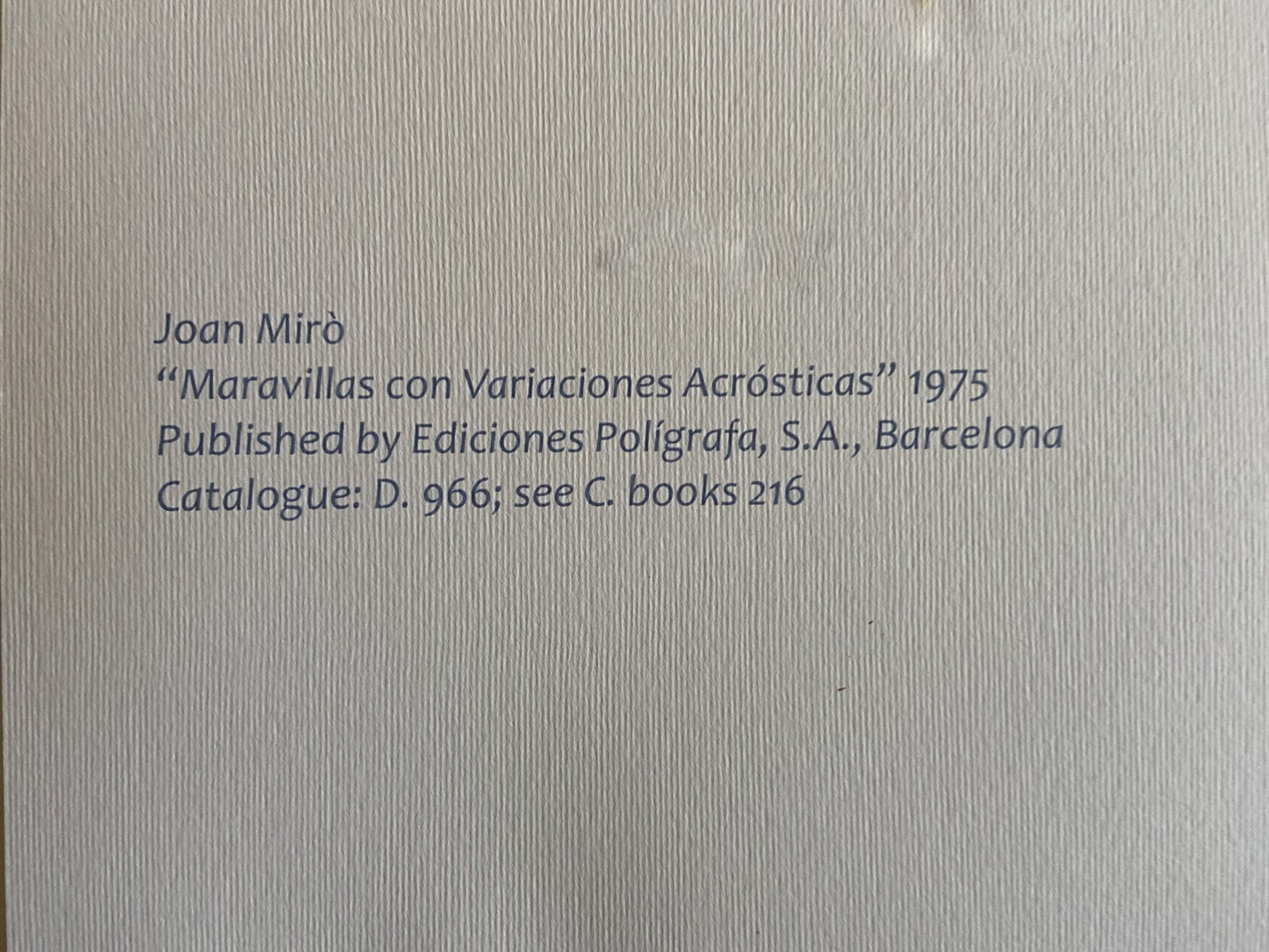 JOAN MIRO' " Wonders with Acrobatic Variations. " Aprs lithograph printed in 1975 by the Polygraph of Barcelona. Signature Joan Mir on the plate. The work measures 27x38 cm References: Catalog D. 966; see C. books 216 JOAN MIRO' "Wonders with Acrobatic Variations." Aprs lithograph printed in 1975 by the Polygraph of Barcelona. Signature Joan Mir on the plate. The work measures 27x38 cm References: Catalog D. 966; see C. books 216