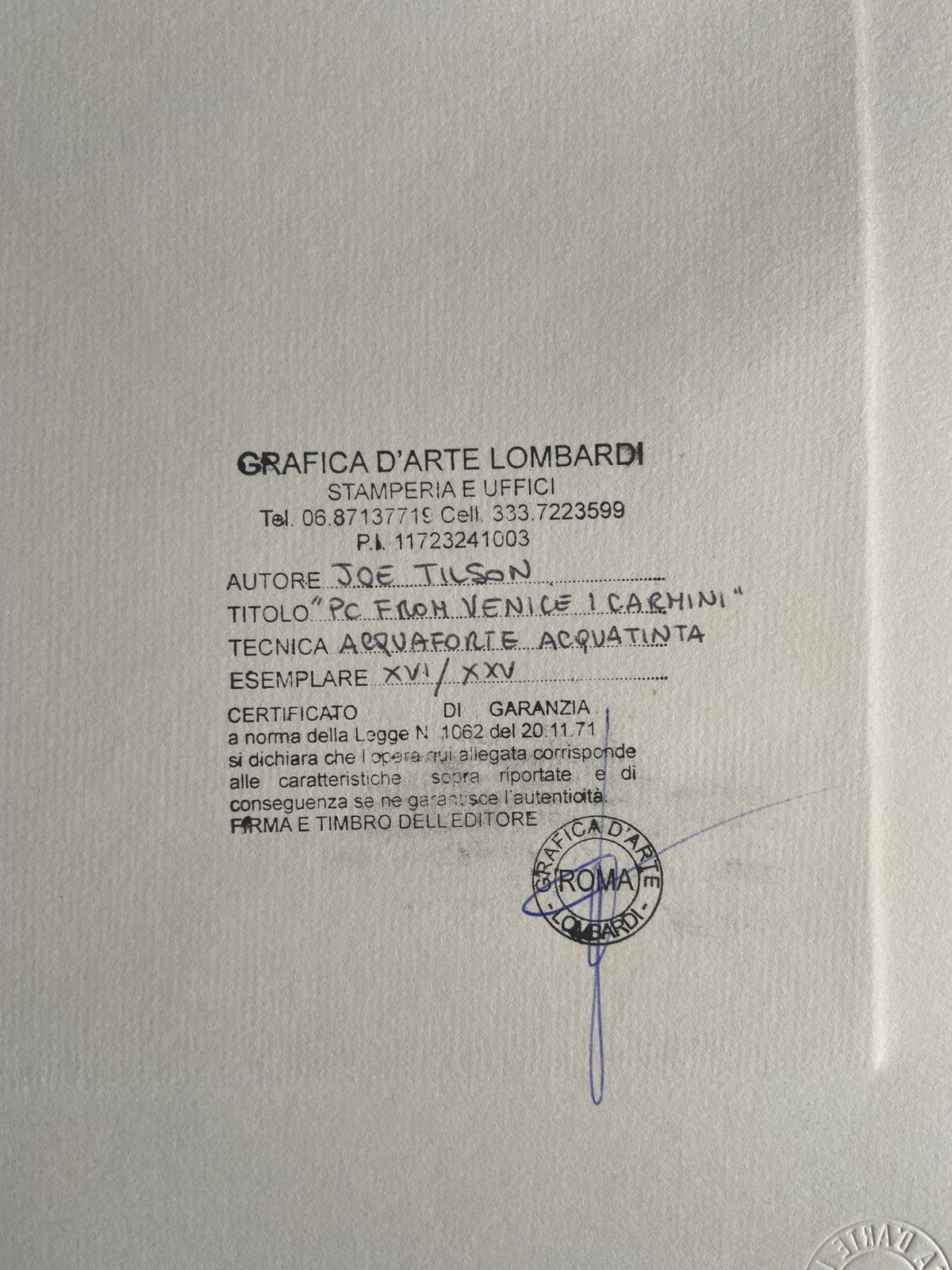Joe Tilson "PC From Venice" Etching Hand Signed Certified Joe Tilson "PC from Venice I Carmini" ORIGINAL ACQUATTINT ACQUOPLE IN 4 SHOES 56 x 76 full sheet 125 + XXV ES. numbered specimen Year 2013 edition Dry stamp editor certificate of authenticity in accordance with the law of the publisher The numbering could be different from the published specimen Joe Tilson "PC from Venice I Carmini" ORIGINAL ACQUATTINT ACQUOPLE IN 4 SHOES 56 x 76 full sheet 125 + XXV ES. numbered specimen Year 2013 edition Dry stamp editor certificate of authenticity in accordance with the law of the publisher The numbering could be different from the published specimen Related keywords art venice etching artwork etching signed signed etching joe tilson signed etchings etching signed numbered etching signed signed etching signed etchings signed art etching venice etching signed etching artwork print signed etching signed- art prints etching signed venice print hand colored etching etching prints miniature etching signed etching rembrandt etching signed art prints signed etching joe tilson etching joe tilson venice Provided by