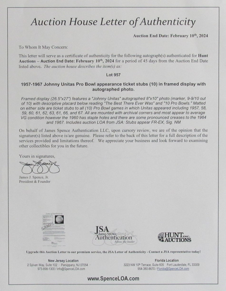 Johnny Unitas Hof Signed/Auto 8X10 Photo W/ Pro Bowl Tickets Framed Jsa 190160