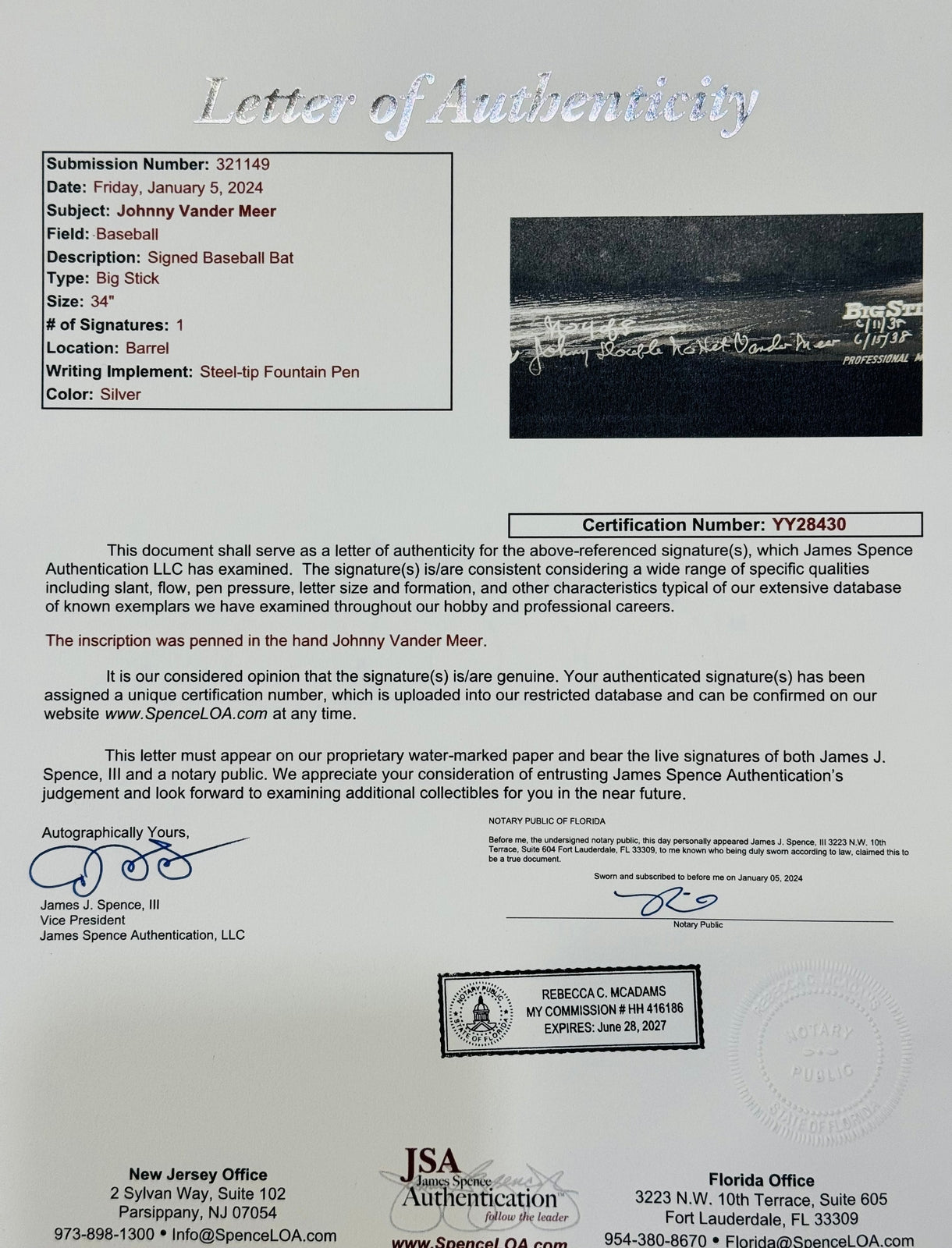 Johnny Vander Meer Autographed Rawlings Big Stick Bat (Jsa)