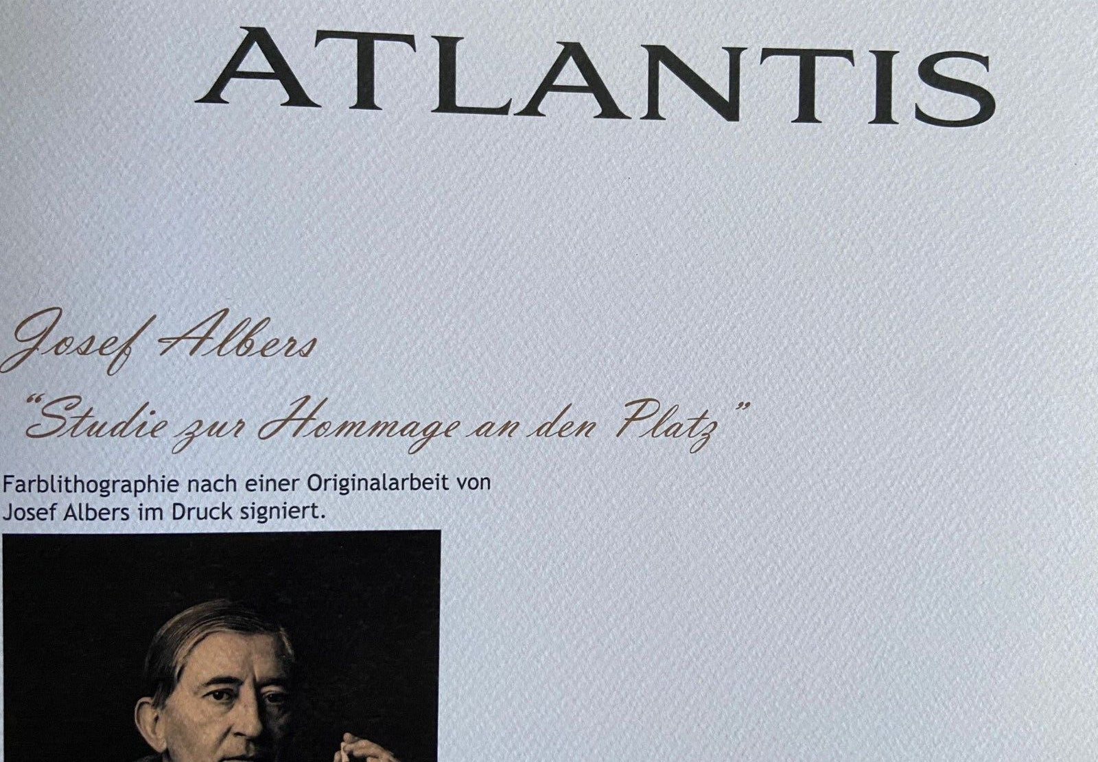 Josef Albers Lithograph COA Numbered Signed Op (Piet-Mondrian] Josef Albers " Study in homage to the square " Chromolithography printed in 1978 in 180 specimens by Atlantis Verlag, Freiburg 33 x 33 cm Signature Josef Albers on the slab COA signed in pen and stamped Dry and authentic stamp of the publishing house The progressive number could be different from the published one. Atlantis Kunst Verlag Freiburg Josef Albers "Study in homage to the square" Chromolithography printed in 1978 in 180 specimens by Atlantis Verlag, Freiburg 33 x 33 cm Signature Josef Albers on the slabCOA signed in pen and stamped Dry and authentic stamp of the publishing house The progressive number could be different from the published one. Atlantis Kunst Verlag Freiburg