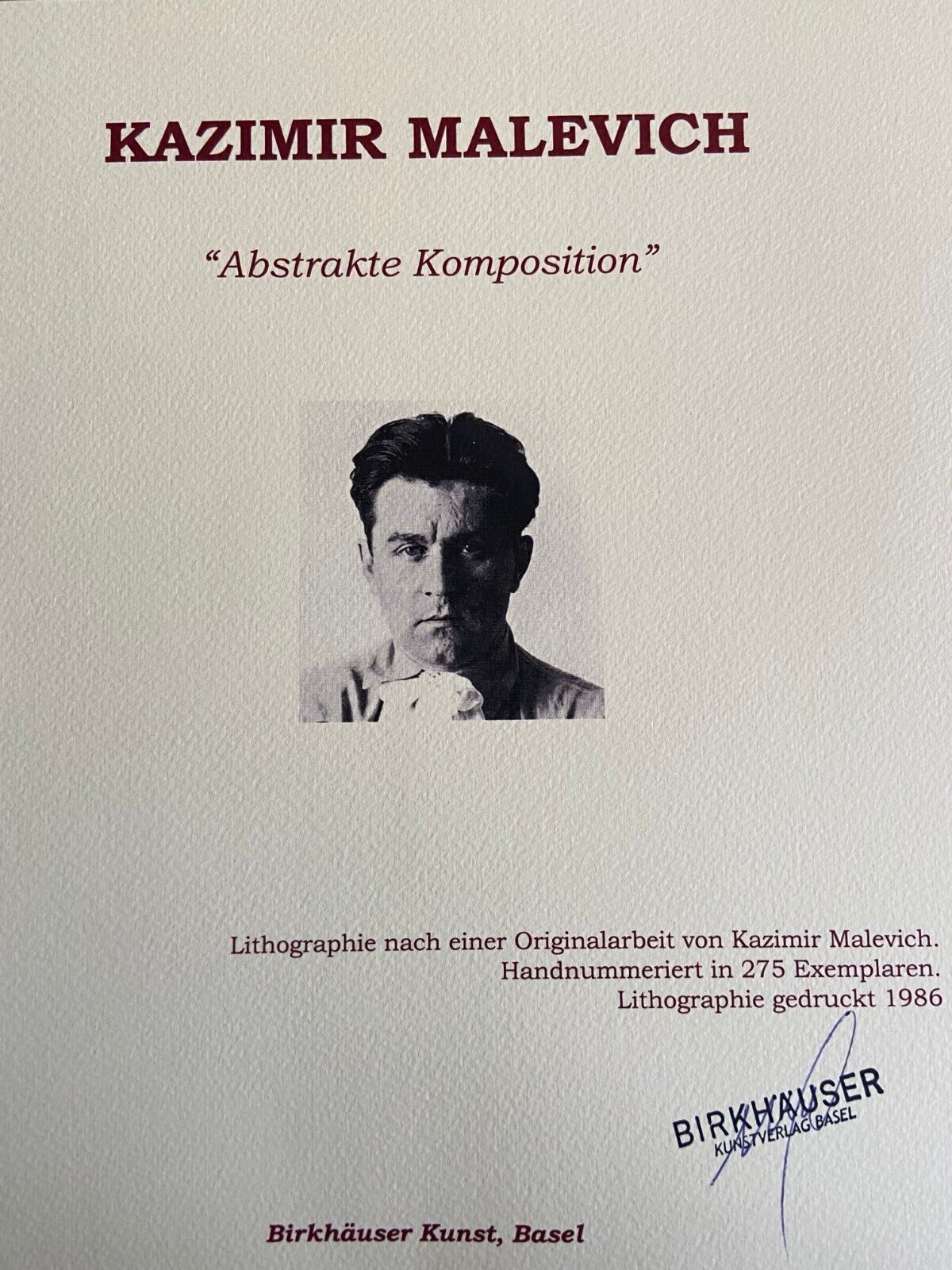 Kazimir Malevich " Abstract composition " Lithograph of an work by Kazimir Malevich , printed in 1986. 32 x 32 cm 275 examples hand-numbered plates Kazimir Malevich signs on the plate Birkhuser Kunstverlag, Basel Kazimir Malevich "Abstract composition" Lithograph of an work by Kazimir Malevich , printed in 1986. 32 x 32 cm 275 exampleshand-numbered plates Kazimir Malevich signs on the plate Birkhuser Kunstverlag, Basel