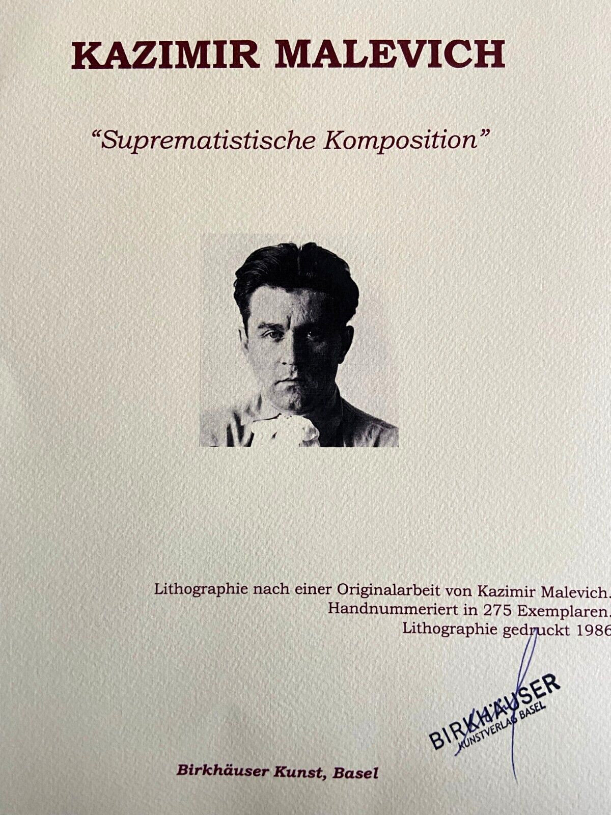 Kazimir Malevich Lithograph Signed COA Numbered /Piet Mondrian/ Kazimir Malevich " Suprematist composition " Lithograph of an work by Kazimir Malevich , printed in 1986. 32 x 32 cm 275 hand numbered specimens Kazimir Malevich signature on the slab Birkhuser Kunstverlag, Basel Kazimir Malevich "Suprematist composition" Lithograph of an work by Kazimir Malevich , printed in 1986. 32 x 32 cm 275 hand numbered specimens Kazimir Malevich signature on the slab Birkhuser Kunstverlag, Basel
