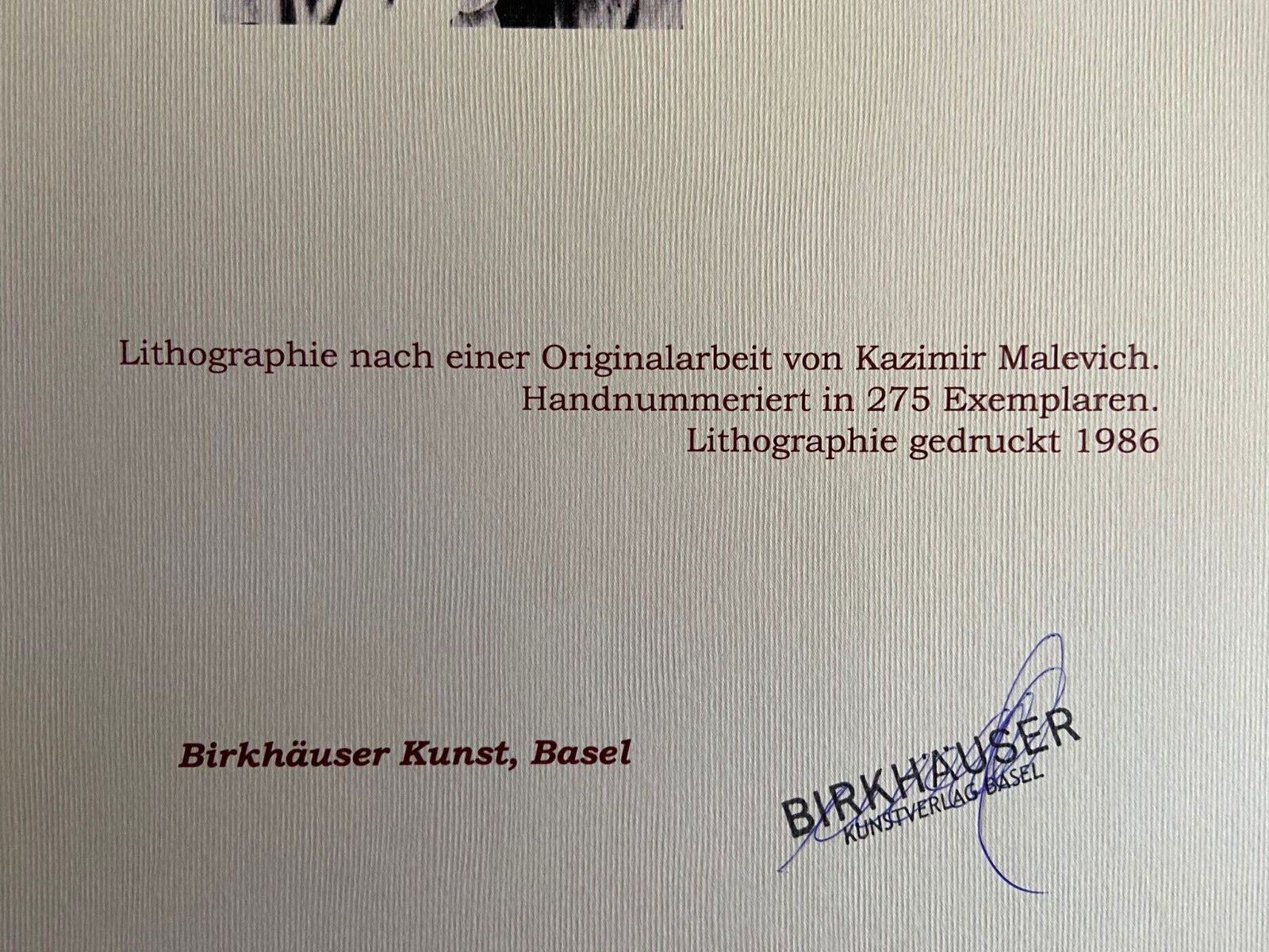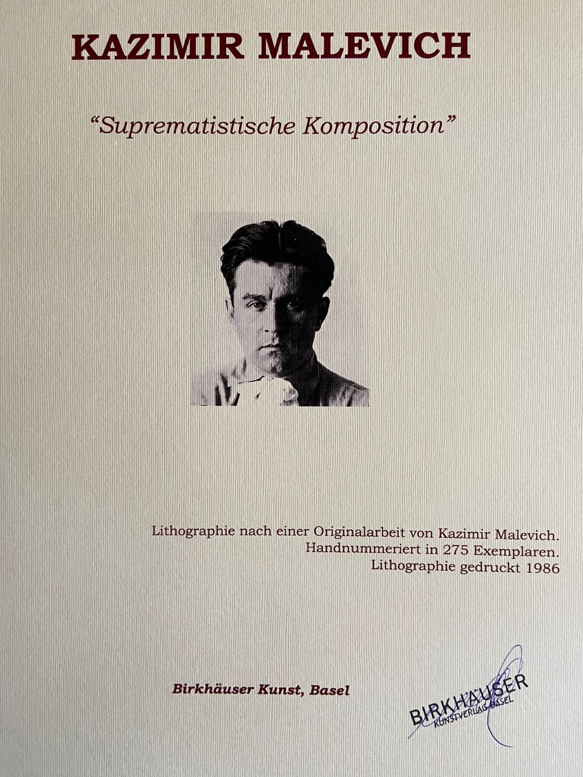 Kazimir Malevich Lithograph Hand Numbered COA (Josef Albers) Kazimir Malevich "Suprematist composition " Lithograph of an work by Kazimir Malevich , printed in 1986. 28 x 40 cm 275 EXEM hand numbered Kazimir Malevich signature on the slab The progressive number could be different from the published one. Birkhuser Kunstverlag, Basel Kazimir Malevich "Suprematist composition" Lithograph of an work by Kazimir Malevich , printed in 1986. 28 x 40 cm 275 EXEMhand numbered Kazimir Malevich signature on the slab The progressive number could be different from the published one. Birkhuser Kunstverlag, Basel