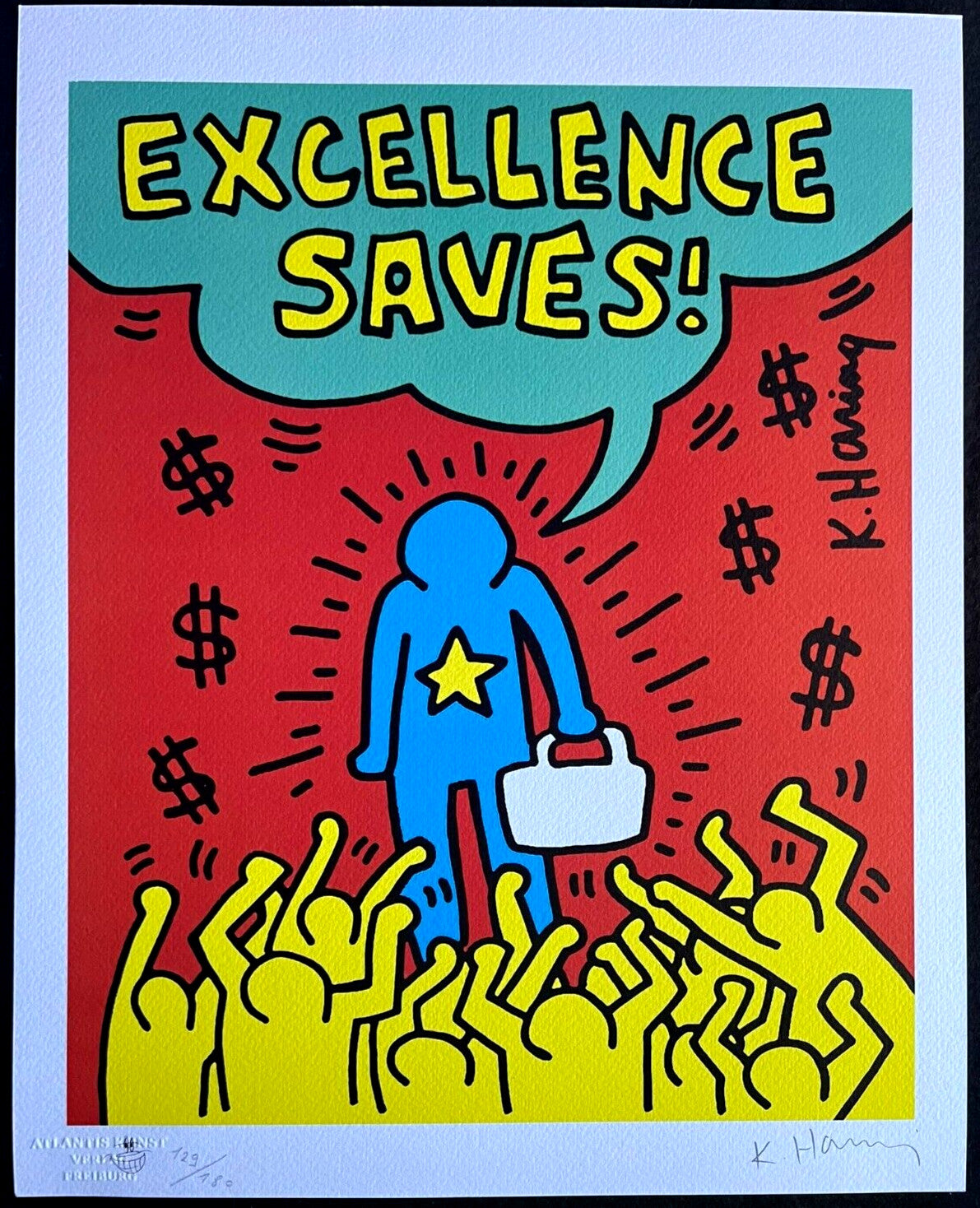 Keith Haring Lithograph Certified COA Signed In Pen Numbered In Pencil Keith Haring " Excellence saves " Chromolithography printed in 1989 in 180 specimens by Atlantis Verlag, Freiburg 32 x 40 cm Keith Haring signature on the slab - COA signed in Penna Dry and authentic stamp of the publishing house Atlantis Kunst Verlag Freiburg Keith Haring "Excellence saves" Chromolithography printed in 1989 in 180 specimens by Atlantis Verlag, Freiburg 32 x 40 cm Keith Haring s......