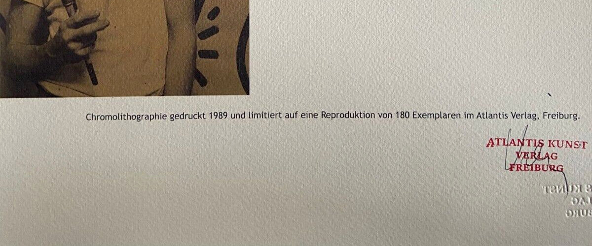 Keith Haring Lithograph Signed And Numbered By Hand Stamp Keith Haring " without title " Chromolithograph printed in 1989 in 180 copies by Atlantis Verlag, Freiburg 32 x 40 cm Keith Haring signature on the plate Dry and authentic stamp of the publishing house The progressive number could be different from the published one. Atlantis Kunst Verlag Freiburg Keith Haring " without title" Chromolithograph printed in 1989 in 180 copies by Atlantis Verlag, Freiburg 32 x 40 cm Keith Haring signature on the plate Dry and authentic stamp of the publishing house The progressive number could be different from the published one. Atlantis Kunst Verlag Freiburg