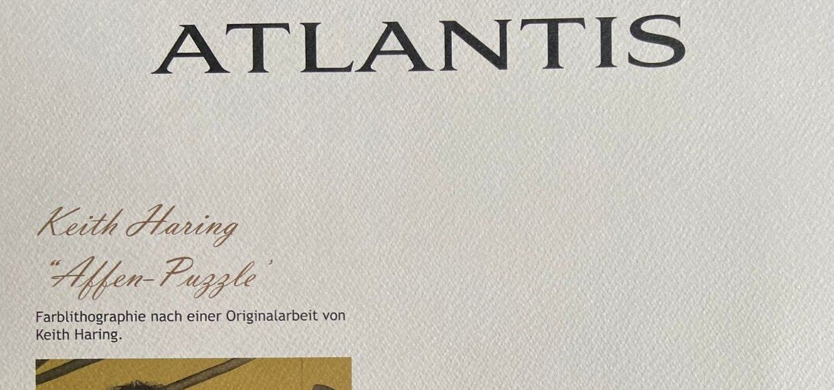 Keith Haring Lithograph From A Painting. COA Signed In Pen. Numbered In Pencil Keith Haring " Puzzle of the monkey " Chromolithography printed in 1989 and reproduced in 180 specimens by Atlantis Verlag, Freiburg 31 x 33 cm Keith Haring signature on the slab Dry and authentic stamp of the publishing house The progressive number could be different from the published one. Atlantis Kunst Verlag Freiburg Keith Haring "Puzzle of the monkey" Chromolithography printed in 1989 and reproduced in 180 specimens by Atlantis Verlag, Freiburg 31 x 33 cm Keith Haring signature on the slab Dry and authentic stamp of the publishing house The progressive number could be different from the published one. Atlantis Kunst Verlag Freiburg