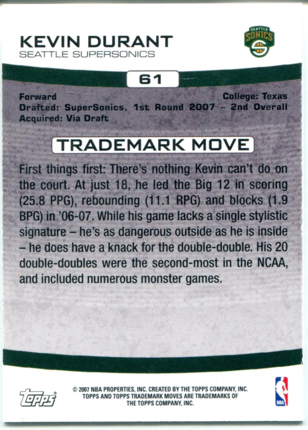 Kevin Durant 2007-08 Topps Trademark Moves Rookie Card #532/1999