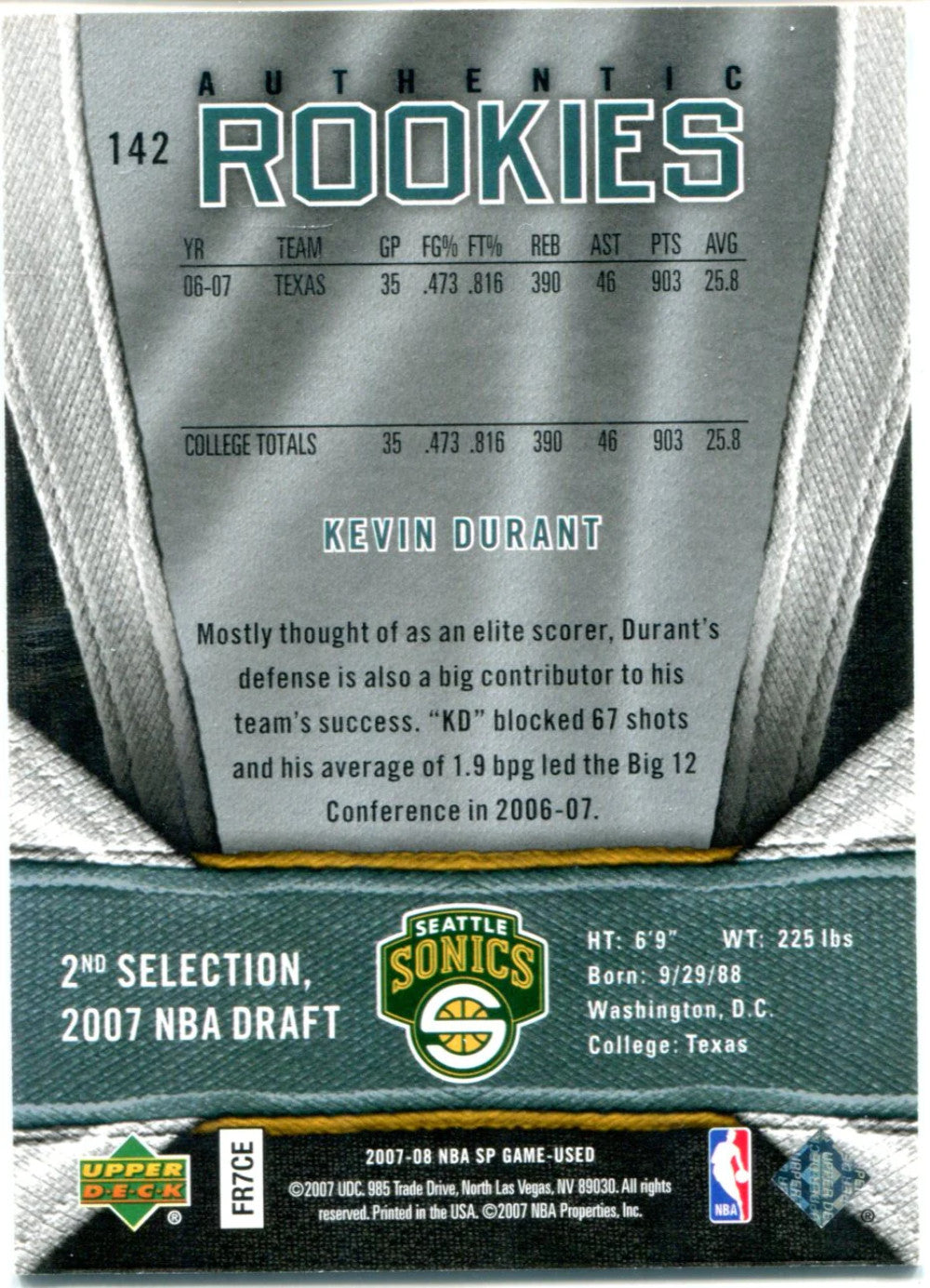 Kevin Durant 2007-08 Upper Deck Authentic Rookies Card #838/999