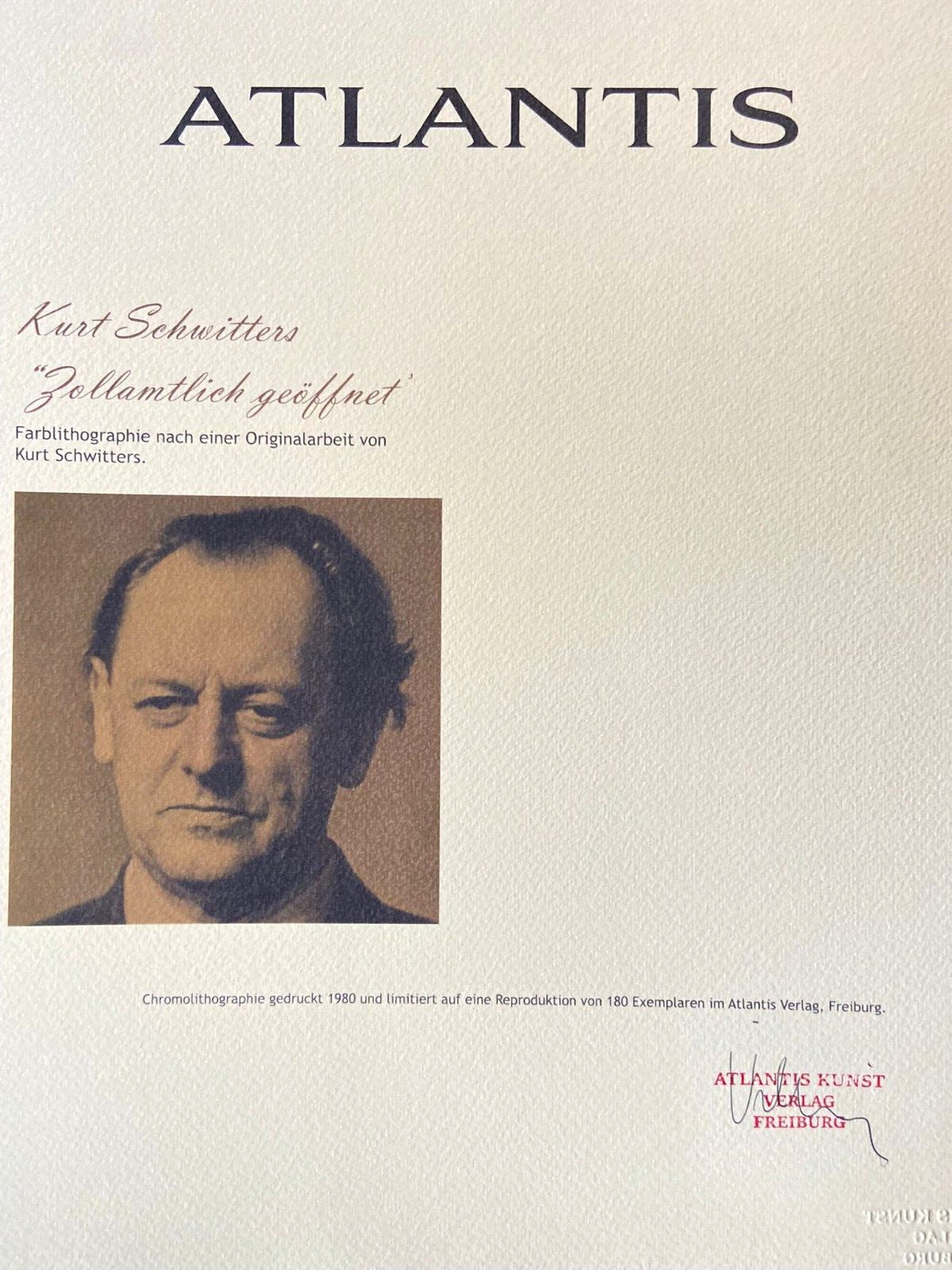 'Merz's language now finds a common consensus and today there is almost no artist working with materials other than painting who does not relate in some way to Schwitters. In his bold and wide-ranging experiments he can be seen as the forerunner of Pop Art, Happenings, Concept Art, Fluxus, multimedia art and postmodernism.' Excerpt from Gwendolyn Webster Kurt Schwitters " Customs open " Chromolithograph printed in 1980 in 180 copies by Atlantis Verlag, Freiburg 31 x 40......