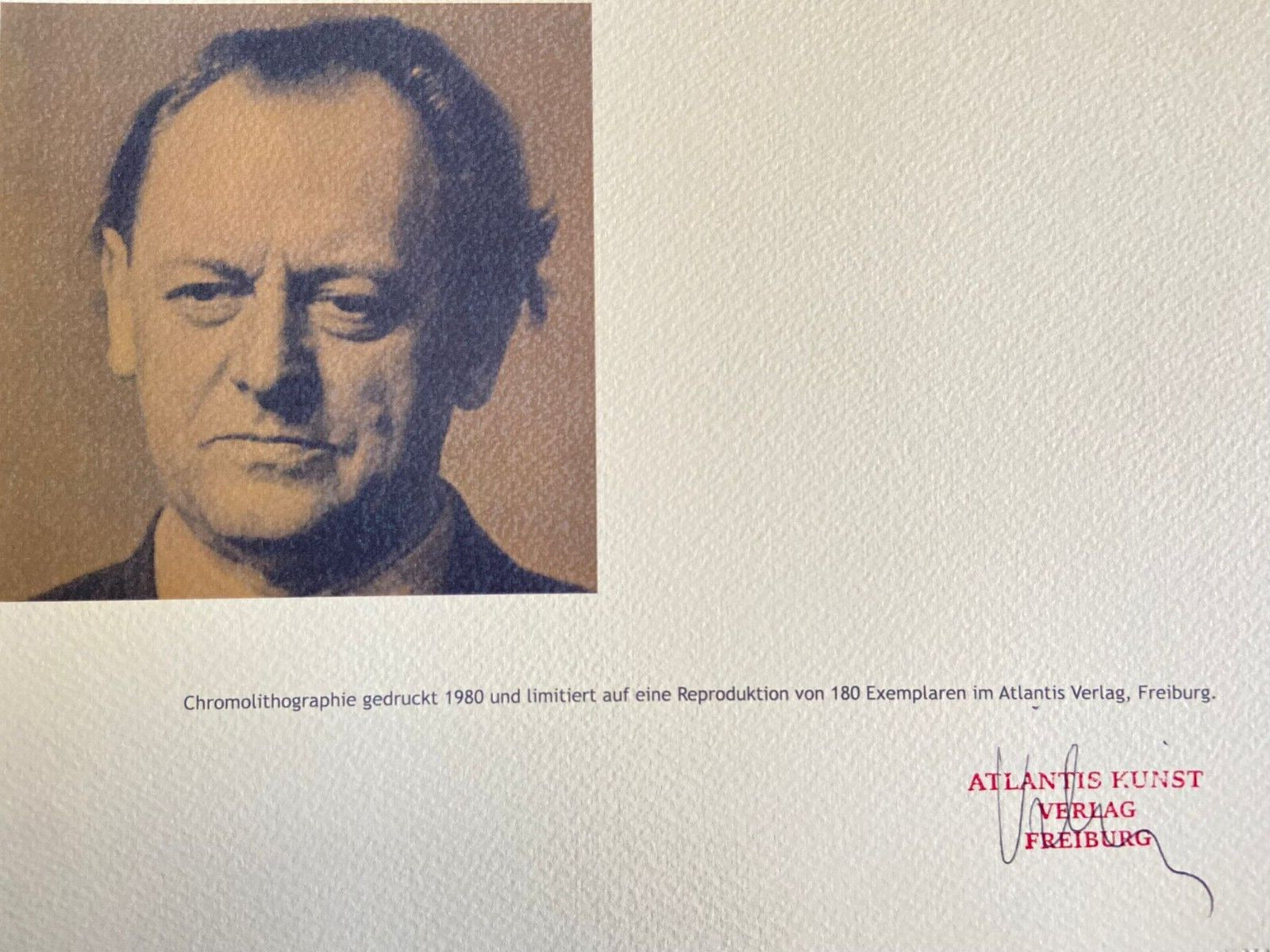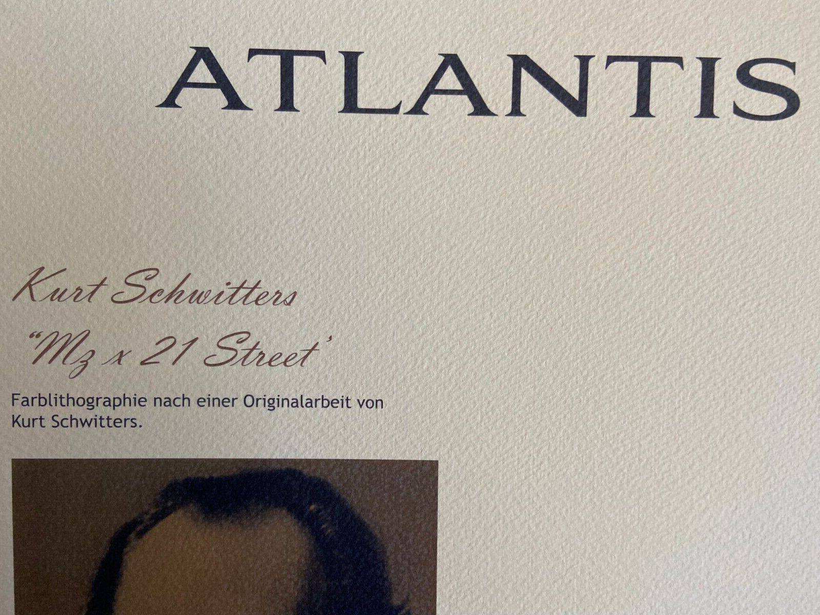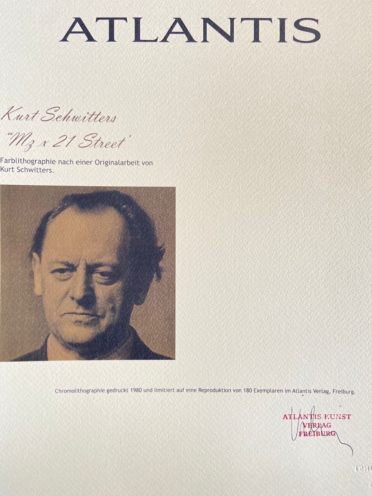 Kurt Schwitters " Via Mz x 21 " Chromolithograph printed in 1980 in 180 copies by Atlantis Verlag, Freiburg 32 x 40 cm Signature Kurt Schwitters on the plate Embossed stamp and authentication by the publishing house The progressive number may be different from the one published. Atlantis Kunst Verlag Freiburg 'Merz's language now finds a common consensus and today there is almost no artist working with materials other than painting who does not relate in some way to Schwitters. In his bold and wide-ranging experiments he can be seen as the forerunner of Pop Art, Happenings, Concept Art, Fluxus, multimedia art and postmodernism.' Excerpt from Gwendolyn Webster Kurt Schwitters "Via Mz x 21" Chromolithograph printed in 1980 in 180 copies by Atlantis Verlag, Freiburg 32 x 40 cm SignatureKurt Schwitterson the plate Embossed stamp and authentication by the publishing house The progressive number may be different from the one published. Atlantis Kunst Verlag Freiburg 'Merz's language now finds a common consensus and today there is almost no artist working with materials other than painting who does not relate in some way to Schwitters. In his bold and wide-ranging experiments he can be seen as the forerunner of Pop Art, Happenings, Concept Art, Fluxus, multimedia art and postmodernism.' Excerpt from Gwendolyn Webster