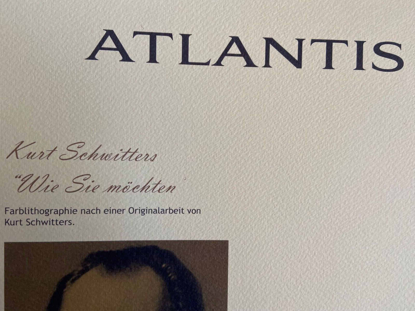 'Merz's language now finds a common consensus and today there is almost no artist working with materials other than painting who does not relate in some way to Schwitters. In his bold and wide-ranging experiments he can be seen as the forerunner of Pop Art, Happenings, Concept Art, Fluxus, multimedia art and postmodernism.' Excerpt from Gwendolyn Webster Kurt Schwitters " As you like " Chromolithograph printed in 1980 in 180 copies by Atlantis Verlag, Freiburg 32 x 40 cm Signature Kurt Schwitters on the plate Embossed stamp and authentication by the publishing house The progressive number may be different from the one published. Atlantis Kunst Verlag Freiburg 'Merz's language now finds a common consensus and today there is almost no artist working with materials other than painting who does not relate in some way to Schwitters. In his bold and wide-ranging experiments he can be seen as the forerunner of Pop Art, Happenings, Concept Art, Fluxus, multimedia art and postmodernism.' Excerpt from Gwendolyn Webster Kurt Schwitters "As you like" Chromolithograph printed in 1980 in 180 copies by Atlantis Verlag, Freiburg 32 x 40 cm SignatureKurt Schwitterson the plate Embossed stamp and authentication by the publishing house The progressive number may be different from the one published. Atlantis Kunst Verlag Freiburg