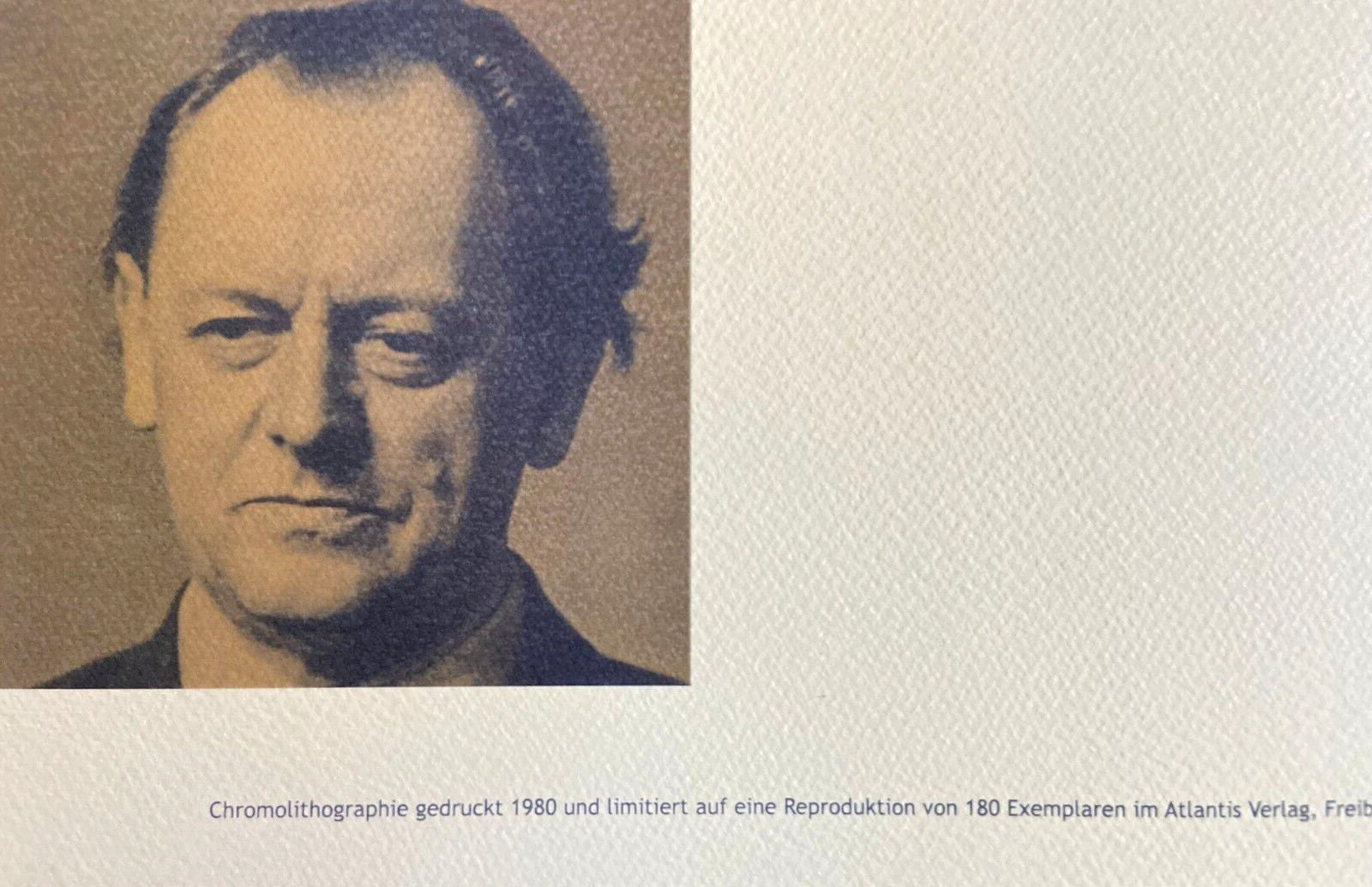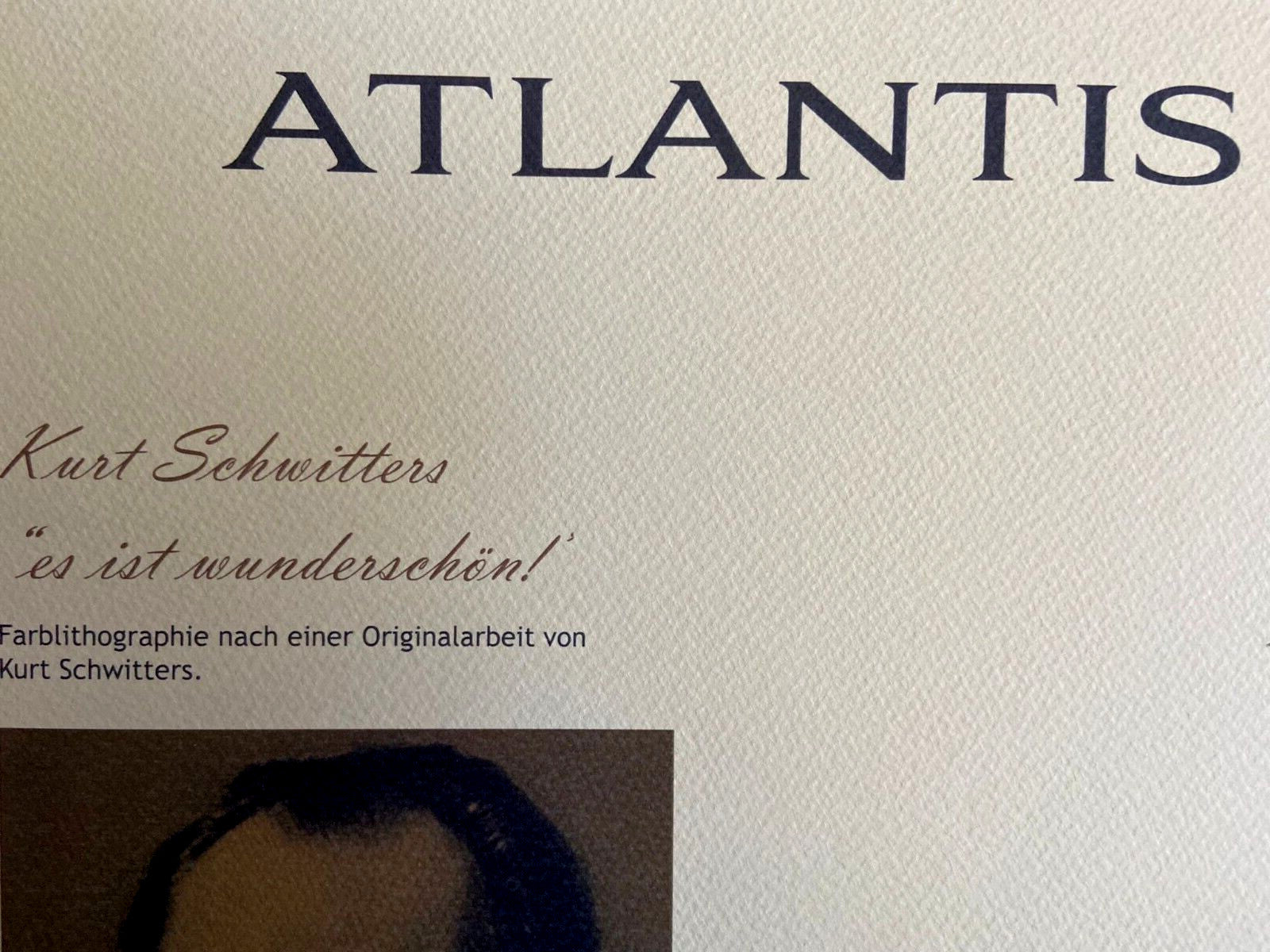 'Merz's language now finds a common consensus and today there is almost no artist working with materials other than painting who does not relate in some way to Schwitters. In his bold and wide-ranging experiments he can be seen as the forerunner of Pop Art, Happenings, Concept Art, Fluxus, multimedia art and postmodernism.' Excerpt from Gwendolyn Webster Kurt Schwitters " It's wonderful! " Chromolithograph printed in 1980 in 180 copies by Atlantis Verlag, Freiburg 28 x 45 cm Signature Kurt Schwitters on the plate Embossed stamp and authentication by the publishing house The progressive number may be different from the one published. Atlantis Kunst Verlag Freiburg In 1918 he made his first abstract collages, which he called "Merz", a fragment of the word "Commerzbank". He continued these collages alongside work as a commercial artist, graphic designer and printmaker. In his collages he used junk materials such as labels, cards and broken pieces of wood, which paved the way for later movements such as pop art. 'Merz's language now finds a common consensus and today there is almost no artist working with materials other than painting who does not relate in some way to Schwitters. In his bold and wide-ranging experiments he can be seen as the forerunner of Pop Art, Happenings, Concept Art, Fluxus, multimedia art and postmodernism.' Chromolithograph printed in 1980 in 180 copies by Atlantis Verlag, Freiburg The progressive number may be different from the one published. In 1918 he made his first abstract collages, which he called "Merz", a fragment of the word "Commerzbank". He continued these collages alongside work as a commercial artist, graphic designer and printmaker. In his collages he used junk materials such as labels, cards and broken pieces of wood, which paved the way for later movements