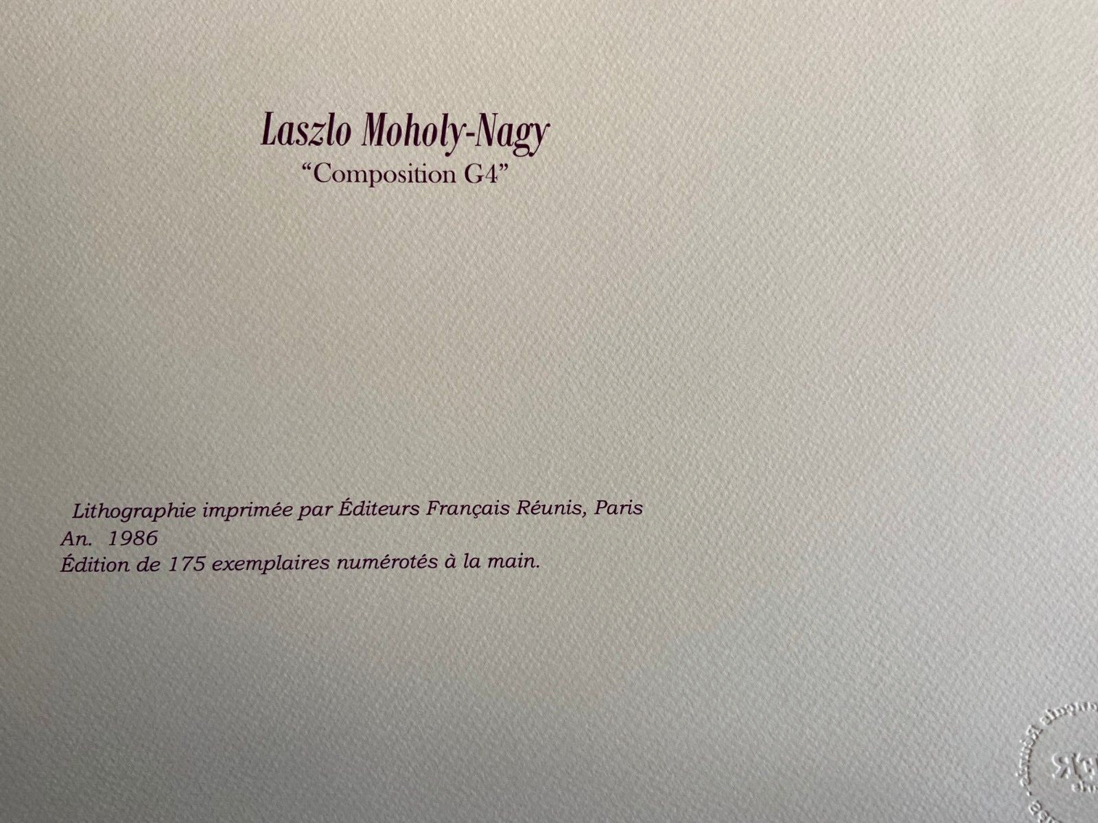 Laszlo Moholy-Nagy ''Composition G4" Lithograph printed by Editori Francesi Riuniti in 1986. Laszlo Moholy-Nagy signature on the plate. The work measures 32x40 cm 175 specimens EFR, Paris Laszlo Moholy-Nagy ''Composition G4" Lithograph printed by Editori Francesi Riuniti in 1986. Laszlo Moholy-Nagy signature on the plate. The work measures 32x40 cm 175 specimens © EFR, Paris