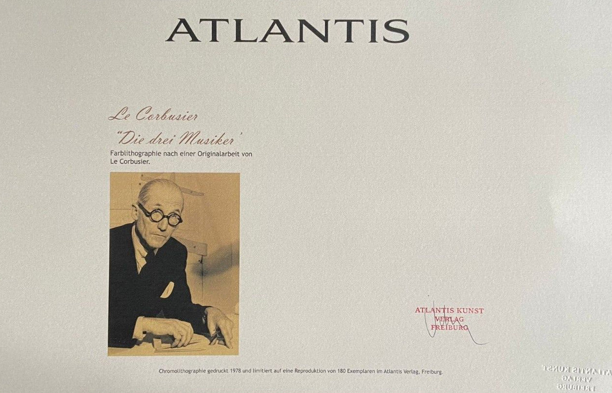 Le Corbusier Lithograph COA Signed Numbered By Hand 180 Le Corbusier "The three musicians " Chromolithography printed in 1978 in 180 specimens by Atlantis Verlag, Freiburg 27 x 43 cm Signs Le Corbusier on the slab Dry and authentic stamp of the publishing house The progressive number could be different from the published one. Atlantis Kunst Verlag Freiburg Le Corbusier "The three musicians" Chromolithography printed in 1978 in 180 specimens by Atlantis Verlag, Frei......