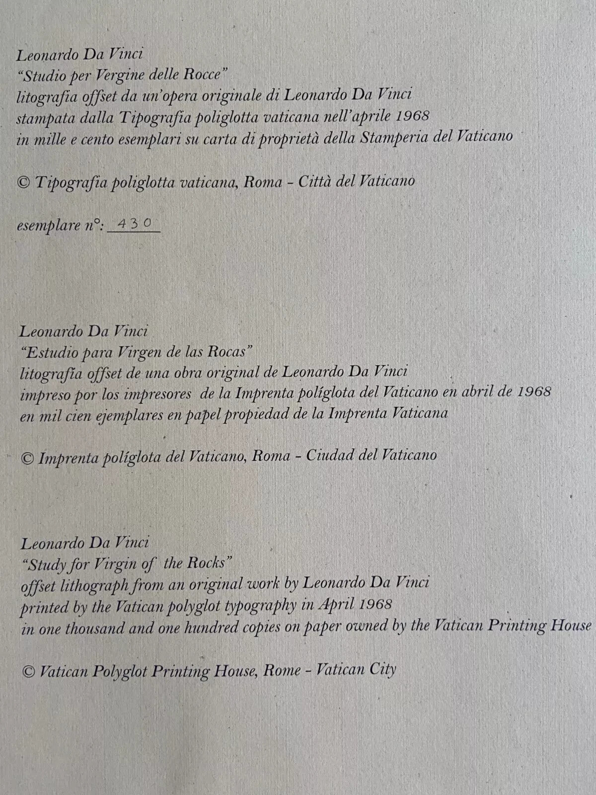 Leonardo Da Vinci Lithograph From A COA Signed Numbered Pastel (Paul Klee) Leonardo da Vinci '' Study for the Madonna delle Rocce '' It operates by an Lithograph by Maestro Leonardo da Vinci , printed by the Vatican Polyglot Typography in April 1968. I signs Leonardo da Vinci on the slab. The graphic work measures 30.5 x 41.5 cm The edition is 1100 hand numbered specimens on paper owned by the Vatican Stamperia Vatican Polyglot Typography, Rome- Vatican City Like Ed......