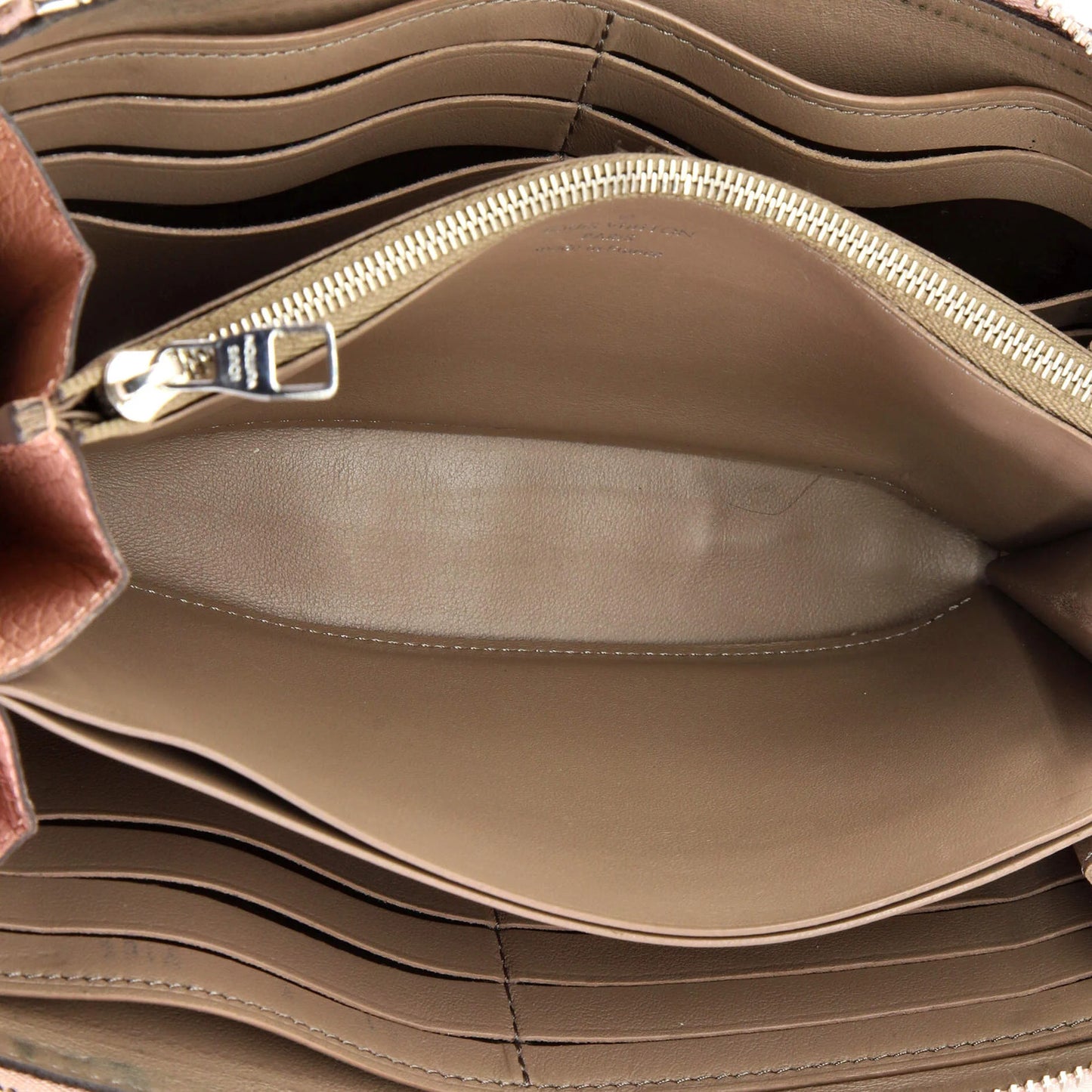 Condition: Good. Moderate wear, creasing and minor darkening on exterior, cracking on exterior wax edges. Wear and scuffs in interior, darkening in interior pocket, scratches and discoloration on hardware.