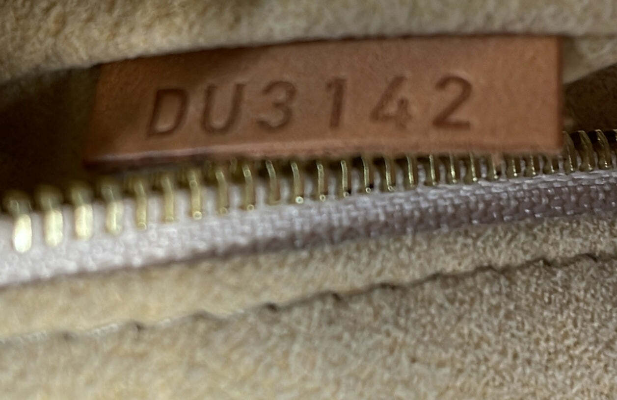 Condition: Very good. Odor in interior. Creasing, wear and minor discoloration on exterior, darkening, scuffs, wear and watermarks on leather trims and handles. Wear, minor marks and slight darkening in interior, scratches and slight tarnish on hardware.