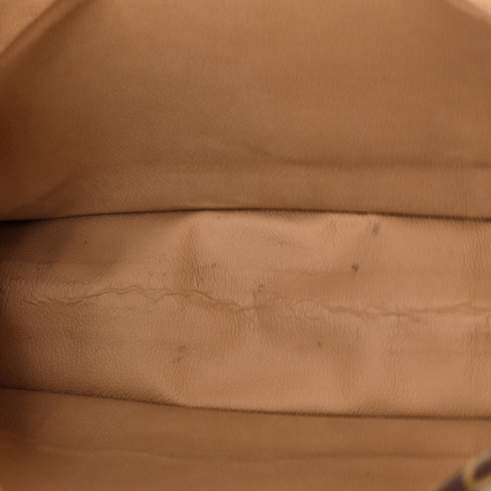 Condition: Good. Exterior: Leather trims, scuffs, creases, edge wear, corner wear, discoloration. Handles/Straps: heavy discoloration, scuffs. Interior: Small glue stains, bubbling along edges, moderate odor. Hardware: scratches