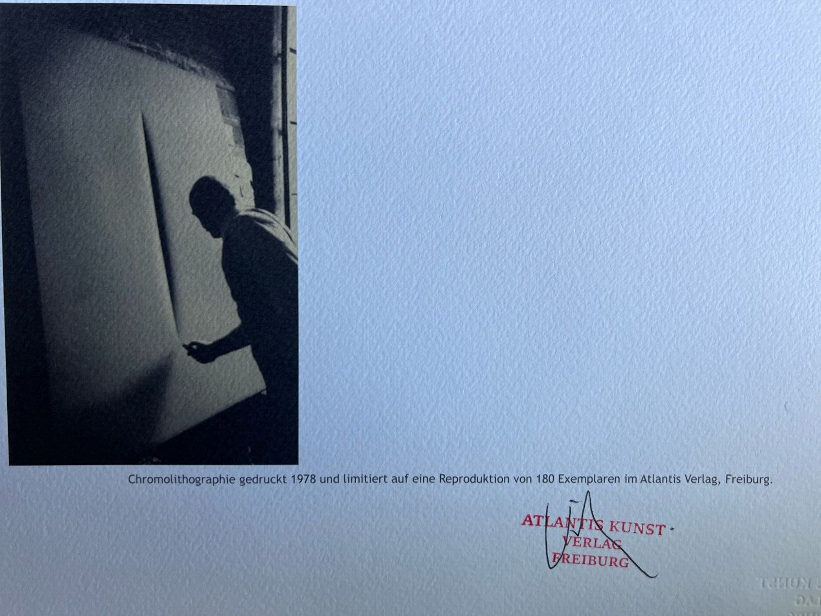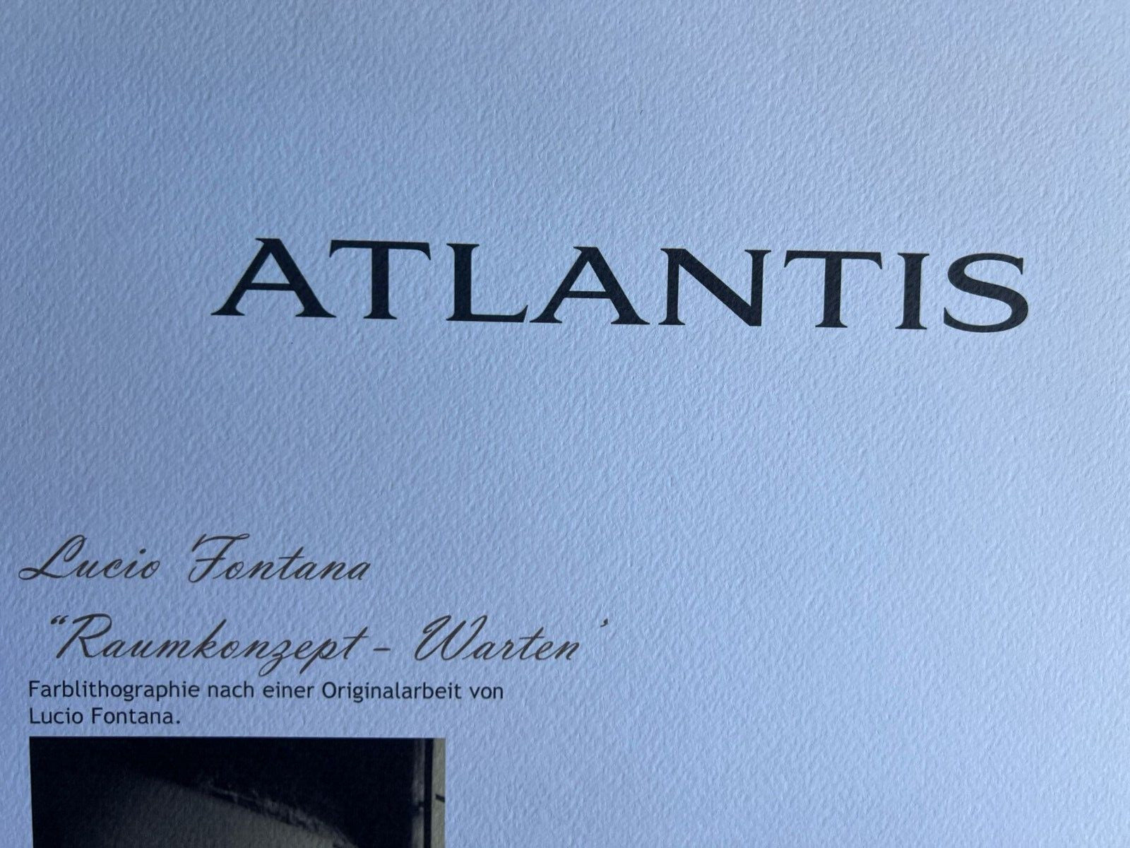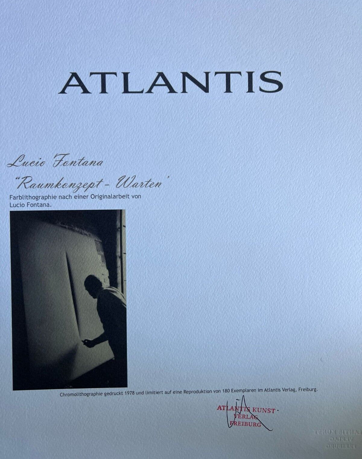 Lucio FONTANA Lithograph [ Signed COA] Numbered In Pencil Lucio FONTANA " Space concept- Warter " Chromolithography printed in 1978 In 180 specimens from Atlantis Verlag, Freiburg 32 x 39 cm Signature Lucio FONTANA on the COA slab signed in Penna Dry and authentic stamp of the publishing house Atlantis Kunst Verlag Freiburg Lucio FONTANA "Space concept- Warter" Chromolithography printed in 1978In 180 specimens from Atlantis Verlag, Freiburg 32 x 39 cm Signature Lucio FONTANA on the COA slab signed in Penna Dry and authentic stamp of the publishing house Atlantis Kunst Verlag Freiburg Related keywords signed lithograph lucio fontana lithograph signed numbered fontana lithograph signed art signed signed signed print lithograph prints signed lithograph framed lithograph lithograph print etching signed numbered etching signed signed art lithograph signed limited edition lithograph signed numbered framed signed numbered signed lithograph framed art prints signed and numbered lithograph print signed lucio fontana signed lithograph signed lithograph signed andy warhol hand signed coa signed lithograph pencil signed lithograph Provided by