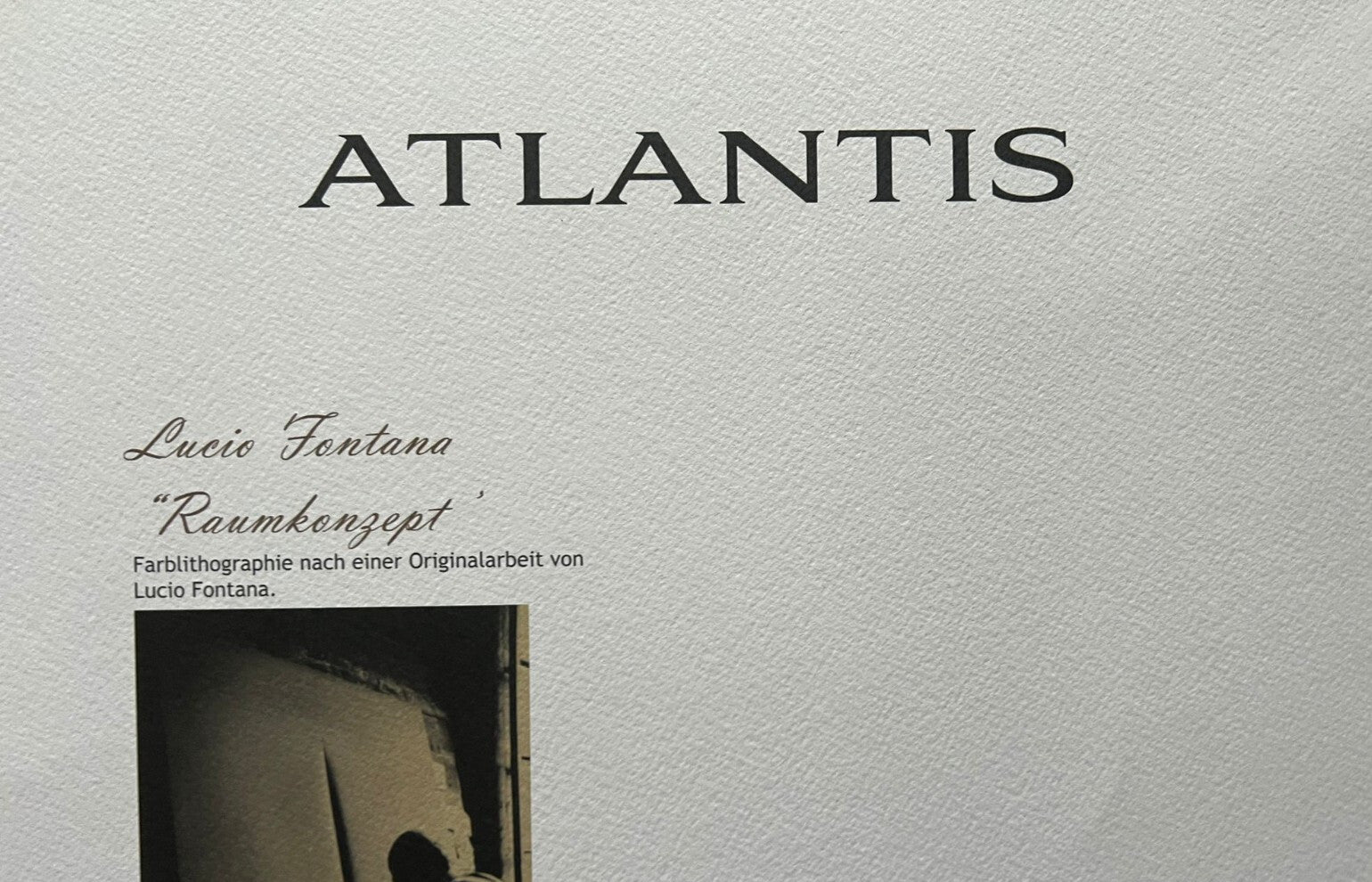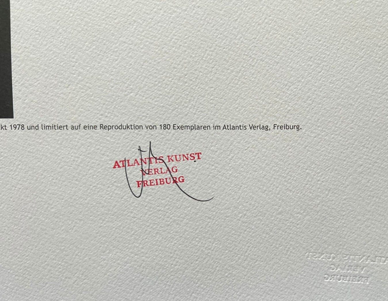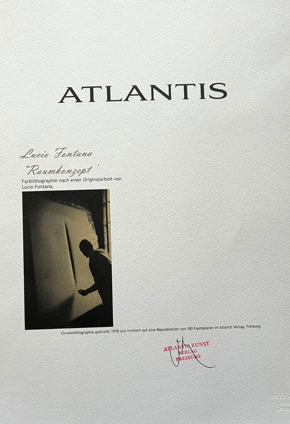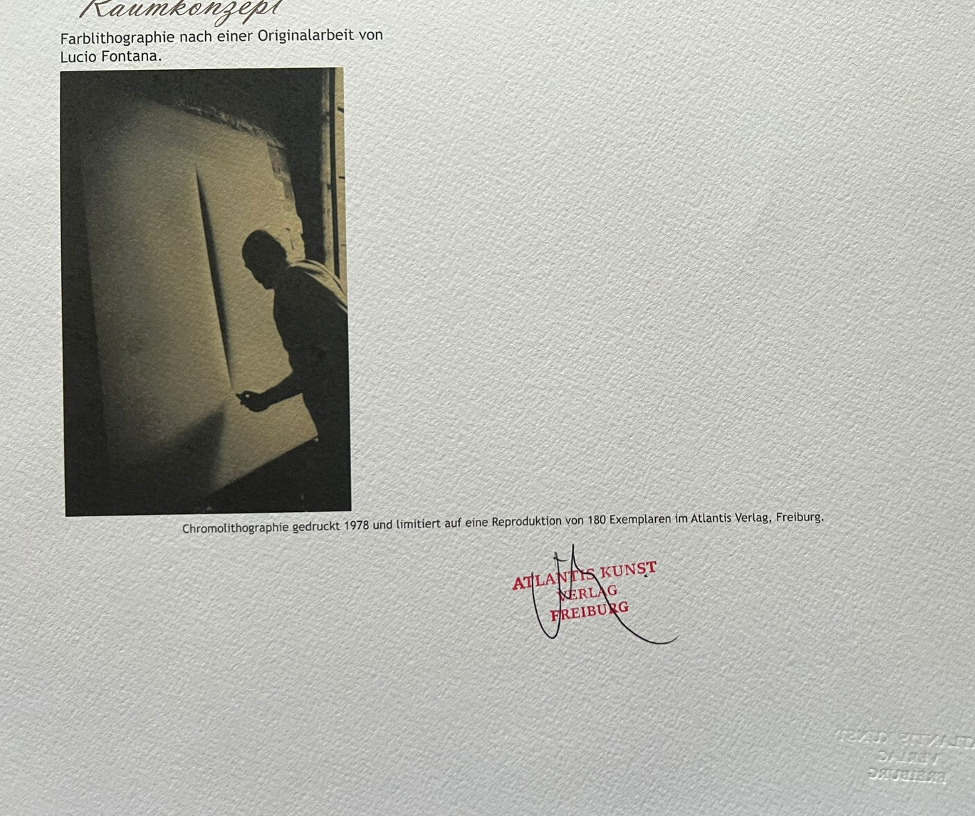Lucio FONTANA Lithograph COA Signed In Pen Numbered In Pencil 180es Lucio FONTANA " Room concept " Chromolithography printed in 1978 In 180 specimens from Atlantis Verlag, Freiburg 32 x 44 cm Signature Lucio FONTANA on the COA slab signed in Penna Dry and authentic stamp of the publishing house Atlantis Kunst Verlag Freiburg Lucio FONTANA "Room concept" Chromolithography printed in 1978In 180 specimens from Atlantis Verlag, Freiburg 32 x 44 cm Signature Lucio FONTANA on the COA slab signed in Penna Dry and authentic stamp of the publishing house Atlantis Kunst Verlag Freiburg