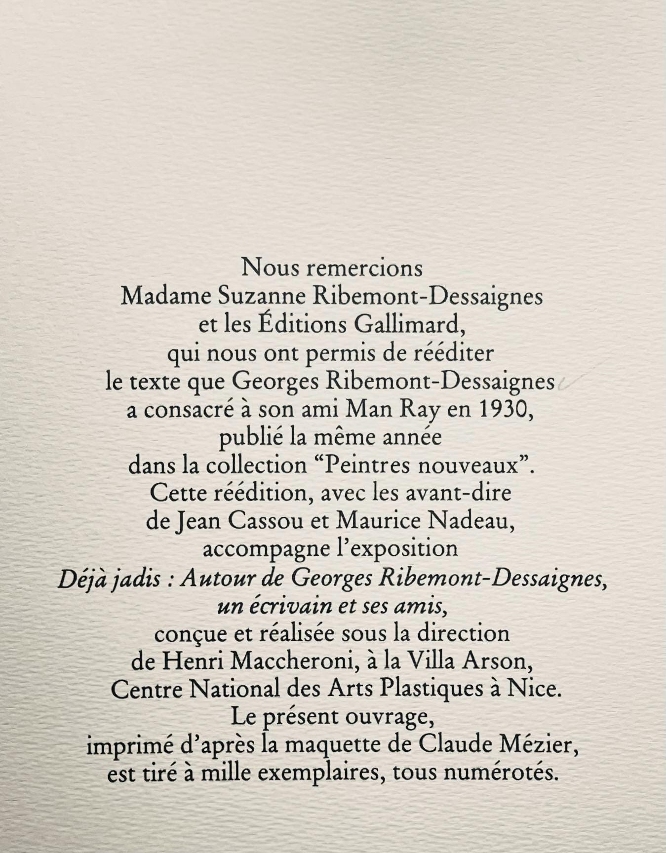 Suzanne Ribemont-Dessaignes and ditions Gallimard, which allowed us to reissue the text that Georges Ribemont-Dessaignes devoted to his friend Man Ray in 1930, published the same year in the collection "Peintres nouveaux" This reissue, with the forewords of Jean Cassou and Maurice Nadeau, accompanies the exhibition, Dj jadis: Autour de Georges Ribemont-Dessaignes, un crivain et ses amis, designed and produced under the direction of Henri Maccheroni, at the Villa Arson, Centre National des Arts Plastiques Nice.