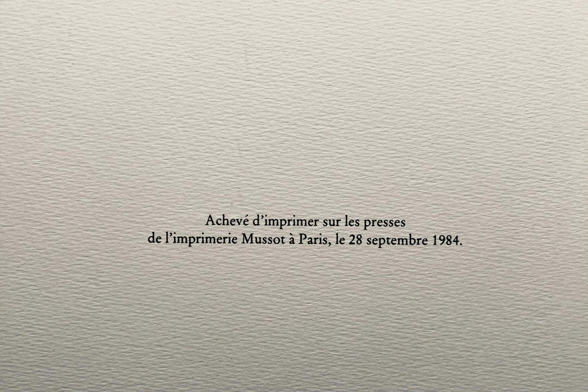 This book, printed after the model of Claude Mzier, is printed in M examples, all numbered. Finished printing on the presses of l'imprimerie Mussot in Paris, on September 28, 1984.