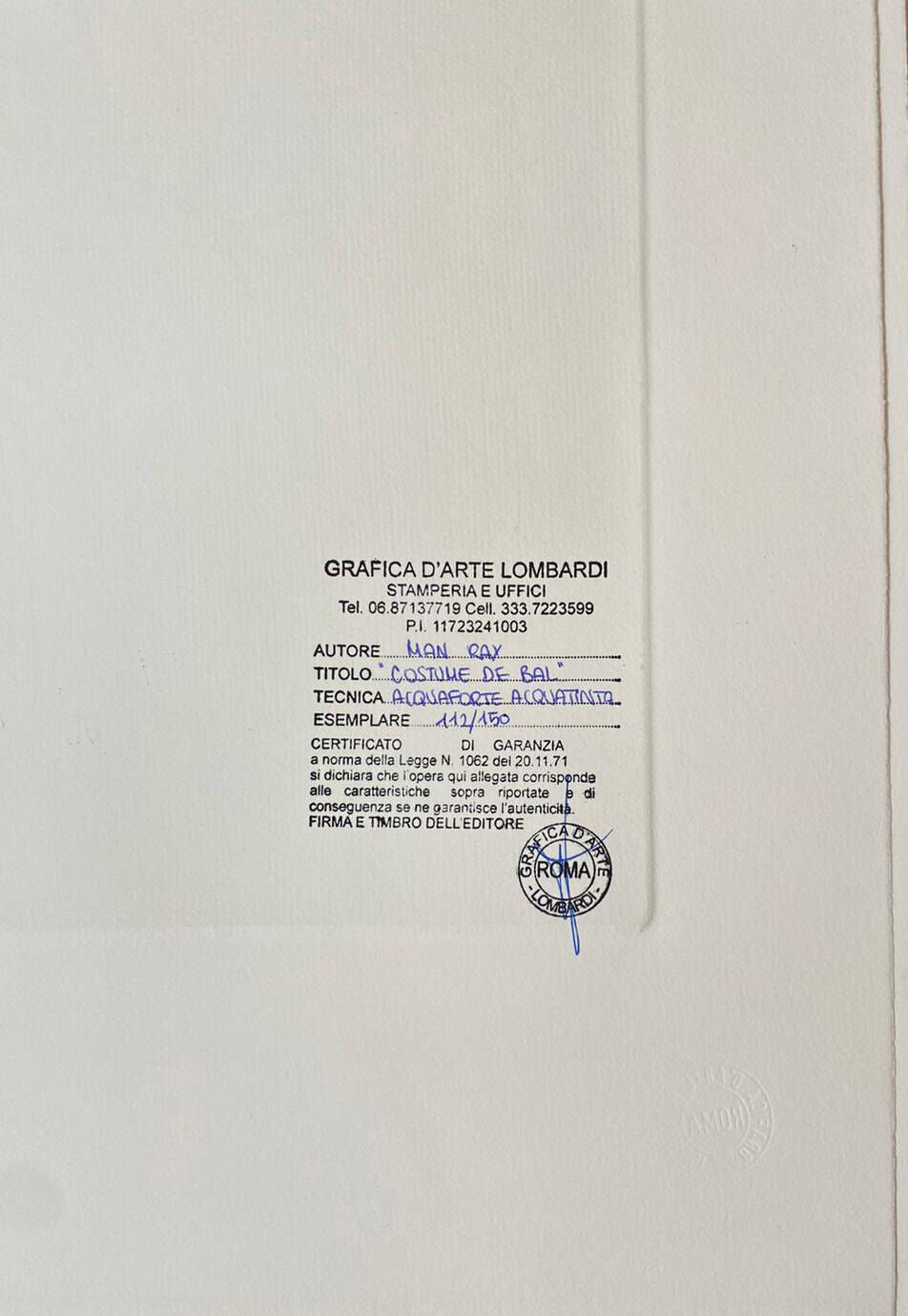Man Ray Handmade Etching Signed And Numbered Rare Man ray "Costume de Bal" Art folder containing a poem by Ezra Pound, a well -known friend of the artist to whom he dedicated a famous photographic portrait Gorgeous engraving preserved in perfect condition in its art folder, jealously preserved in dry and dark warehouse For collectors who want the entire folder, complete with the two engravings, just search in our shop numbered and hand signed by the master of his own hand 35x50 cm 150 specimens numbered copy historian 1975 certificate of authenticity According to the law dry stamp of the publisher Cleto Polcina Edizioni The progressive number could be different from that shown in the photo Our works are all in perfect condition and never framed, without the slightest defect and shipped in a flat or in an unassailable tube. For information you can contact us "Costume de Bal" Art folder containing a poem by Ezra Pound, a well -known friend of the artist to whom he dedicated a famous photographic portrait Gorgeous engraving preserved in perfect condition in its art folder, jealously preserved in dry and dark warehouse For collectors who want the entire folder, complete with the two engravings, just search in our shop numbered and hand signed by the master of his own hand 150 specimens numbered copy historian 1975 certificate of authenticityAccording to the law dry stamp of the publisher Cleto Polcina Edizioni The progressive number could be different from that shown in the photo Our works are all in perfect condition and never framed, without the slightest defect and shipped in a flat or in an unassailable tube. For information you c Related keywords etching man ray lithograph signed numbered etching signed signed etching etchings signed man ray art etching signed numbered etching signed signed etching signed etchings signed art man ray signed etching signed art prints signed and numbered ray harm prints signed and numbered etching framed man ray print etching signed limited edition etching signed- art prints etching signed louis icart etchings signed man ray signed etching rembrandt art print signed and numbered signed numbered etching signed etching lithograph signed numbered man in costume Provided by