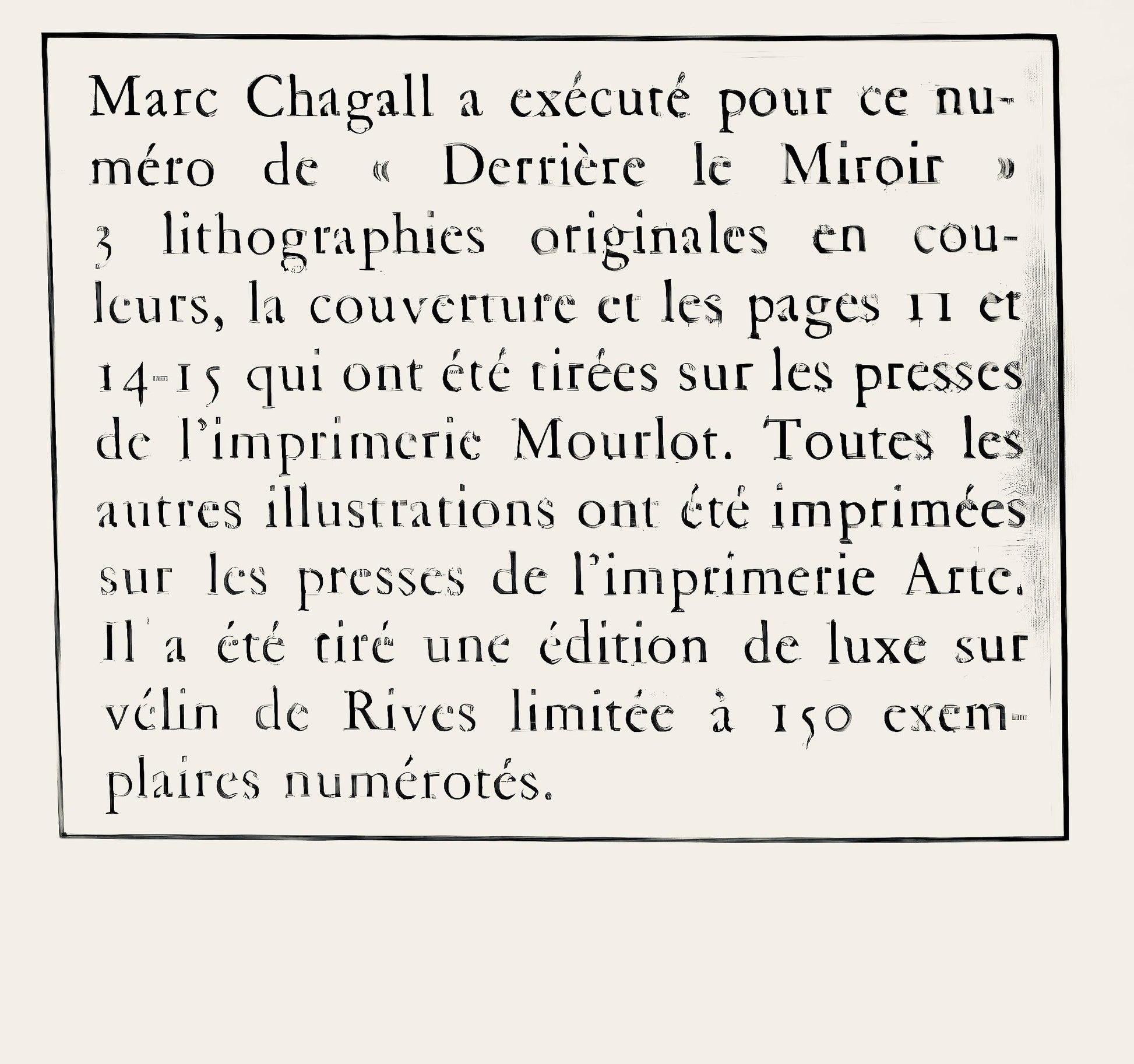 Excerpted from the volume (translated from French), Marc Chagall created for this issue of "Behind the Mirror," three original lithographs in colors, the cover and pages 11 and, 14-15 that were drawn from the presses of l'imprimerie Mourlot.