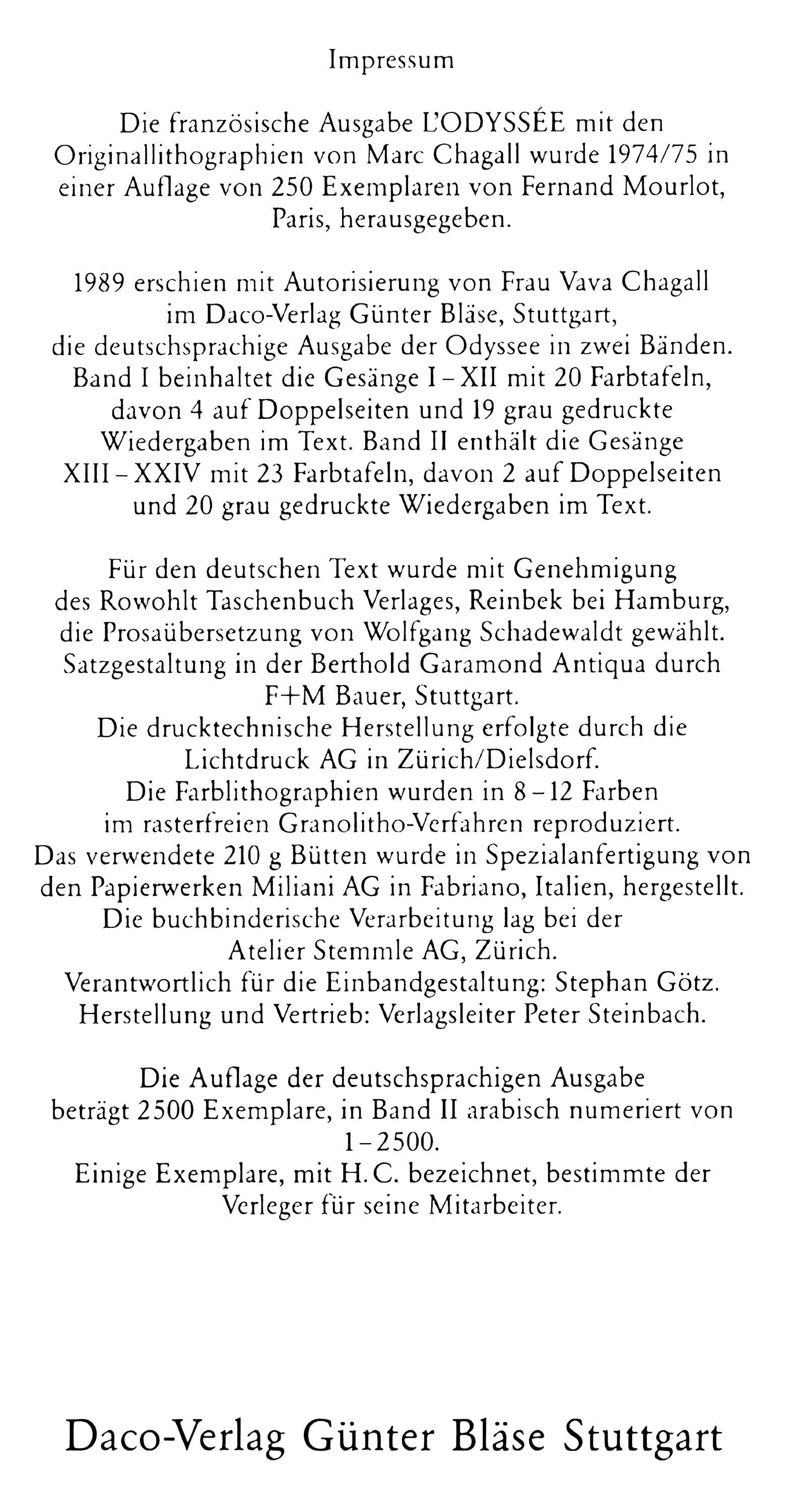Vava Chagall, the German-language edition of the Odyssey in two volumes was published by Daco-Verlag Gnter Blse, Stuttgart.