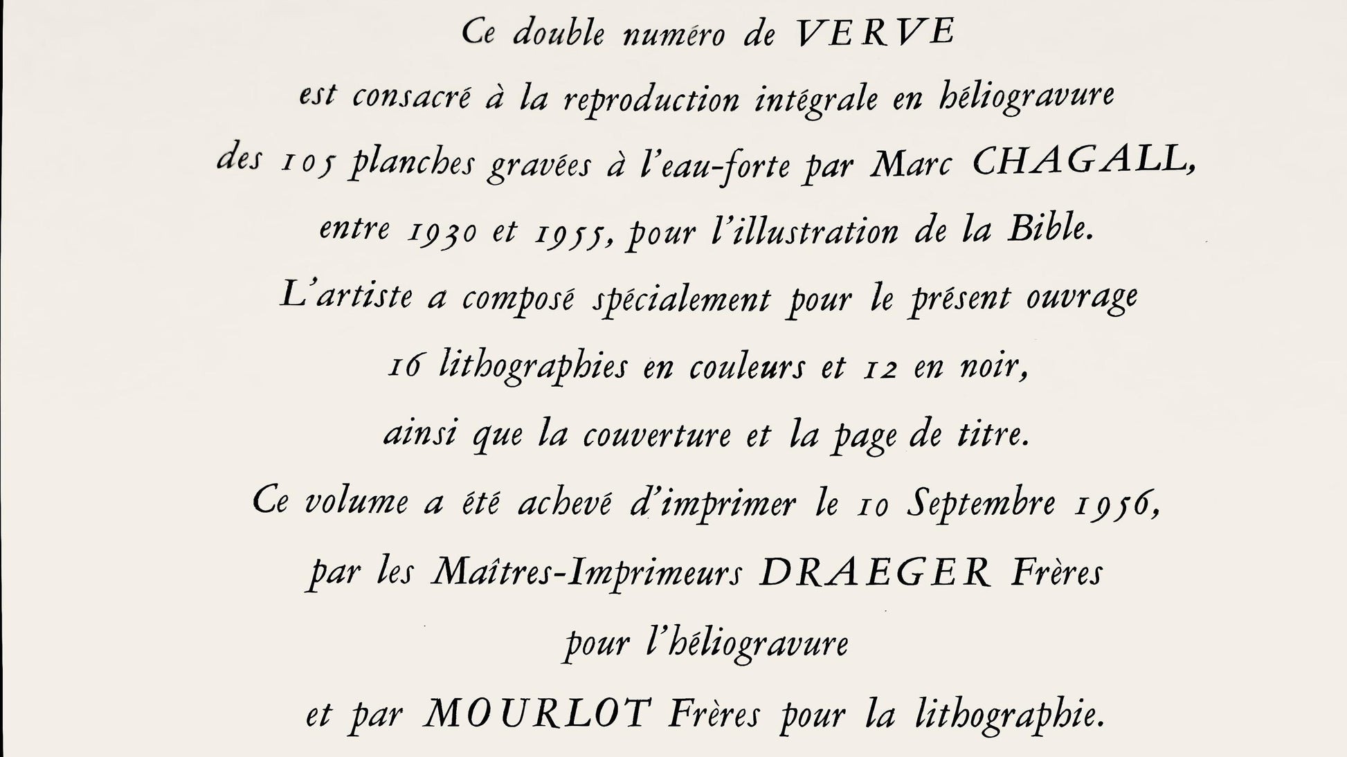 Excerpted from the album (translated from French), This double issue of Verve is dedicated to the full reproduction in hliogravure of the one hundred-five plates etched by Marc Chagall, between 1930 and 1955, for the illustration of the Bible.