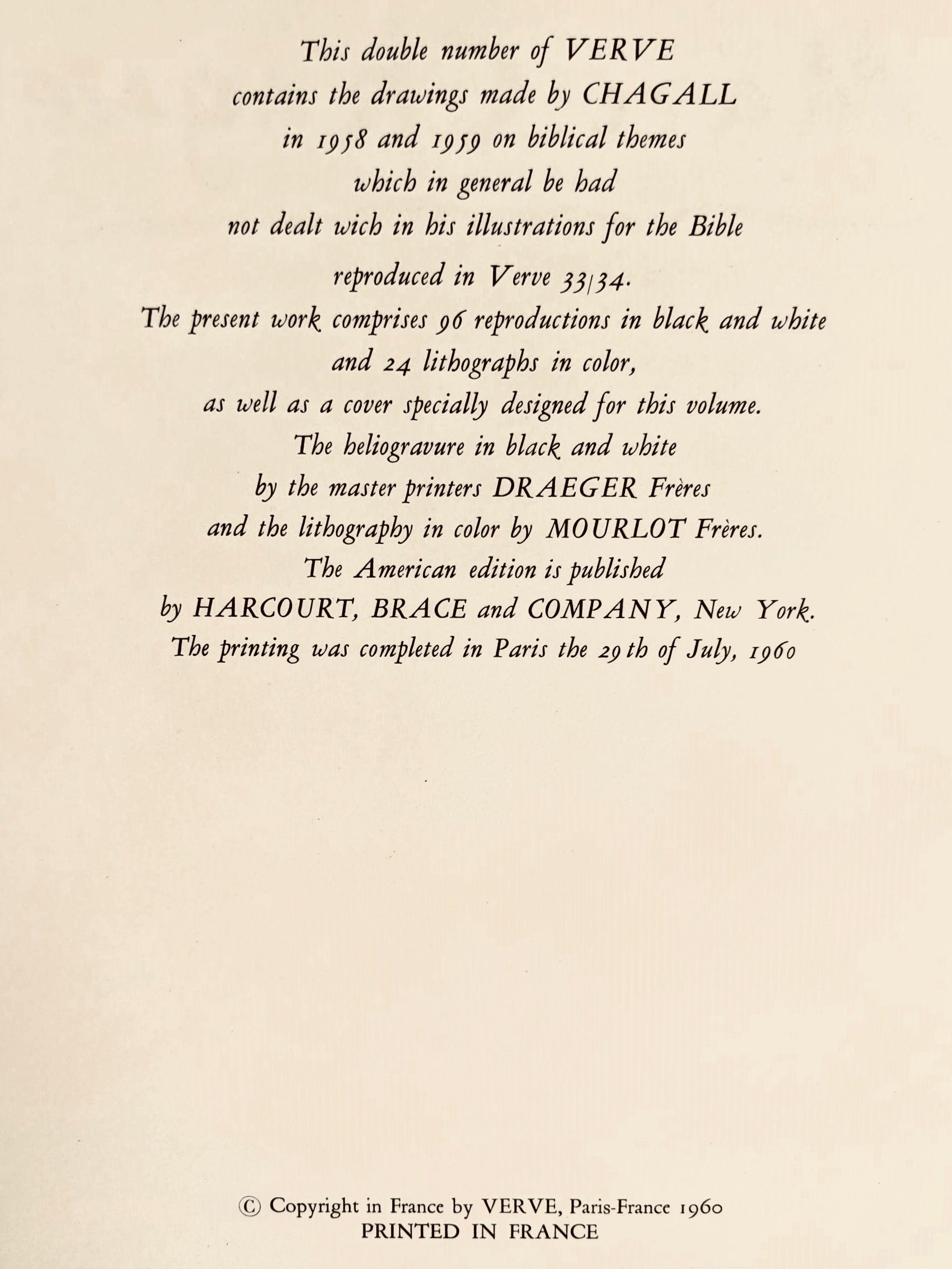 Lithograph on vlin des Papeteries du Marais paper. Unsigned and unnumbered. Paper Size: 14 x 10.5 inches. Excellent condition. Notes: From the volume, Drawings from the Bible by Marc Chagall, Verve: Revue Artistique et Littraire, Vol. VIII, N 33-34, 1960. Published by ditions de la revue Verve, Paris in collaboration with Harcourt Brace and Company, New York; printed by Mourlot Frres, Paris, July 20, 1960. Excerpted from the volume, This double number of Verve contains the drawings made by Chagall in 1958 and 1959 on biblical themes which in general be had not dealt with in bis illustrations for the Bible reproduced in Verve 33/34. The present work comprises go reproductions in black and white and 24 lithographs in color, as well as a cover specially designed for this volume. The heliogravure in black and white by the master printers Draeger Frres and the lithography in color by Mourlot Frres. The American edition is published by Harcourt, Brace and Company, New York. The printing was completed in Paris the 29th of July, 1960. Chagall, famous for the lyric quality of his art, has been in the forefront of contemporary painters for many years. Now he has produced the only truly great illustrations for the Bible since Rembrandt and Blake. Originally commissioned by the eminent art dealer Ambroise Vollard, Chagall began his epic work in 1930. The artist left Paris in 1931 to travel in Palestine, Syria, and Egypt. Upon his return he began the work on the copperplate engravings that is only now completed. A magnificent effort of more than thirty years' duration, it is one of the outstanding endeavors of our time. For his choice of themes, Chagall has concentrated on the great Old Testament figures: the patriarchs Noah, Isaac, Moses, Jacob, and Joseph; Joshua, who led the Jews into Canaan; Samson, David, and Solomon; the prophets Elijah, Isaiah, Jeremiah, and Ezekiel then follow. His choices, emphasizing as they do their singularly personal elements, fall into three significant categories: the great ancestors who founded the Jewish community; the achievement of nationhood with Joshua, Samson, David, and Solomon; and the prophets with their vision of God and the prophecies of the misfortunes and consolations of Israel. Yet in Chagall's Bible numerous scenes are included of the erotic, the joyous, the familial, the miraculous, and the fantastic. In his brilliant Introduction, the distinguished art historian and critic Meyer Schapiro writes: "Although these etchings are marvels of patient, scrupulous craftsmanship, there is not assertion here of skill or technical research, but an immersion in a subject which the artist convinces us often equals or transcends in value the work of art.... In almost every image we experience the precise note of his emotion, his awe or sadness or joy, which is voiced in the melody of shapes and the tonal scale peculiar to each conception. "If we had nothing of Chagall but his Bible, he would be for us a great modern artist." As in the recent companion volumes - Picasso and the Human Comedy and The Intimate Sketchbooks of Georges Braque - this book displays reproductions magnificent by any criterion. Produced in Paris under the direction of Triade of Verve by the master printer Draeger trres, it contains / gravure plates.
